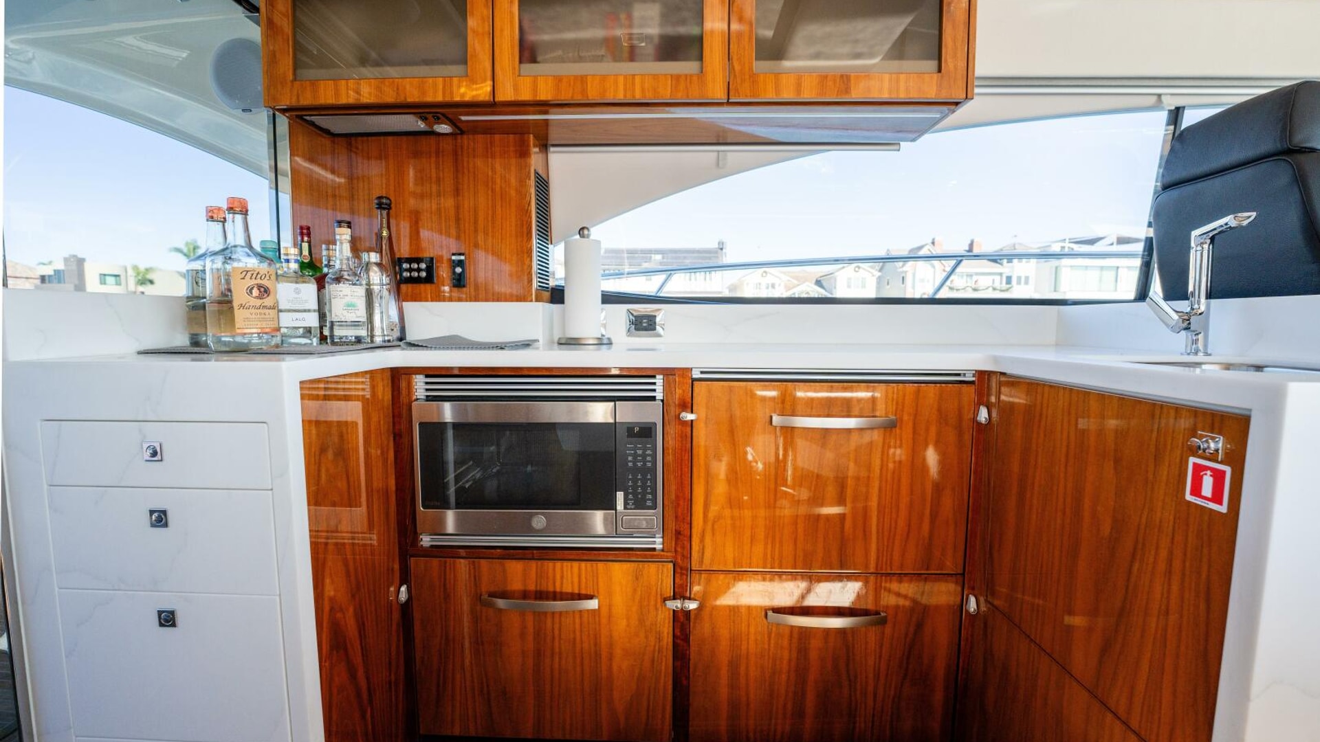 The galley was in the port aft quarter of the saloon area with a large dining area opposite. The chef was presented with a two-hob induction cooktop and a combined convection/microwave under-bench oven with drawer fridge and freeze. A drawer dishwasher was an option.