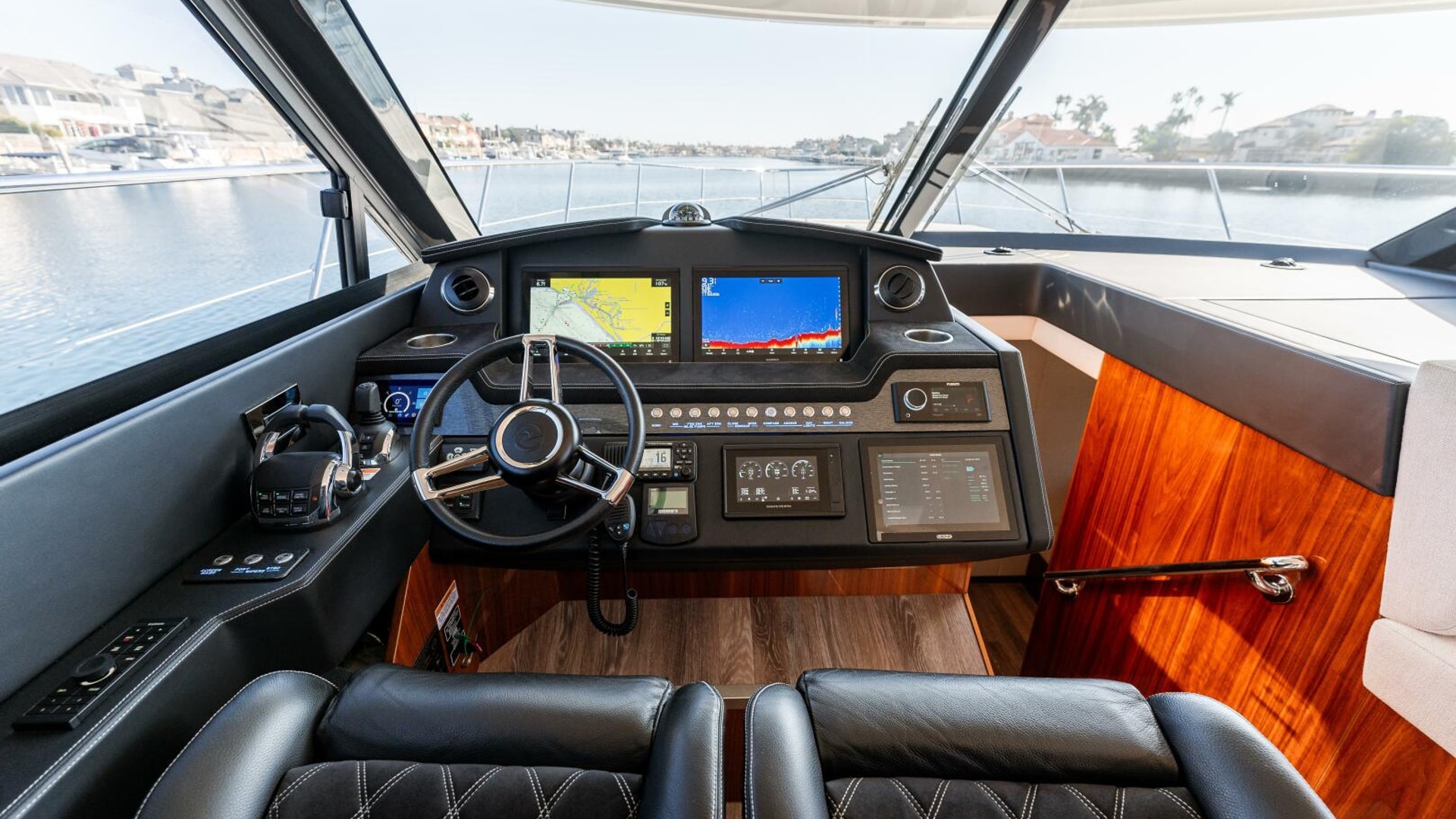 The helm: exciting and innovative ultimately sport motor yachting is all about taking command at the helm and what a command station Riviera have purpose designed in the Series II. The console gleams with world class instrumentation in sporty black and silver grey. Slide into the plush Recaro (with alcantara inserts) captain’s chair and feel immediately at home. The leather and chrome steering wheel feels good to the touch, as does the joystick to your left, offering great control. Your confidence surges. If you can drive a luxury modern car, you can command the 4800 Series II Platinum with ease. Everything you need to know is right in front of you on large multi-function touch screens Take i Volvo Penta Glass cockpit navigation display monitoring, full vessel control, steering and propulsion control. All at a glance.