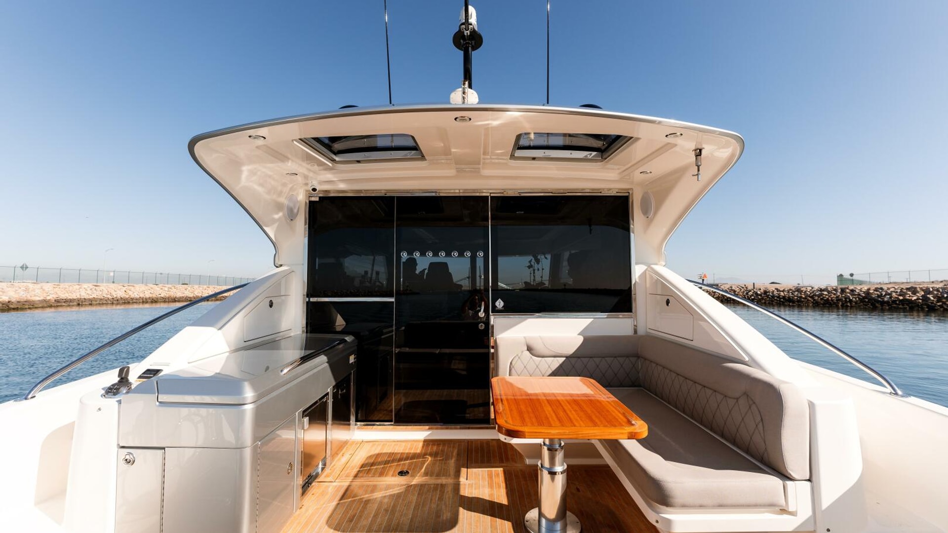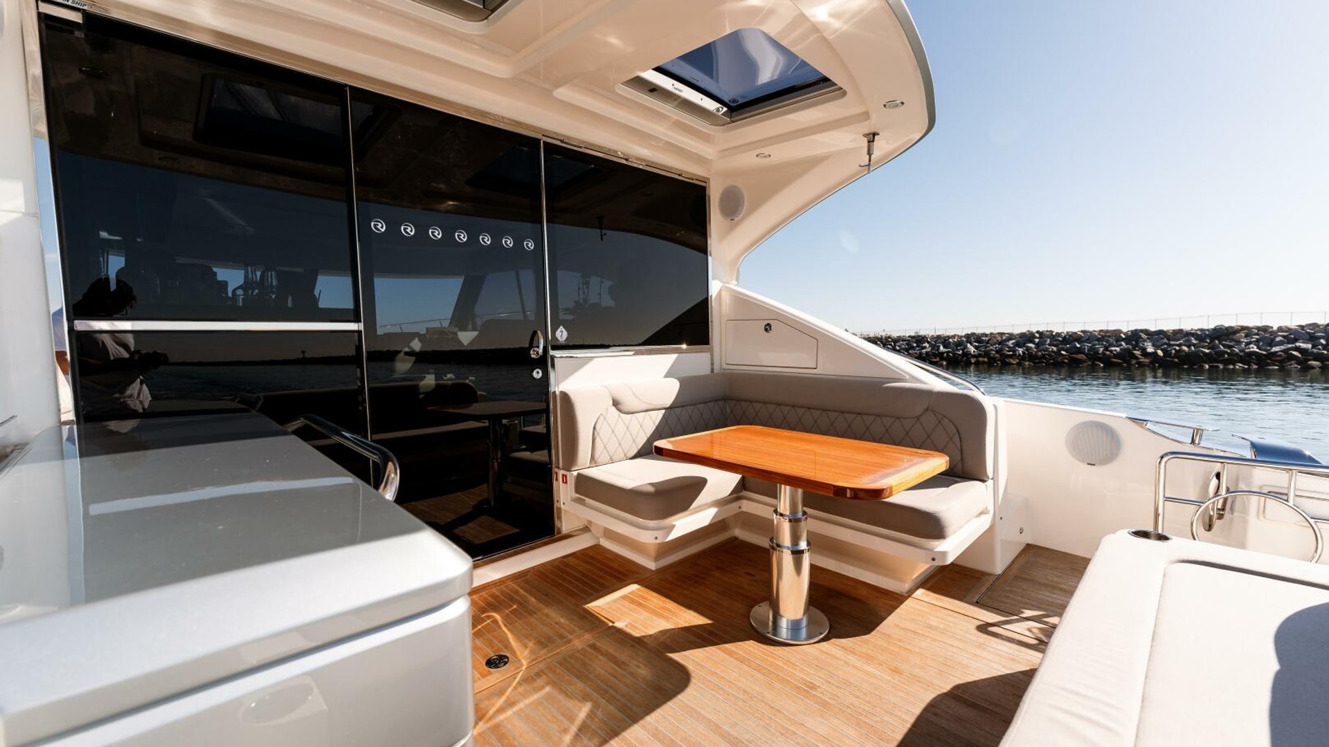 The cockpit includes a lounge across the transom, a timber dining table with L-shape lounge to starboard and a wet bar to port, including fridge, freezer and sink. An awning window and sliding glass door linked this space with the interior.