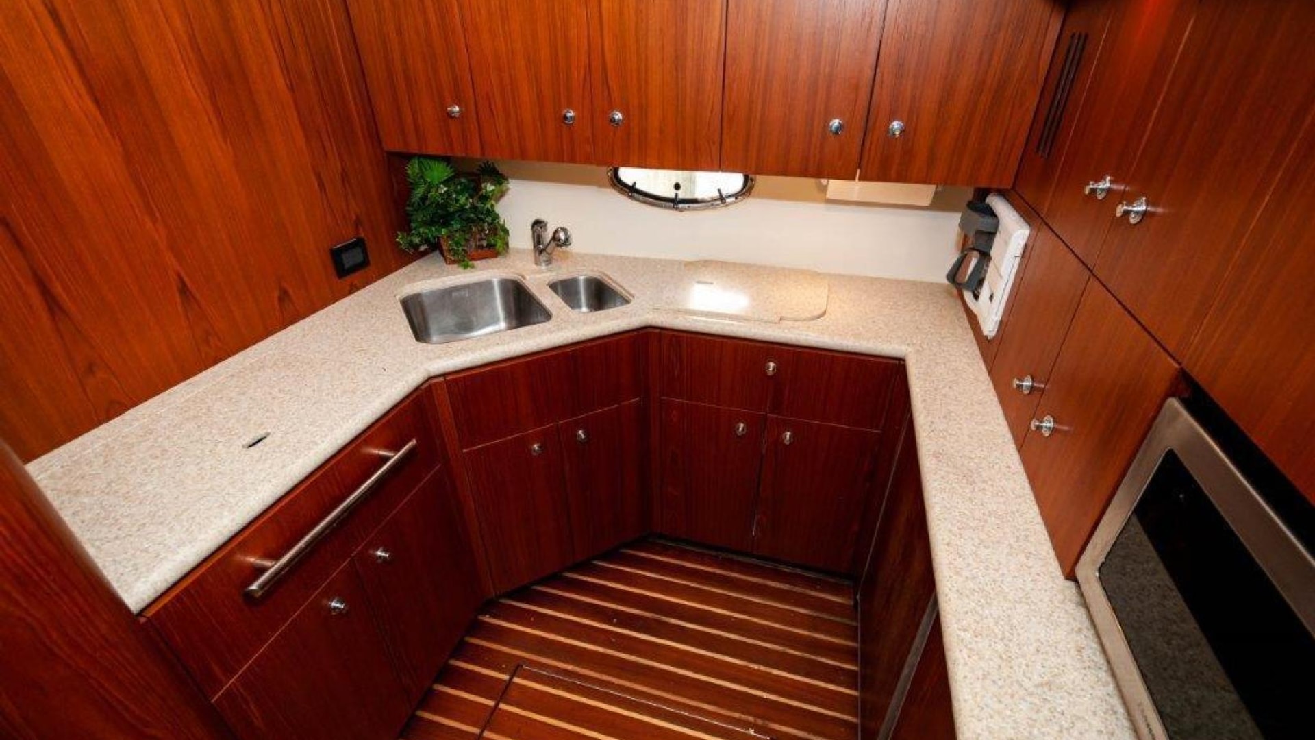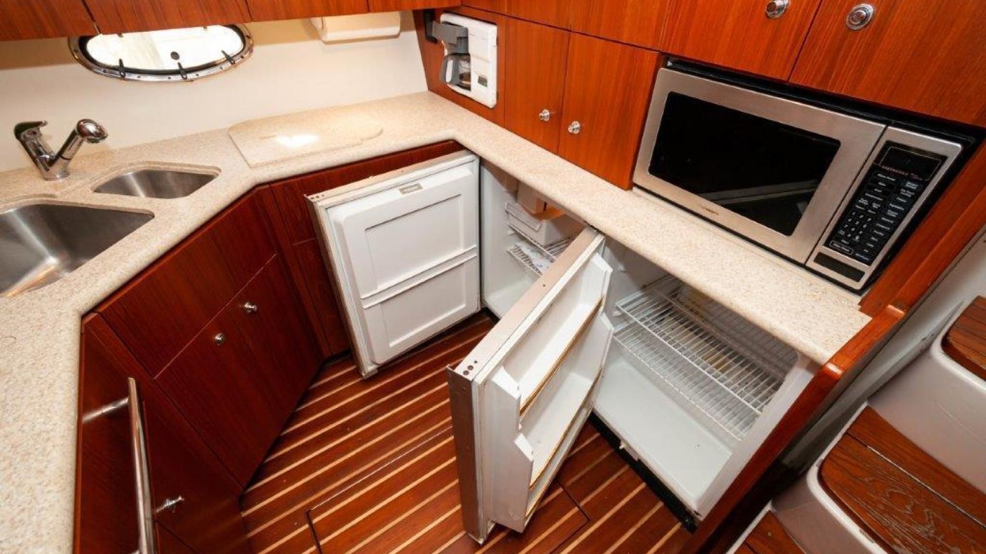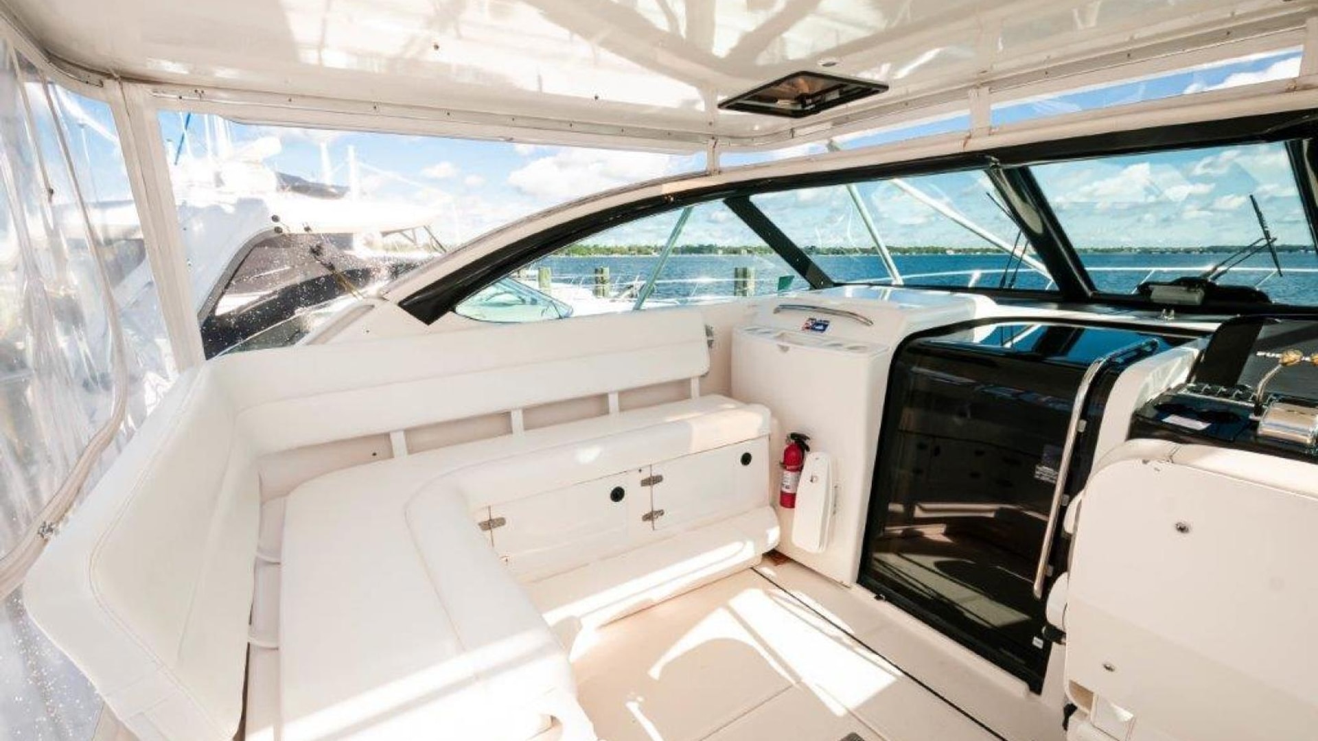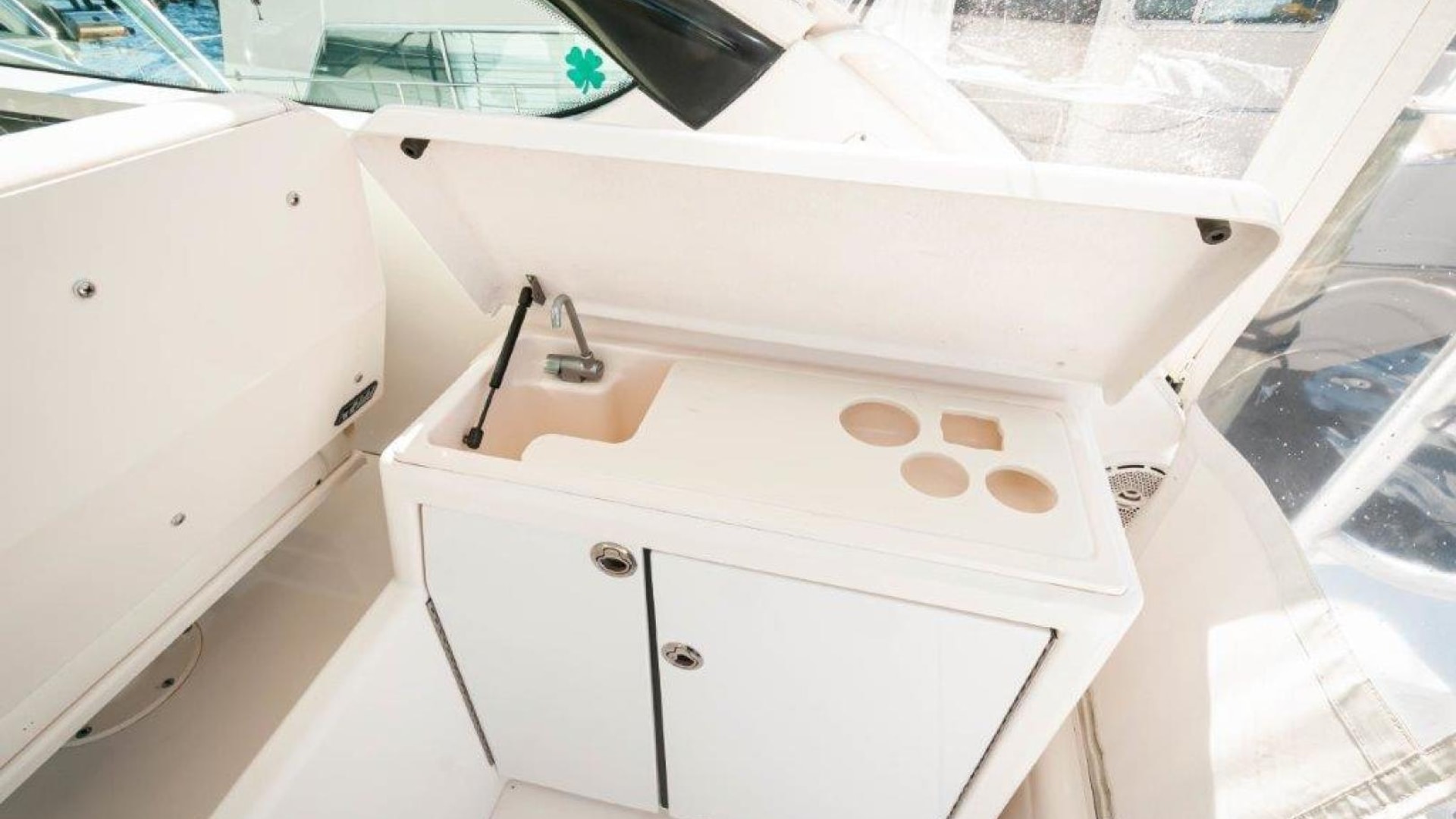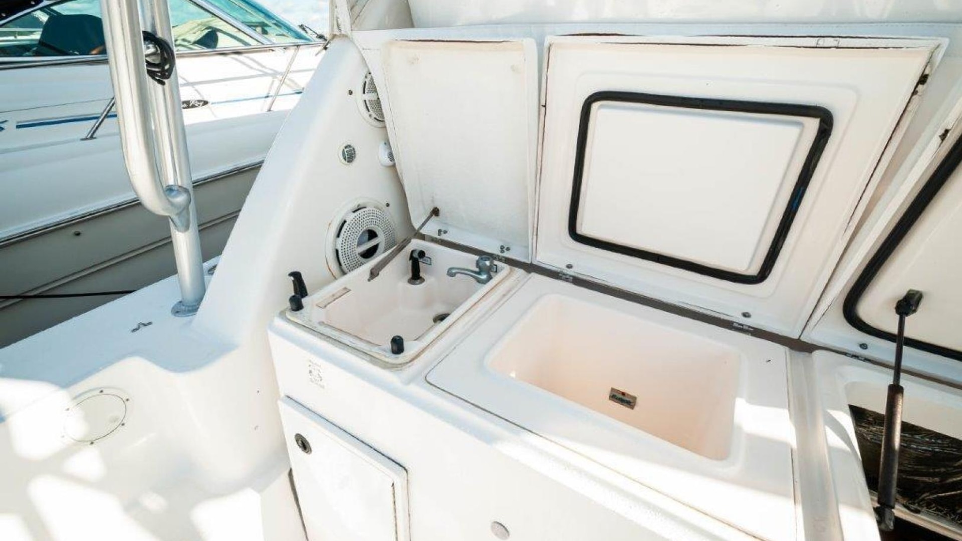 - Upper cockpit wet bar with sink, cutting and insulated cooler aft