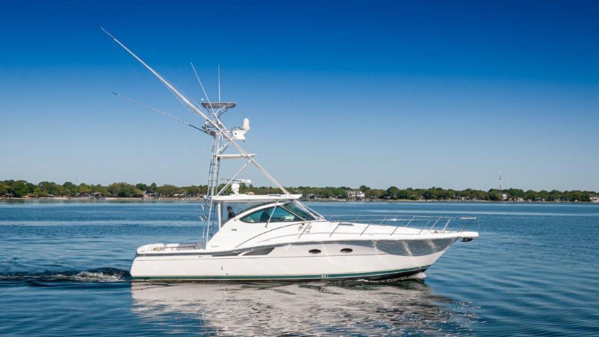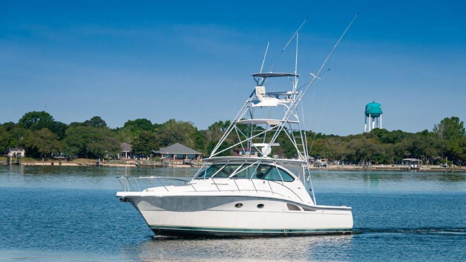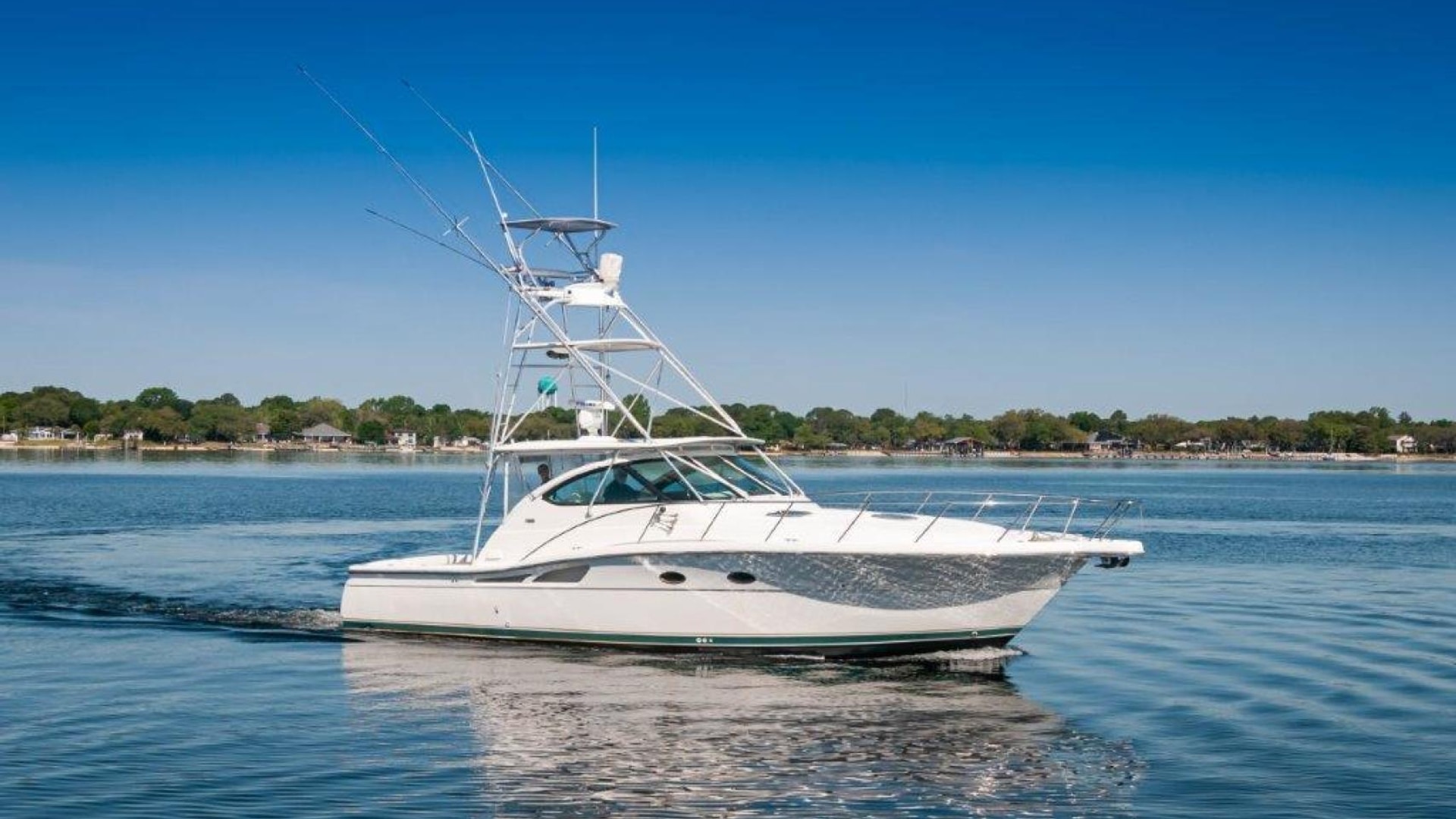 2003 42 Tiara Yachts 4200 Open Boat KINGFISHER for sale- In Boating the term "Convertible" means a boat that can be versatile enough that it can be fished or cruised equally well. Tiara's Express/ Opens were called "Crossover" boats which have the same meaning and have long been regarded as some of the best boats for doing both. The 4200 Open is a shining example. She is built on a steep deadrise modified-V hull with prop pockets and a wide 14-foot, 11-inch beam. The 4200's spacious 85-square-foot cockpit with coaming bolsters, fresh and raw water wash downs, storage boxes, and fold-away rear seat- is also factory rigged for fishing with an optional livewell and bait prep station. The added bonus of a full tuna tower on the "Kingfisher" makes this model a serious fishing platform and adds substantial value to the vessel! The upgraded Caterpillar C12s (715 hp each) give the boat a respectable range with her 525 gallons of fuel and an optimal cruise of about 23 knots and burning an economical 35-37 GPH! "Kingfisher" has the popular "Plan A" configuration. The below deck accommodations are airy and expansive. The lounge to port converts into a berth for two and has a great view of the flat-screen TV to starboard. The back of the lounge forms a Pullman berth for one more. To starboard, the galley features the optional teak and maple sole.