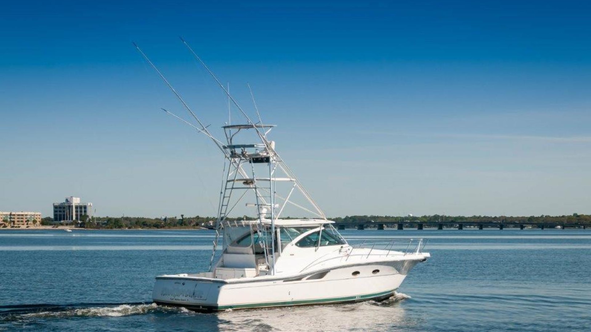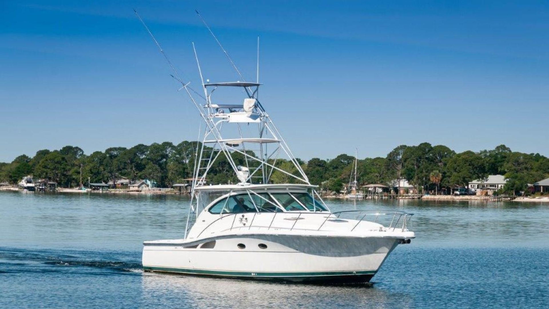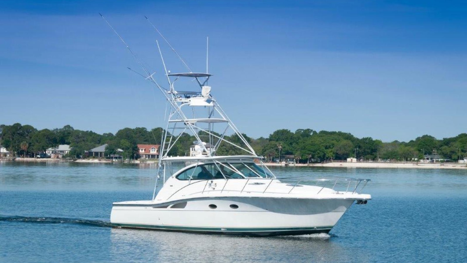 2003 42 Tiara Yachts 4200 Open Boat KINGFISHER for sale- In Boating the term "Convertible" means a boat that can be versatile enough that it can be fished or cruised equally well. Tiara's Express/ Opens were called "Crossover" boats which have the same meaning and have long been regarded as some of the best boats for doing both. The 4200 Open is a shining example. She is built on a steep deadrise modified-V hull with prop pockets and a wide 14-foot, 11-inch beam. The 4200's spacious 85-square-foot cockpit with coaming bolsters, fresh and raw water wash downs, storage boxes, and fold-away rear seat- is also factory rigged for fishing with an optional livewell and bait prep station. The added bonus of a full tuna tower on the "Kingfisher" makes this model a serious fishing platform and adds substantial value to the vessel! The upgraded Caterpillar C12s (715 hp each) give the boat a respectable range with her 525 gallons of fuel and an optimal cruise of about 23 knots and burning an economical 35-37 GPH! "Kingfisher" has the popular "Plan A" configuration. The below deck accommodations are airy and expansive. The lounge to port converts into a berth for two and has a great view of the flat-screen TV to starboard. The back of the lounge forms a Pullman berth for one more. To starboard, the galley features the optional teak and maple sole.
