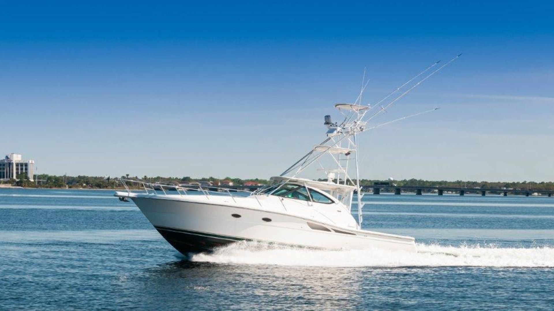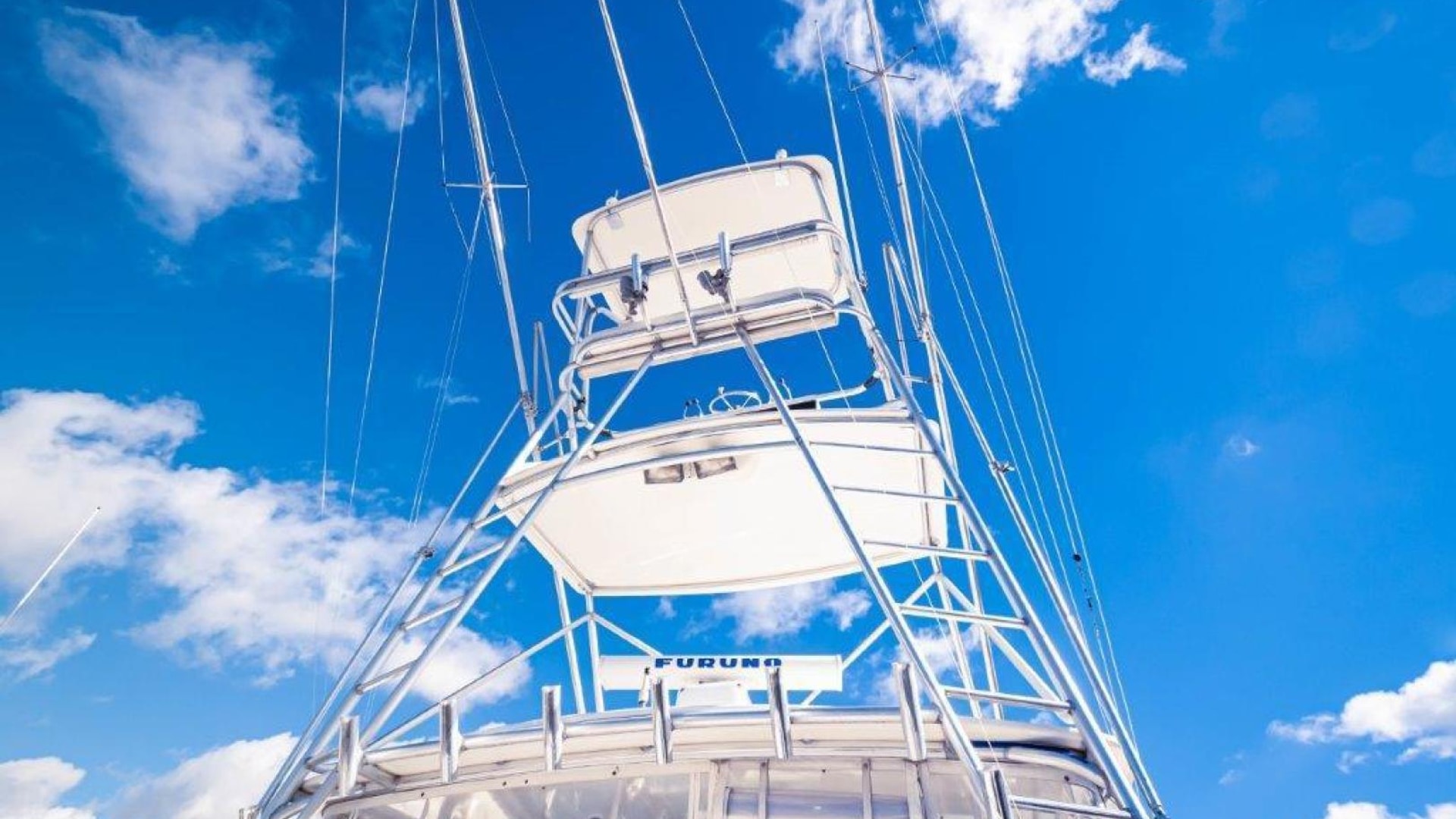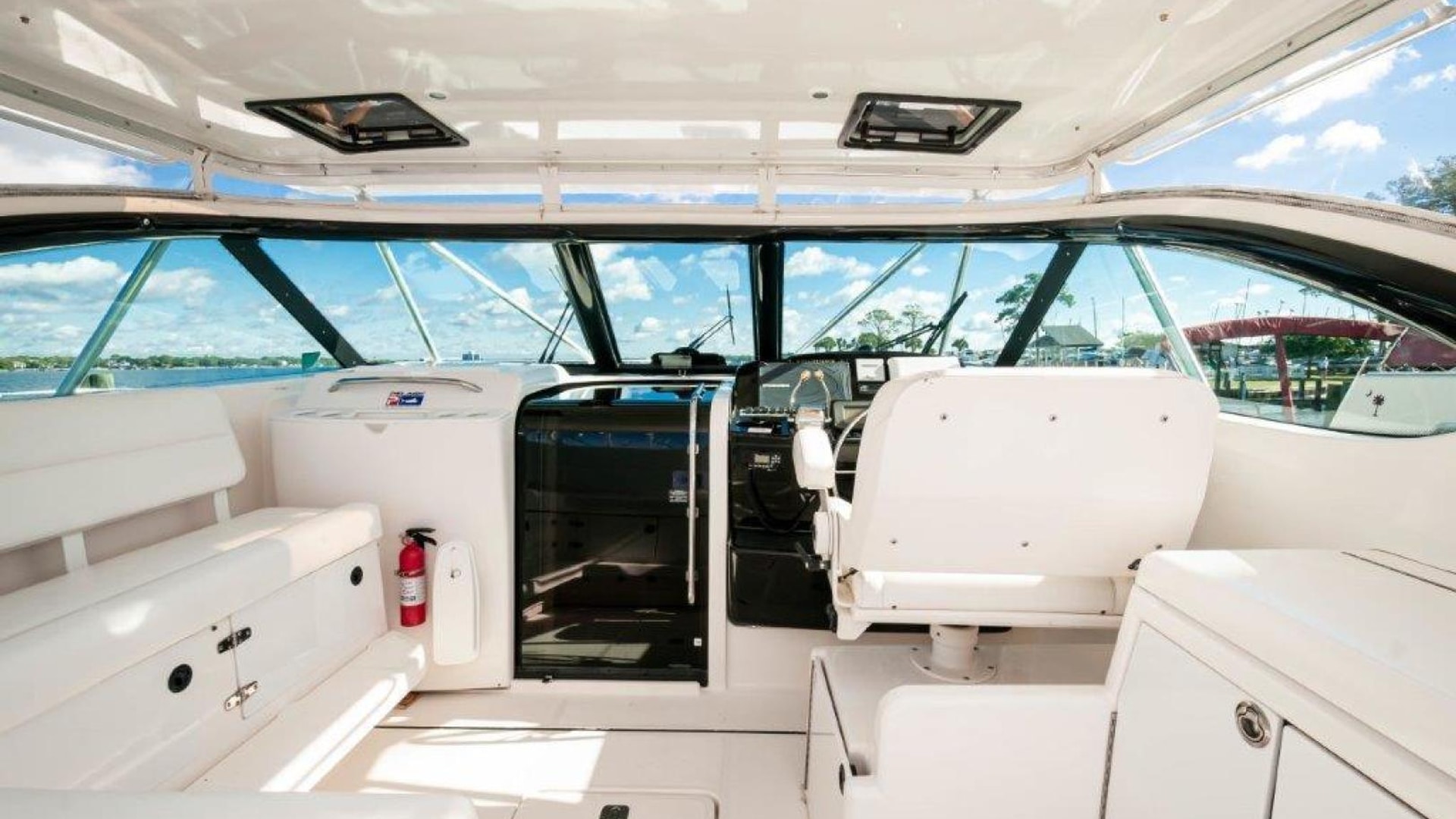 - Tiara custom composite windshield frame with tempered safety glass, safety handrails, power opening center section, and 3 washer/ wipers