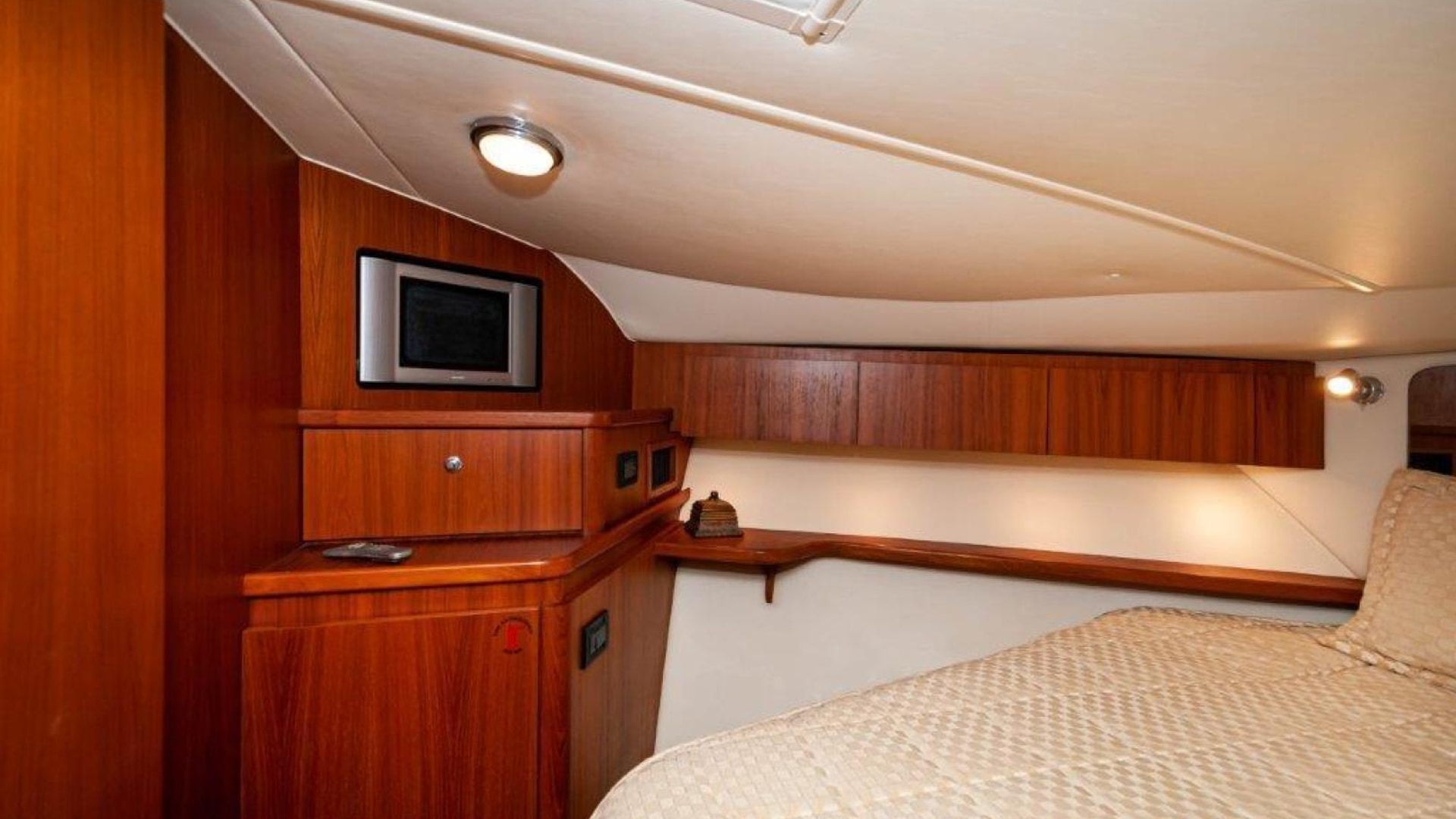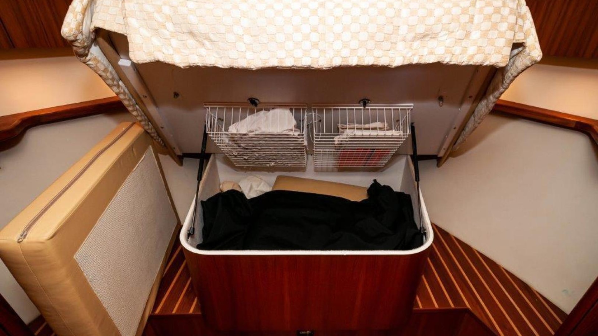 - Queen pedestal berth with innerspring mattress and storage below
