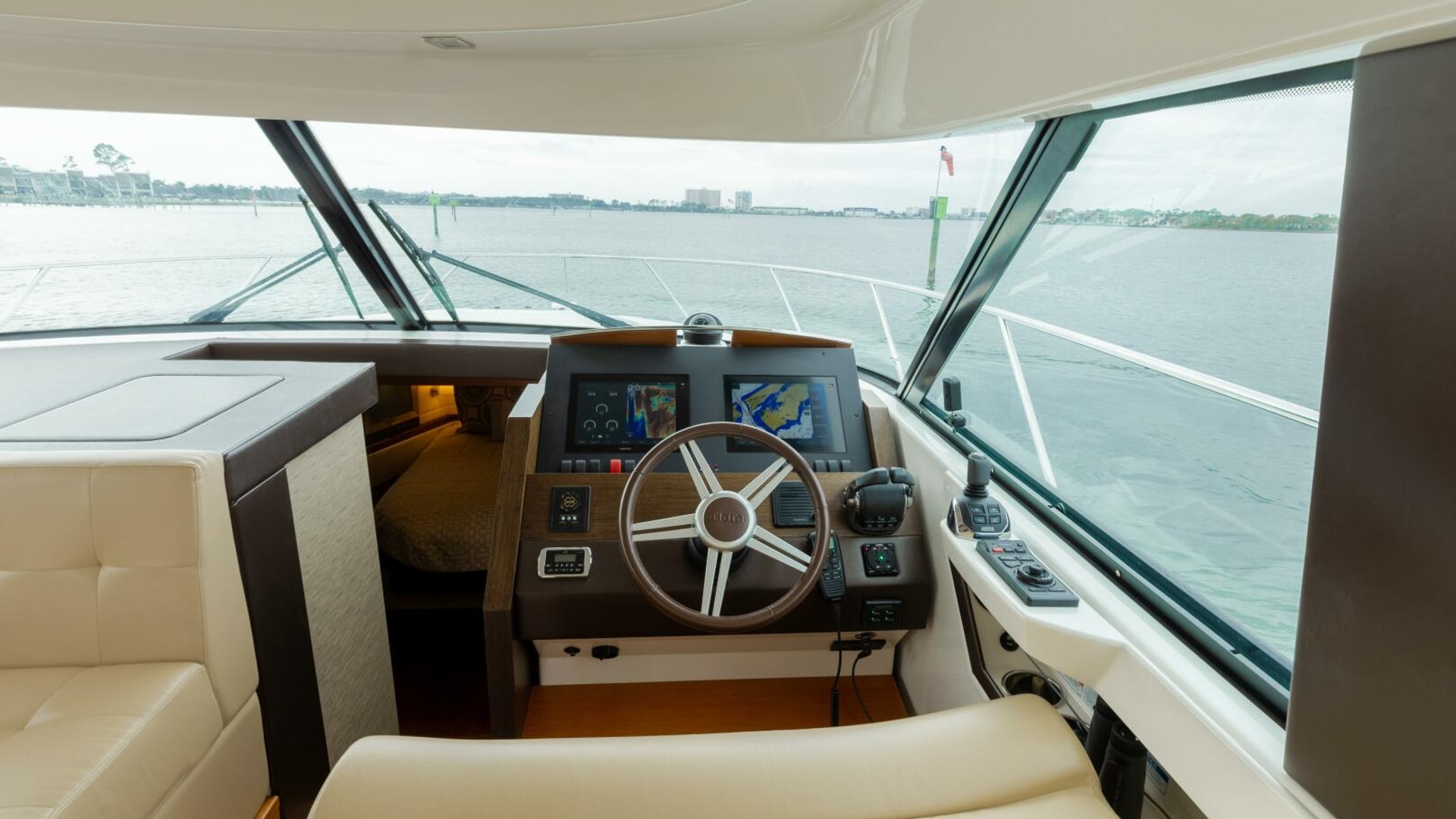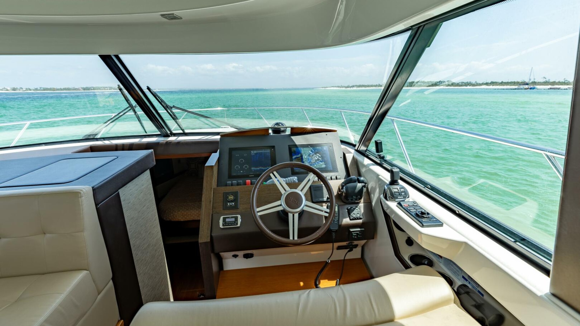- Helm with drink holders, 12V and 120V outlets, & 17.5" leather-wrapped steering wheel. Standard Volvo® Glass Cockpit integrated electronics package with Garmin® GRID remote aft of the helm joystick