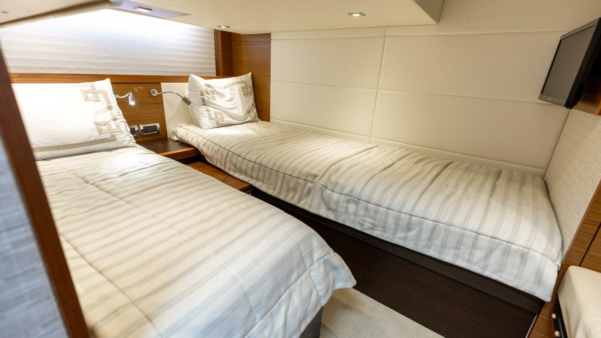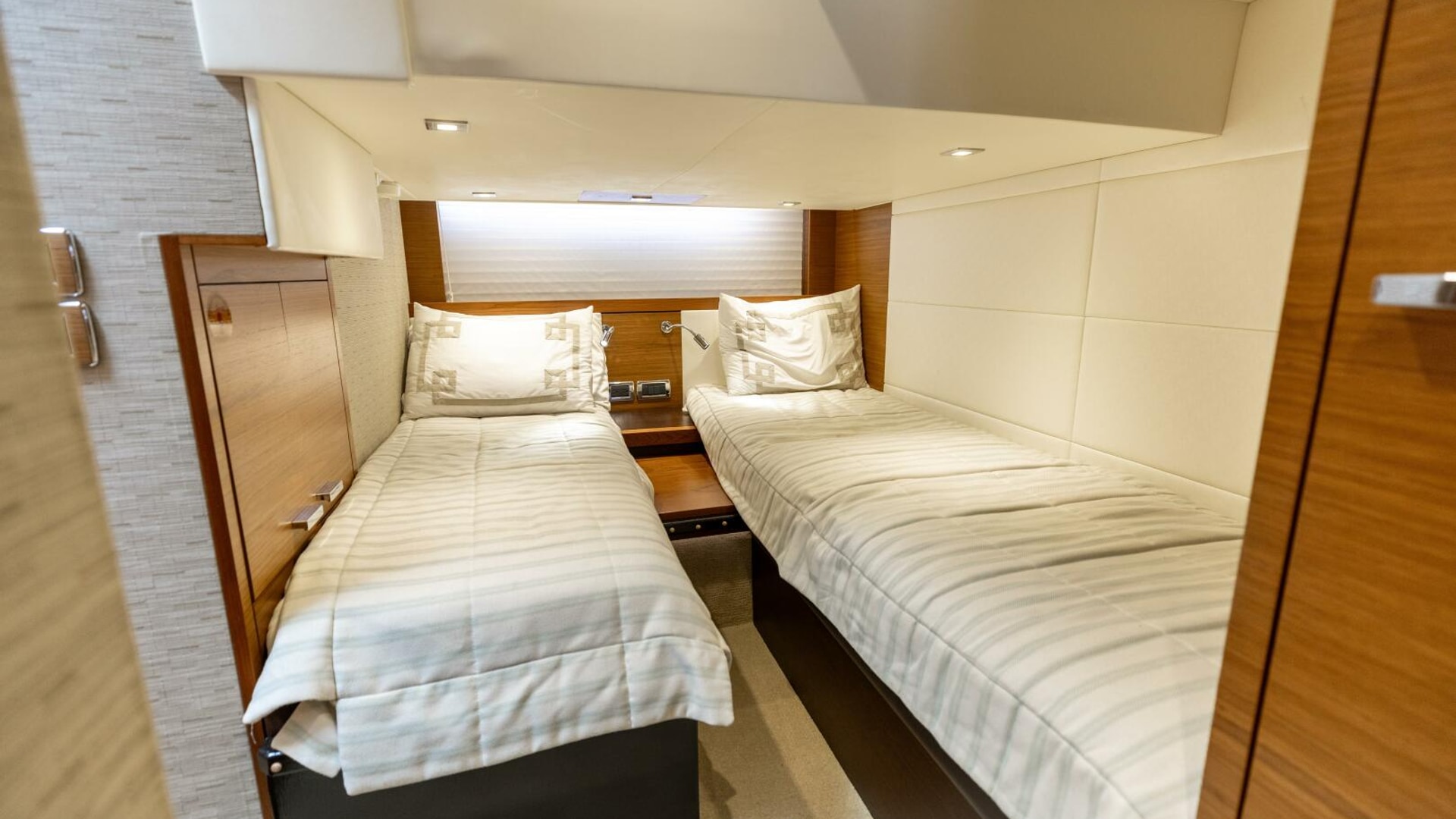 Twin berths with innerspring mattresses, upholstered headboard. Storage under forward berth. Includes a filler cushion for the mattresses.