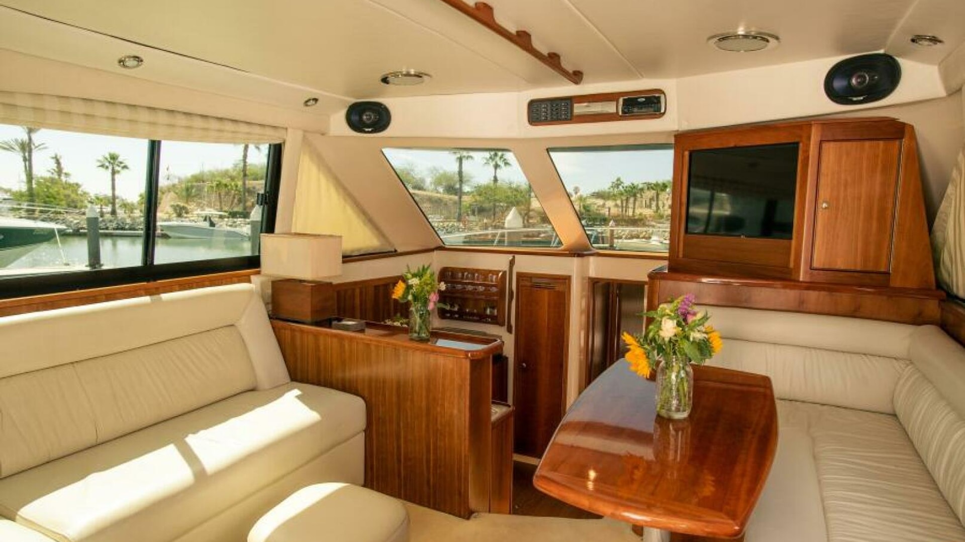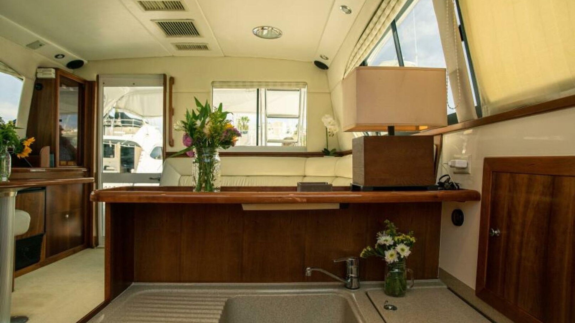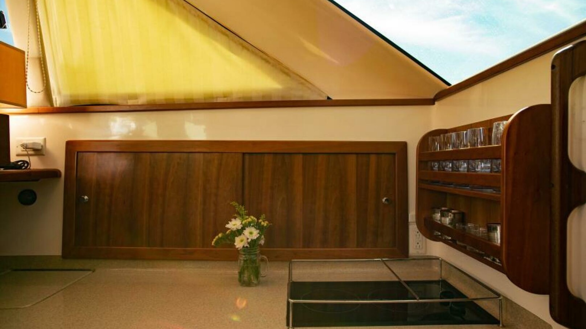 - Flybridge forward seating and bench seat fwd with rod storage and sink