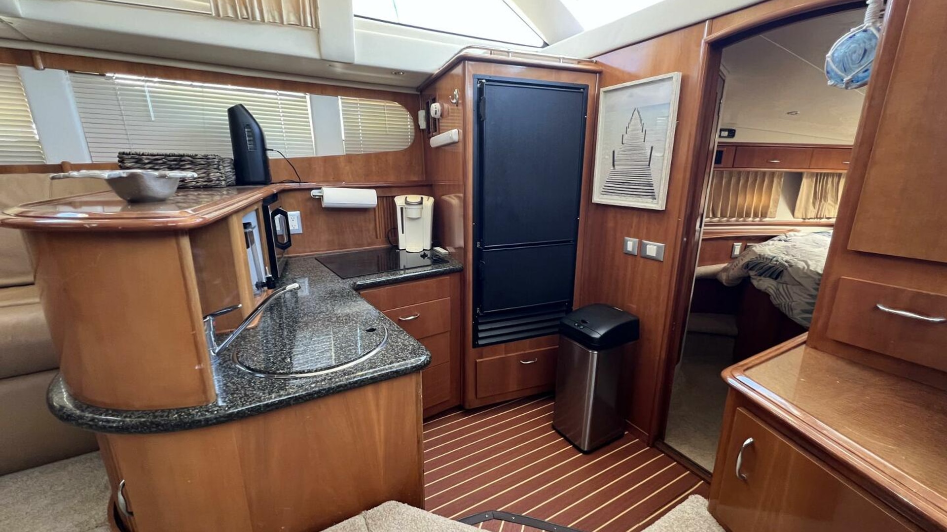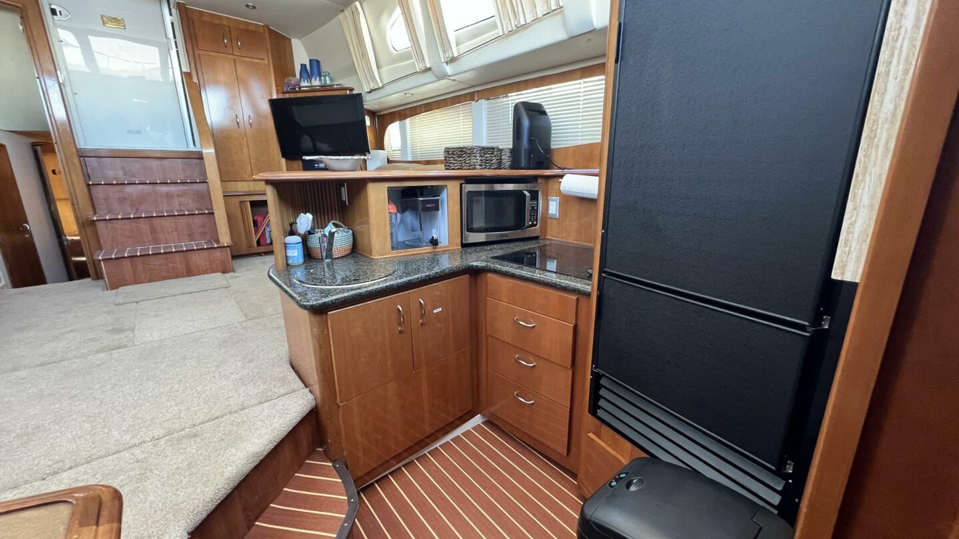 - Galley with full-size fridge, microwave, and ample storage
