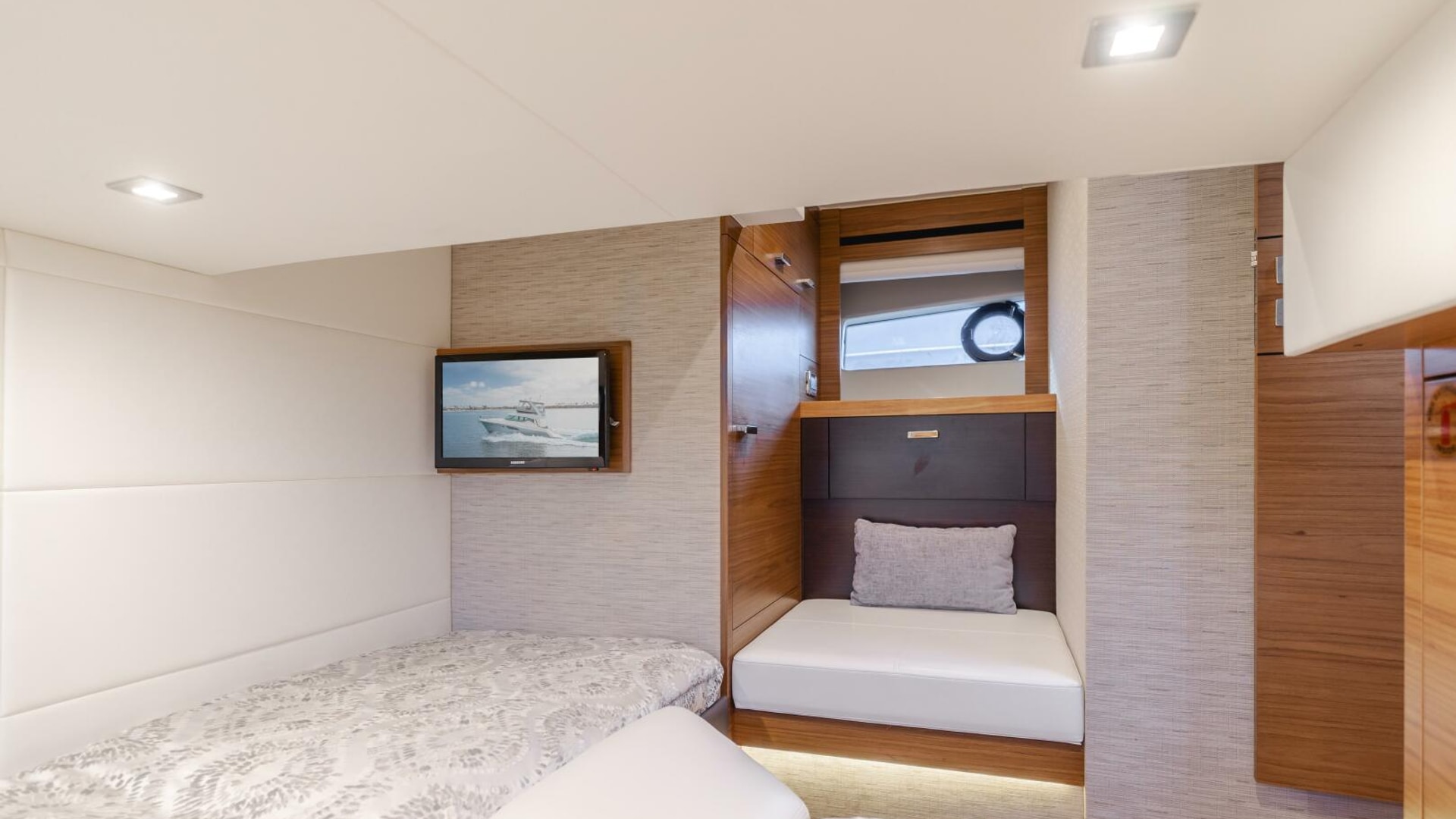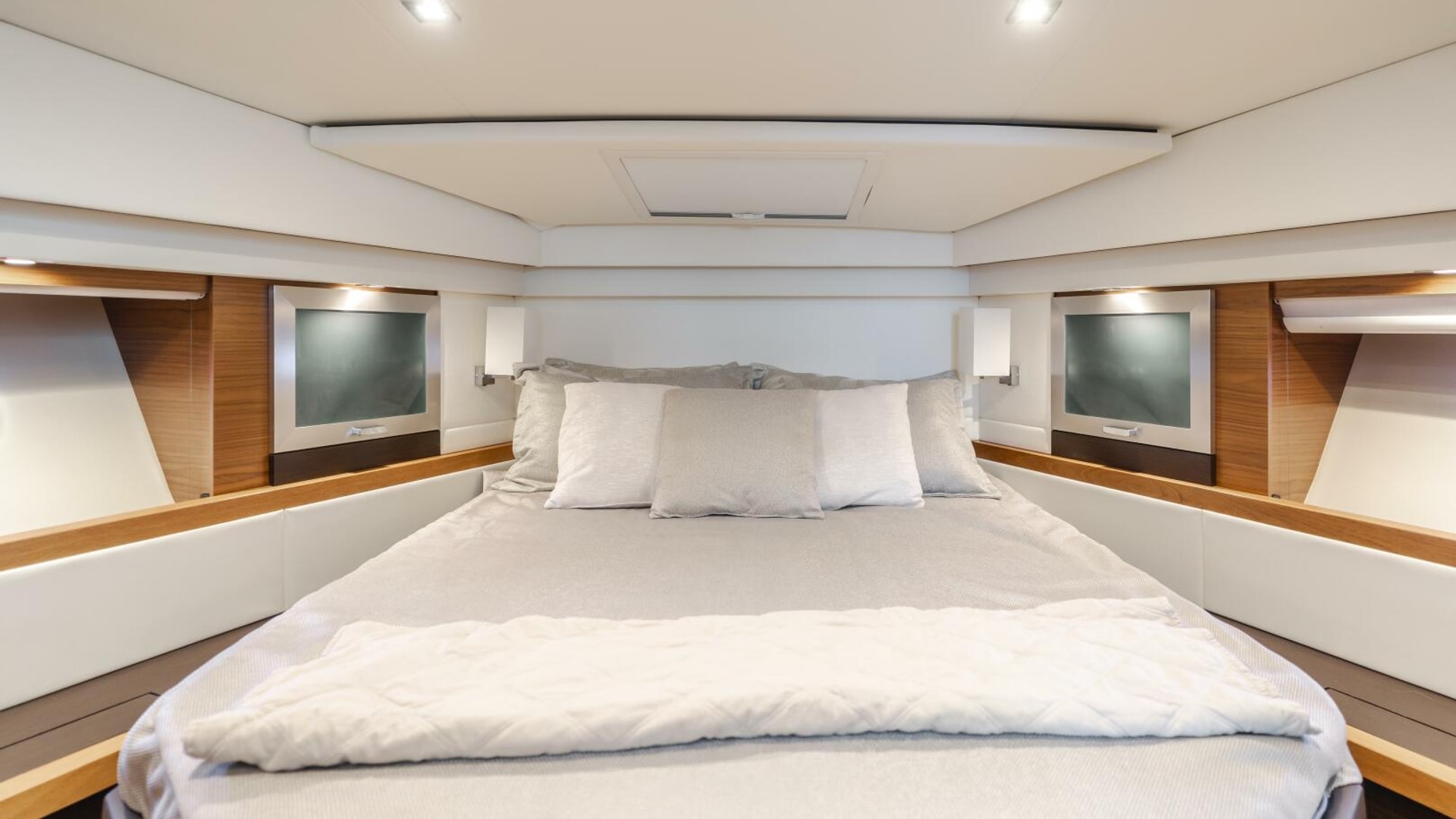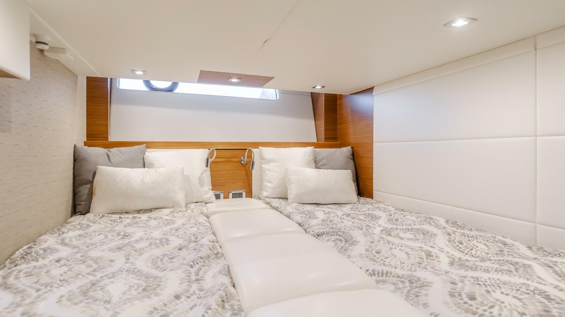 - Twin berths with innerspring mattresses, upholstered headboard, coverlets, pillow shams, and storage under forward berth. Includes filler cushions that are stored under the aft end of the forward mattress.