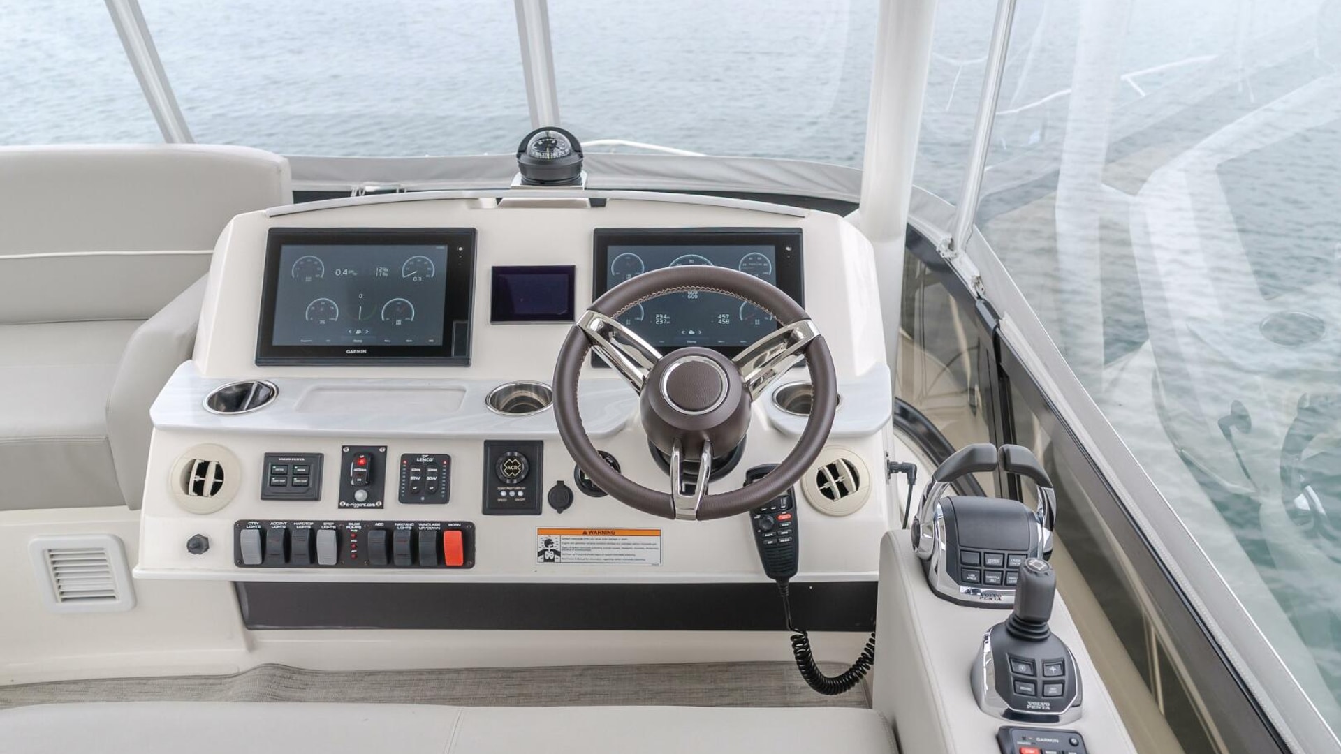 - Helm with drink holders, 12V and 120V outlets, & 17.5" leather-wrapped steering wheel. Standard Volvo® Glass Cockpit integrated electronics package