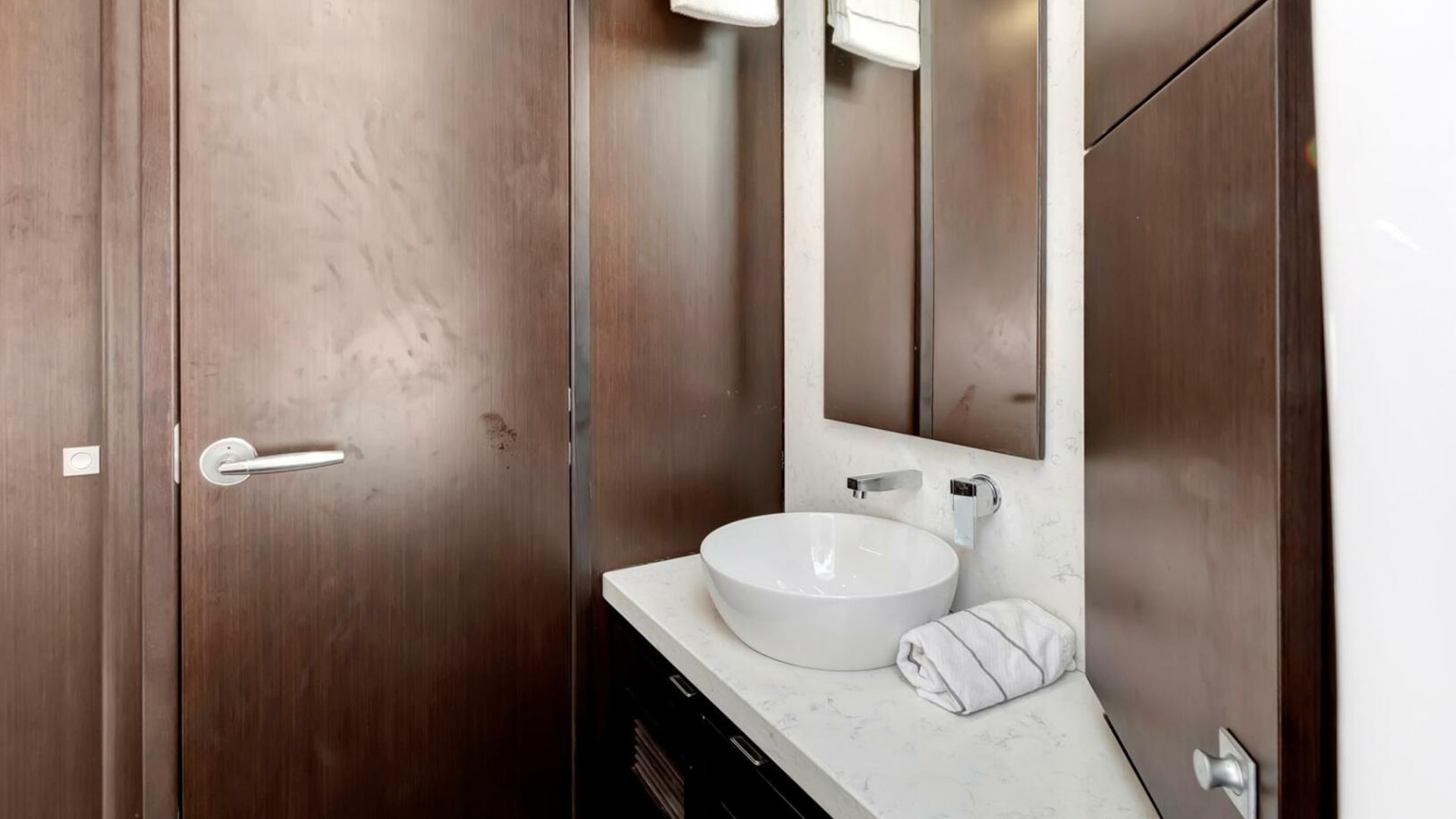- Separate vanity with quartz counter-top, vessel sink with pressurized hot and cold water, mirror and cabinet storage