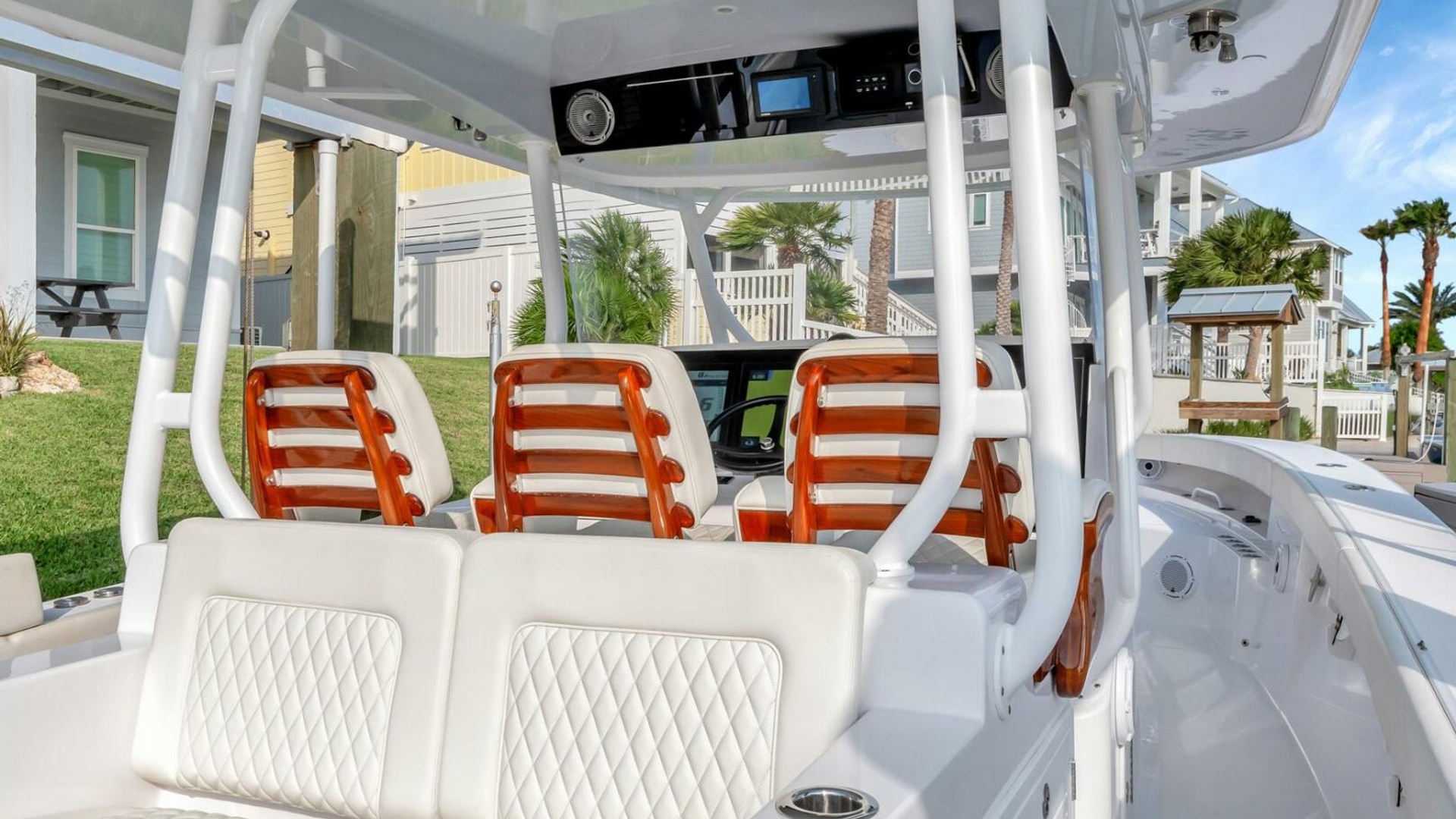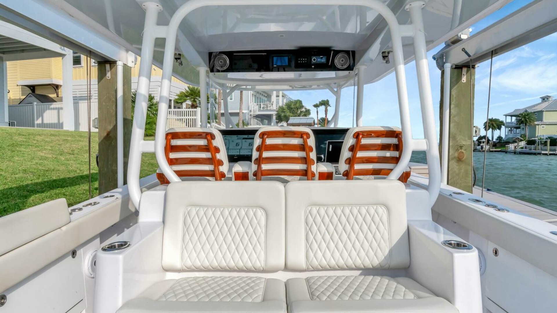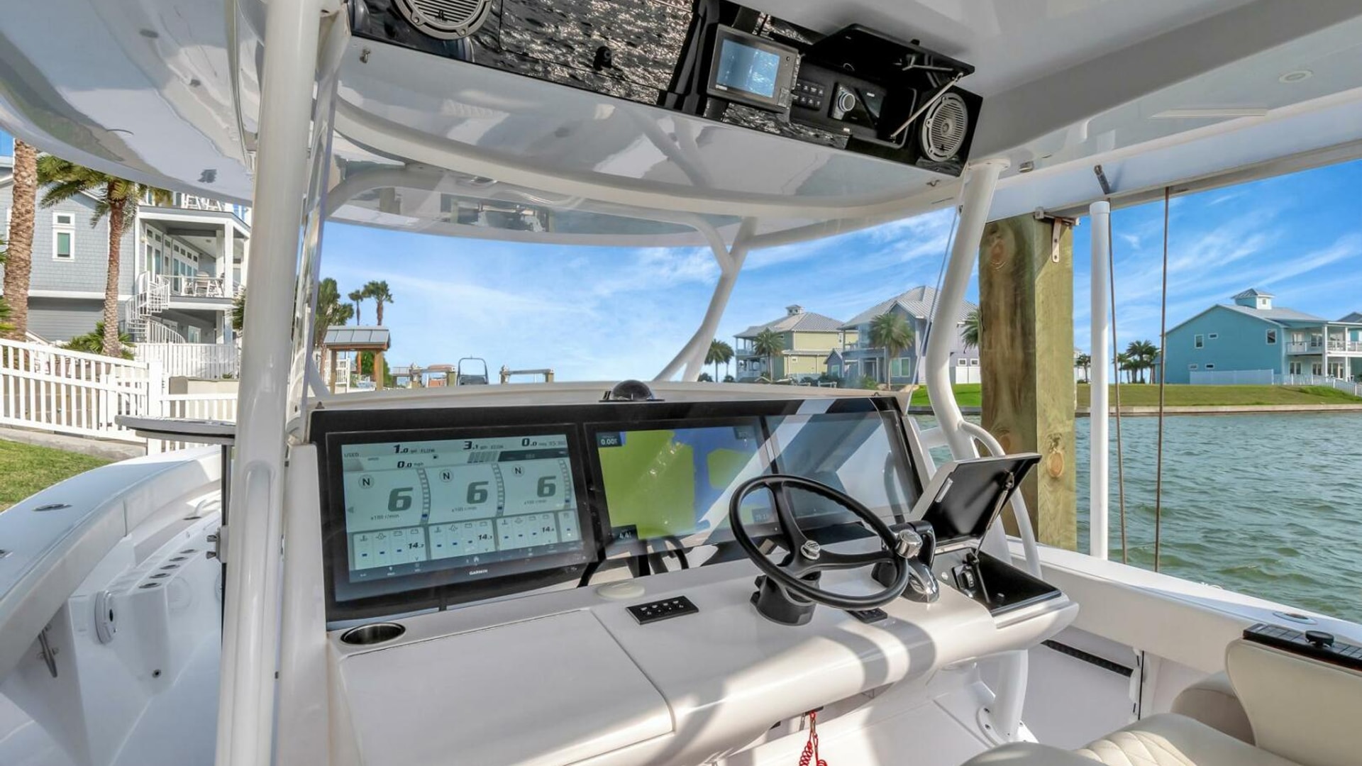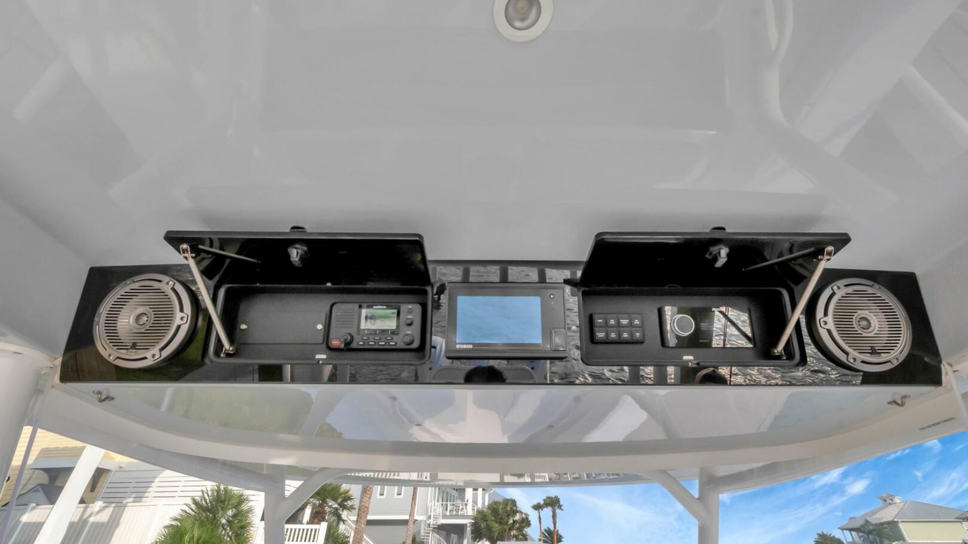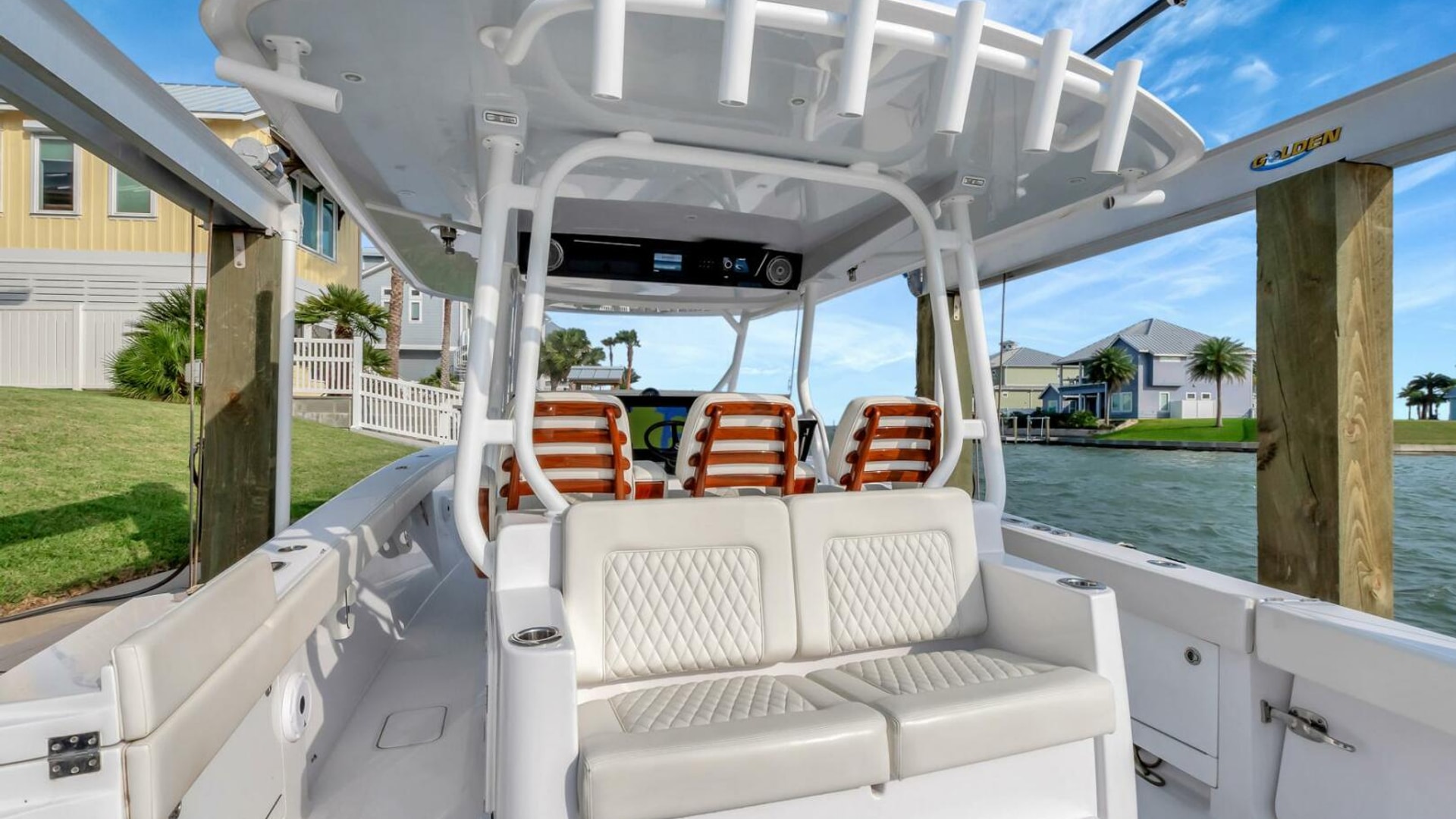 - Fiberglass T-Top built in aft support frame includes electronics box, overhead molded F/G, lumitec spectrum lighting in hardtop and (6) rod holders mounted aft