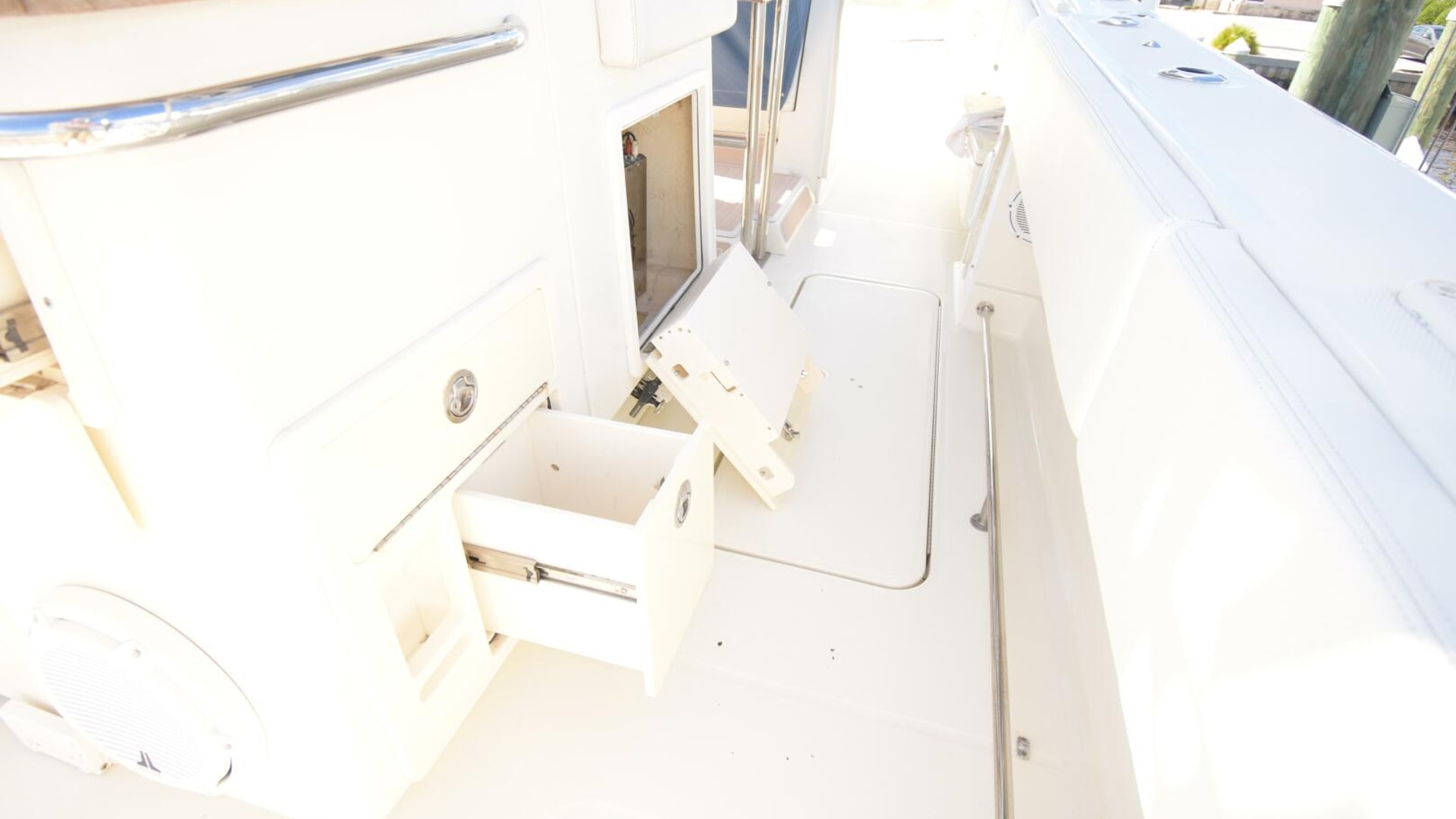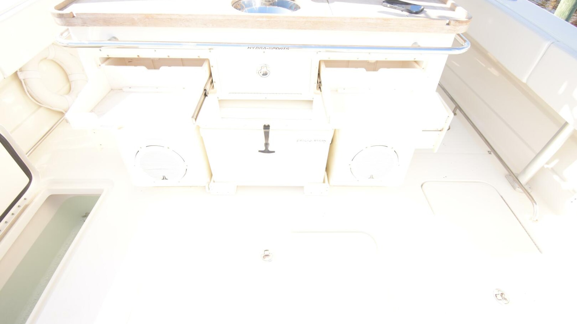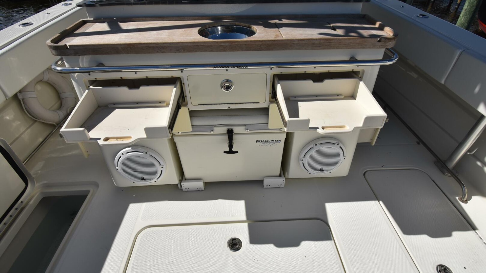 - Frigid Rigid drink boxes under gunwhale port and starboard are within reach of the helm