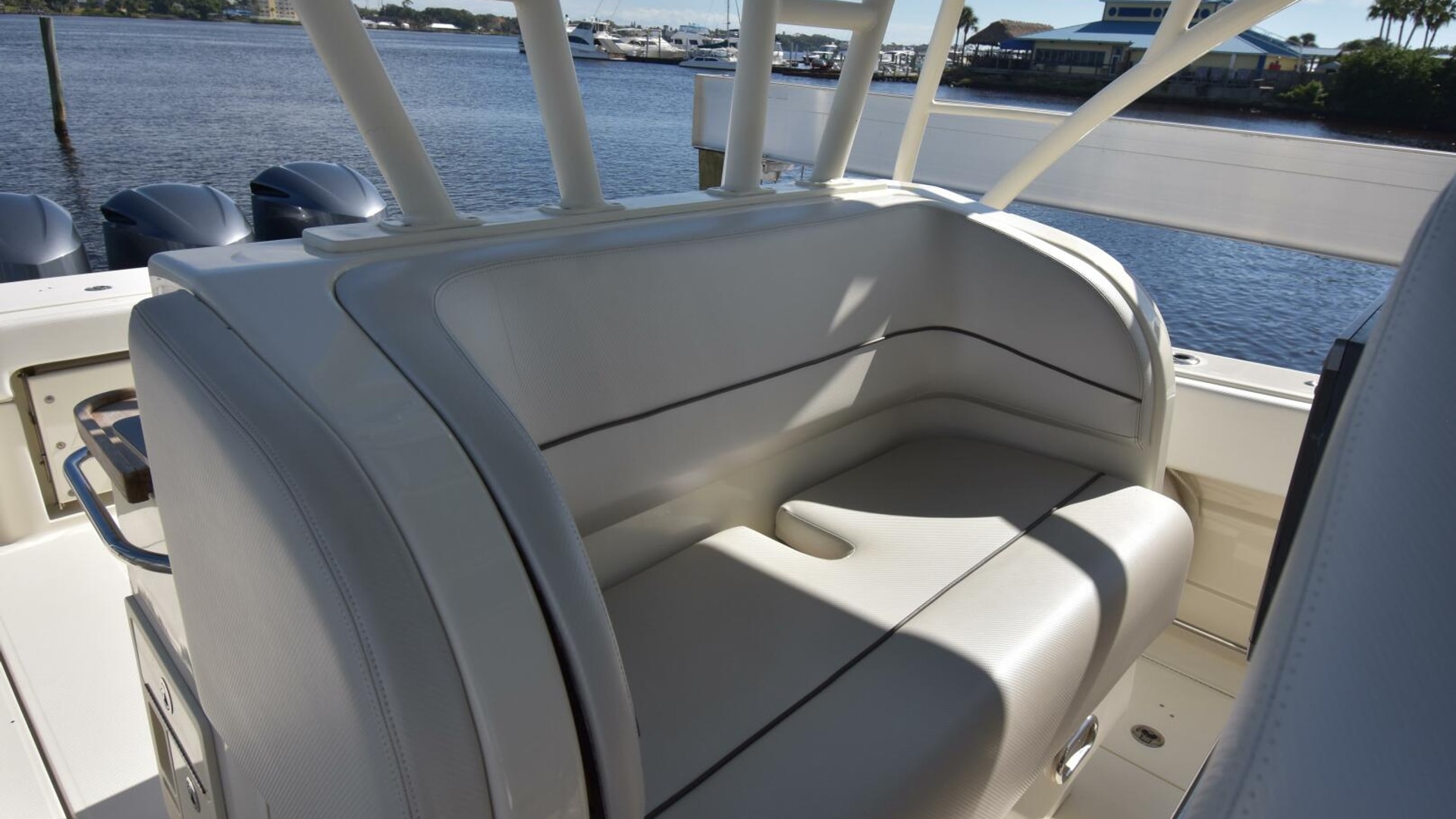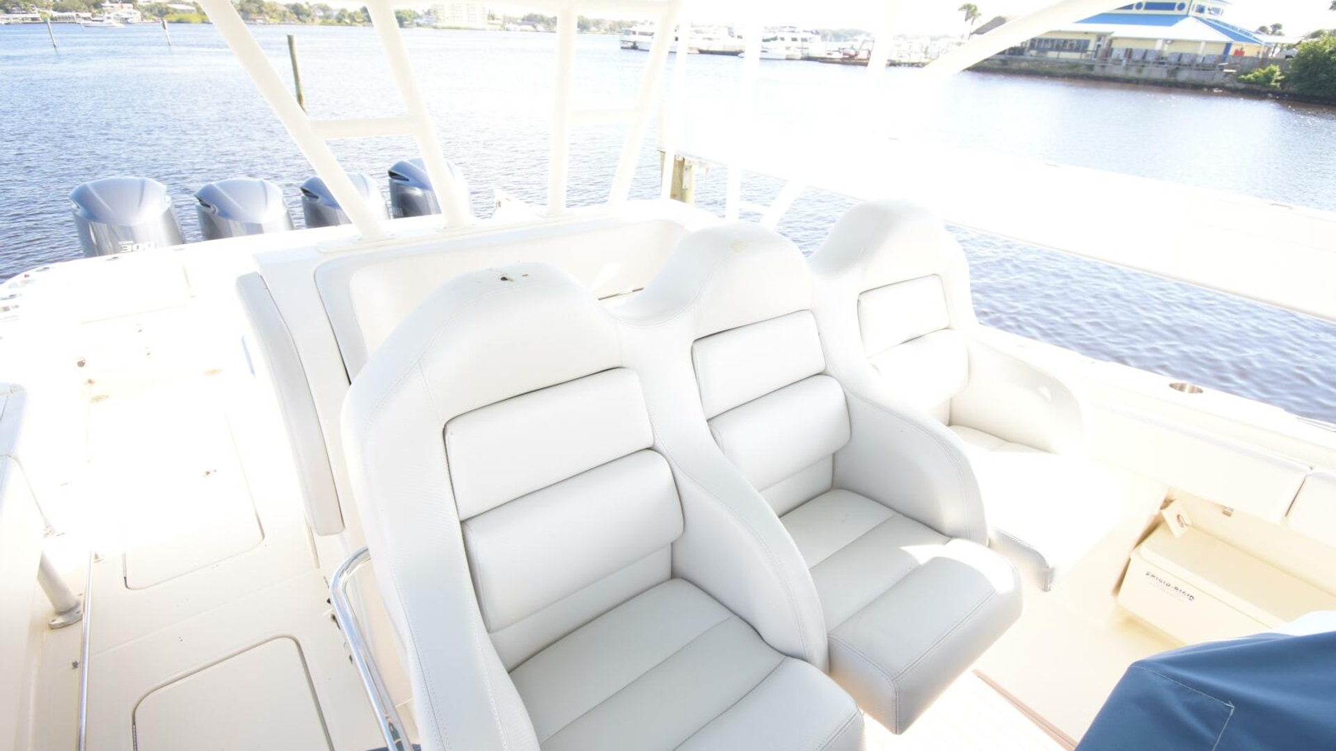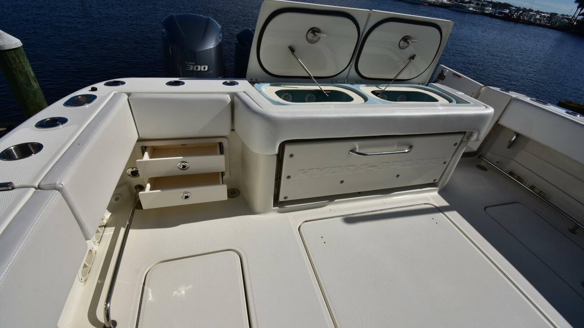 - Frigid Rigid drink boxes under gunwhale port and starboard are within reach of the helm