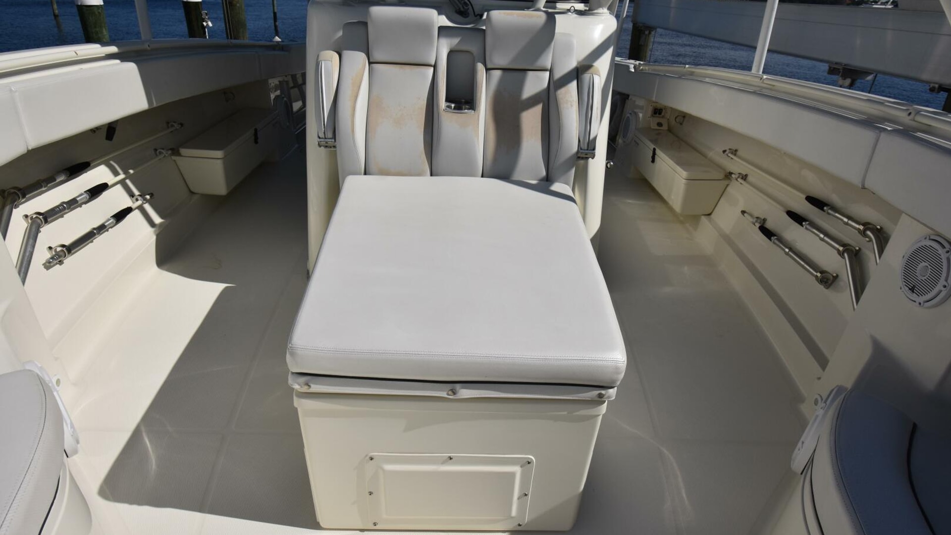 - Frigid Rigid insulated box with chill plates is forward of the console with sun pad cushion and backrest