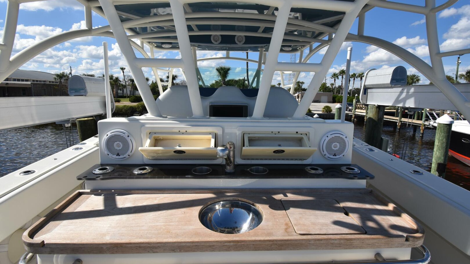 - Bait Prep Station with Teak Counter, SS Sink, Tackle Drawers, Pull Out Frigid Rigid Bait Cooler & Rod Holders