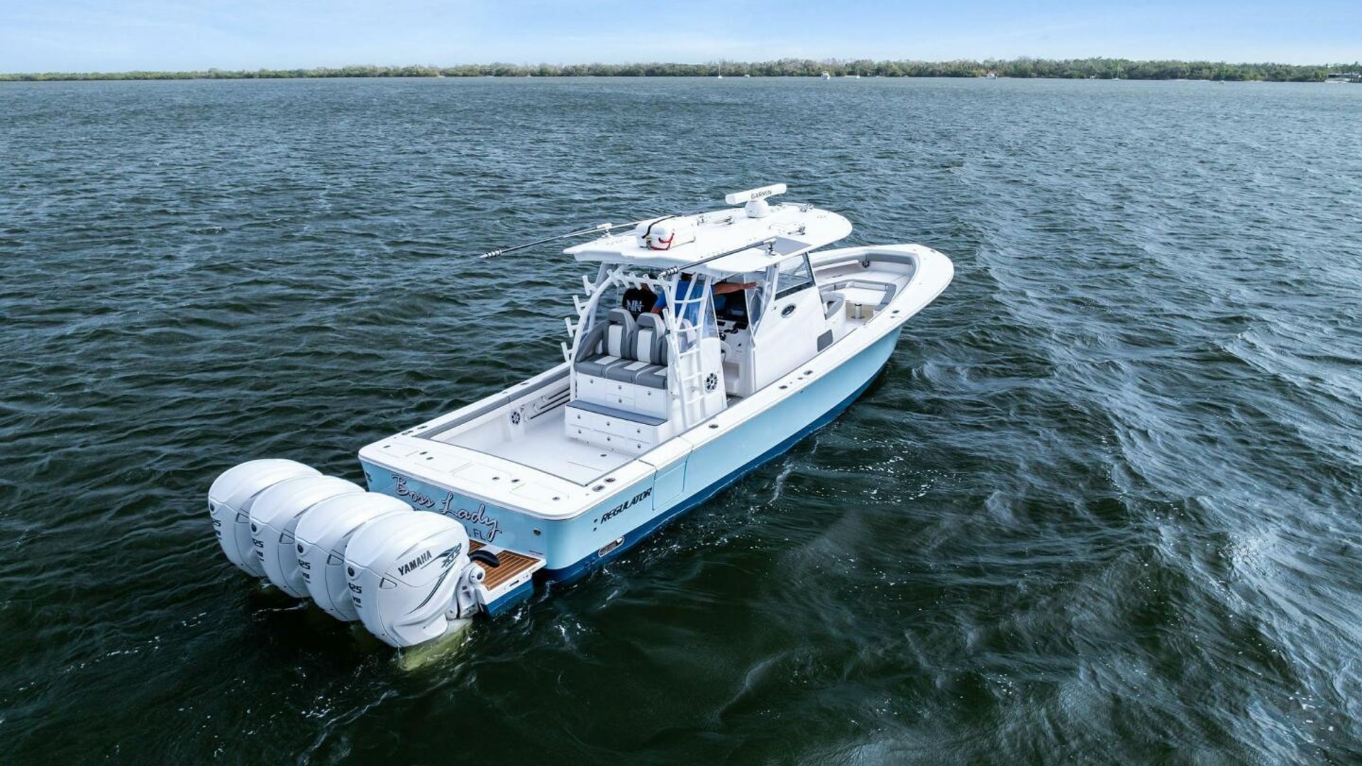 2023 41 Regulator Center Console 'Boss Lady' offers superior speed and ride perfect for getting to the fish or pulling up to a sandbar with family. Truly a luxury center console, she comes equipped with a Seakeeper 5, quad Yamaha 425 outboards with extended warranty, bow and cockpit sunshades, new batteries and full GOST system. She also has Gemlux Bluewater Outriggers, refrigerated transom fishbox, electric teaser reels, Viking Life Raft and more. Her cabin features a galley kitchen, double berth, removable floor and spacious head with shower. She has been dealer-maintained since new with services every 100 Hours for Engines, Seakeeper & Generator. Don't miss this stunning Carolina Blue center console -- come see 'Boss Lady' today!