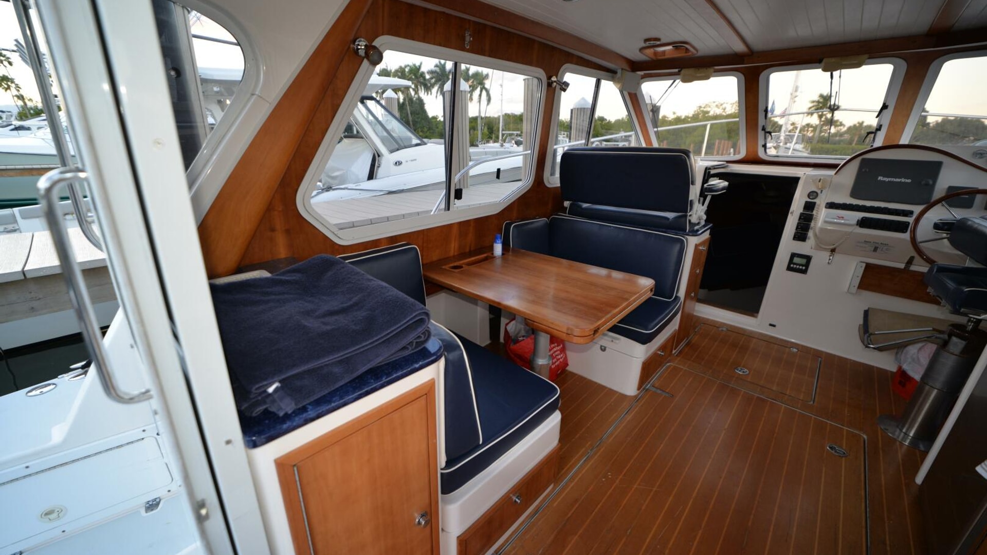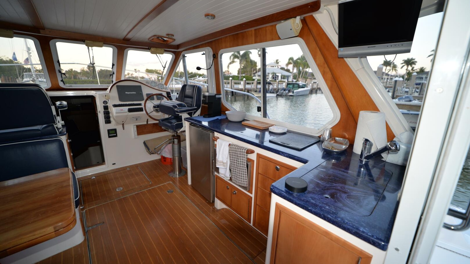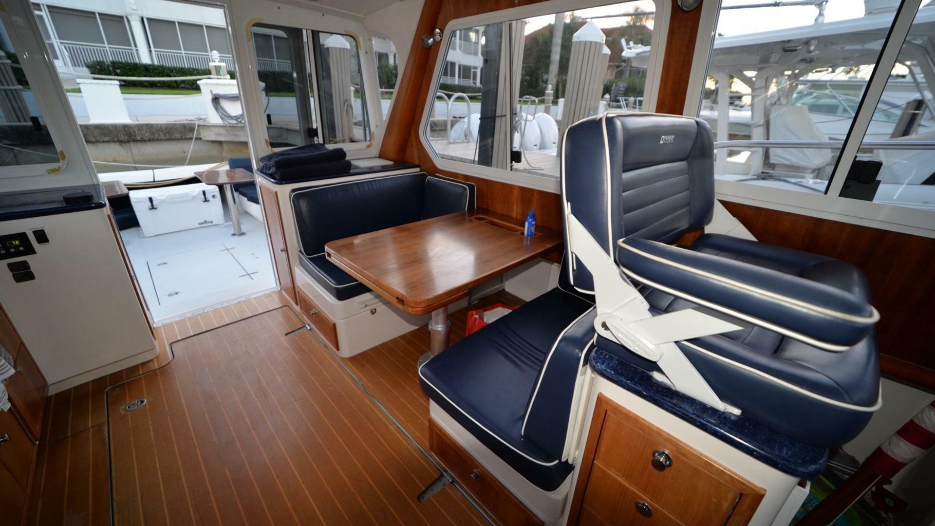- Pilothouse: Semi-enclosed with aft galley (stove, fridge, microwave), helm station, and convertible dinette