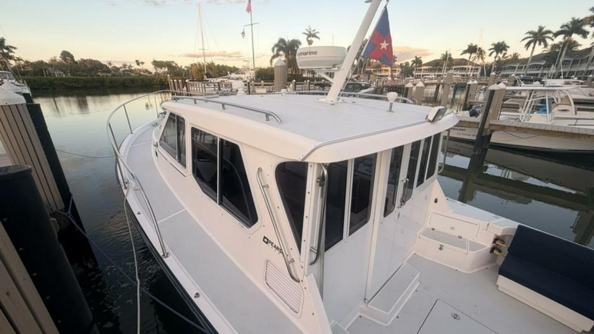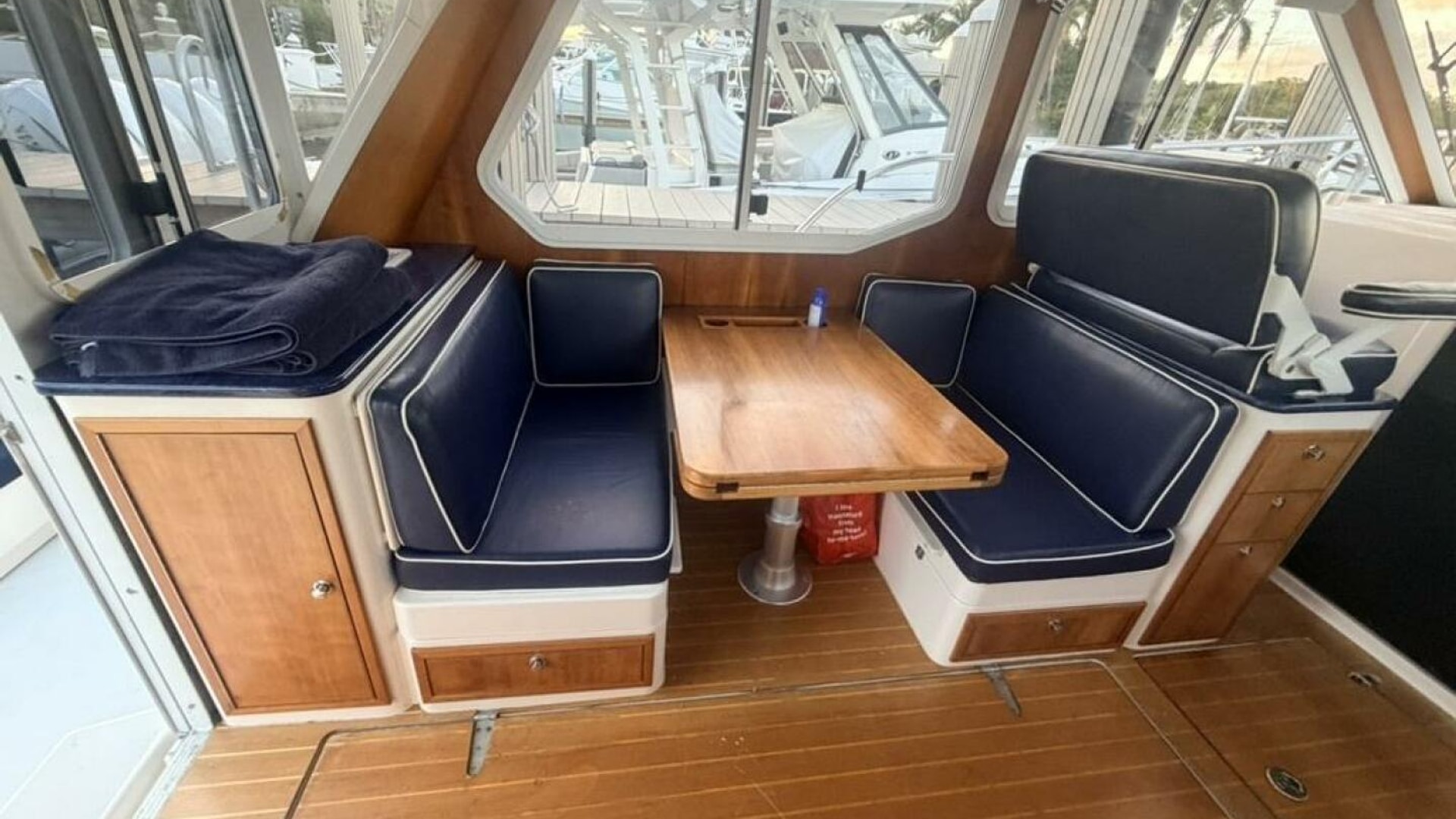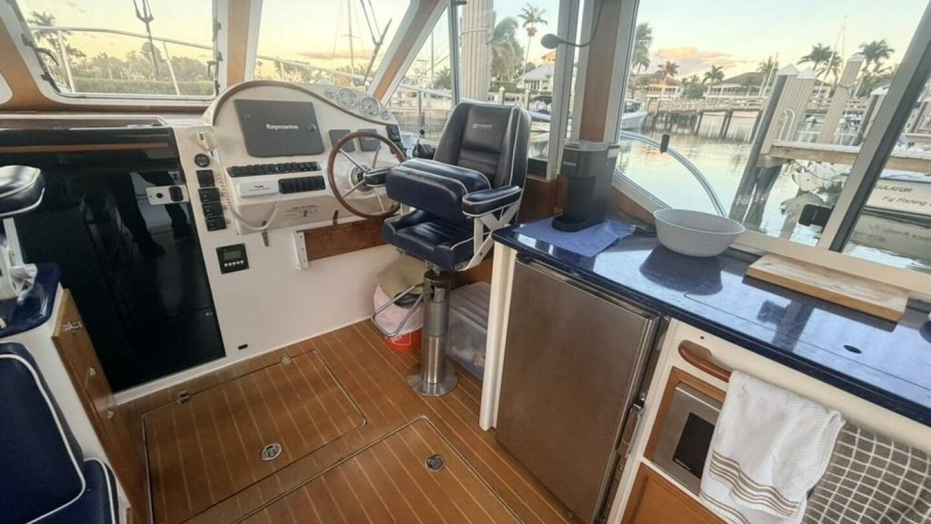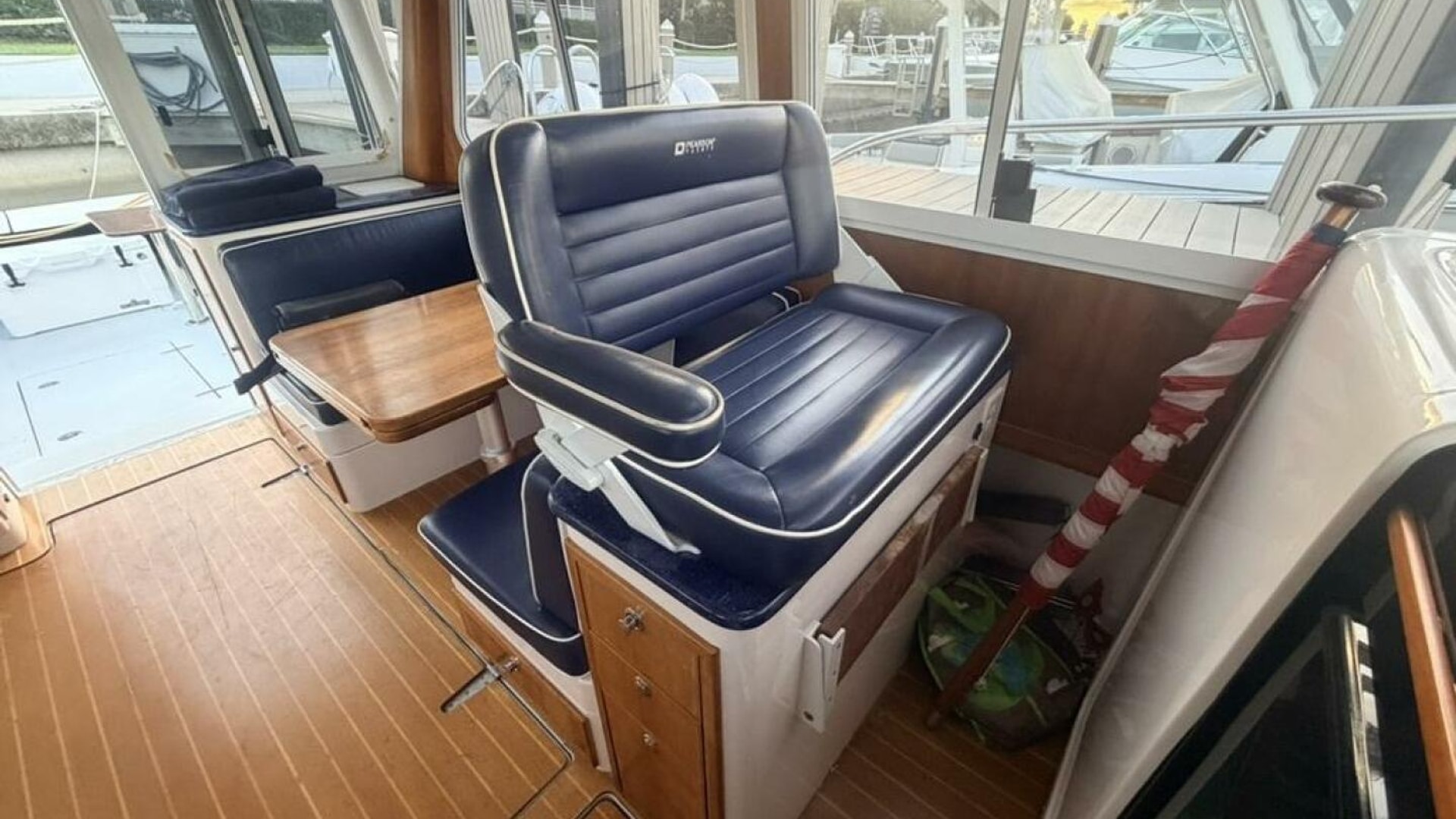 - Pilothouse: Semi-enclosed with aft galley (stove, fridge, microwave), helm station, and convertible dinette