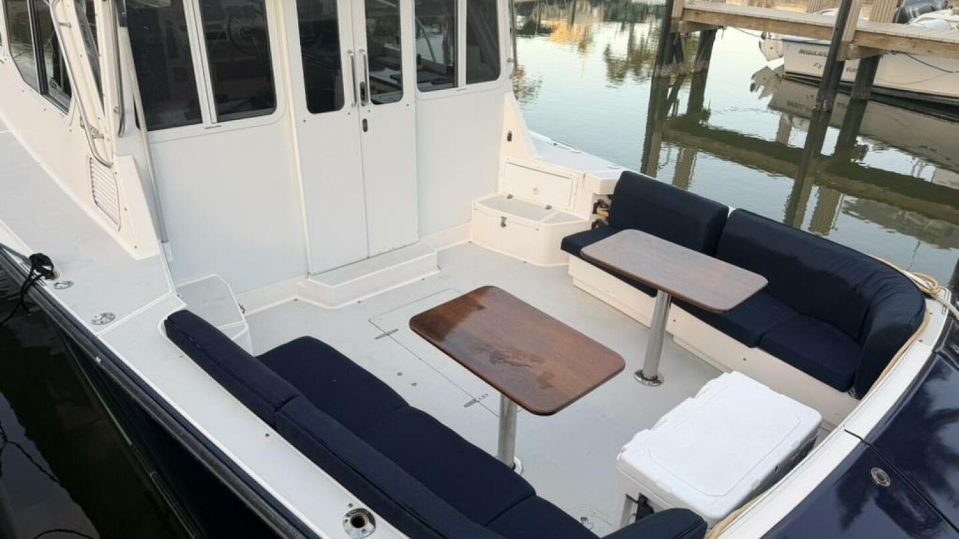 - Cockpit: Large, with twin transom doors for water access, hardtop for toys (kayaks, paddleboards)