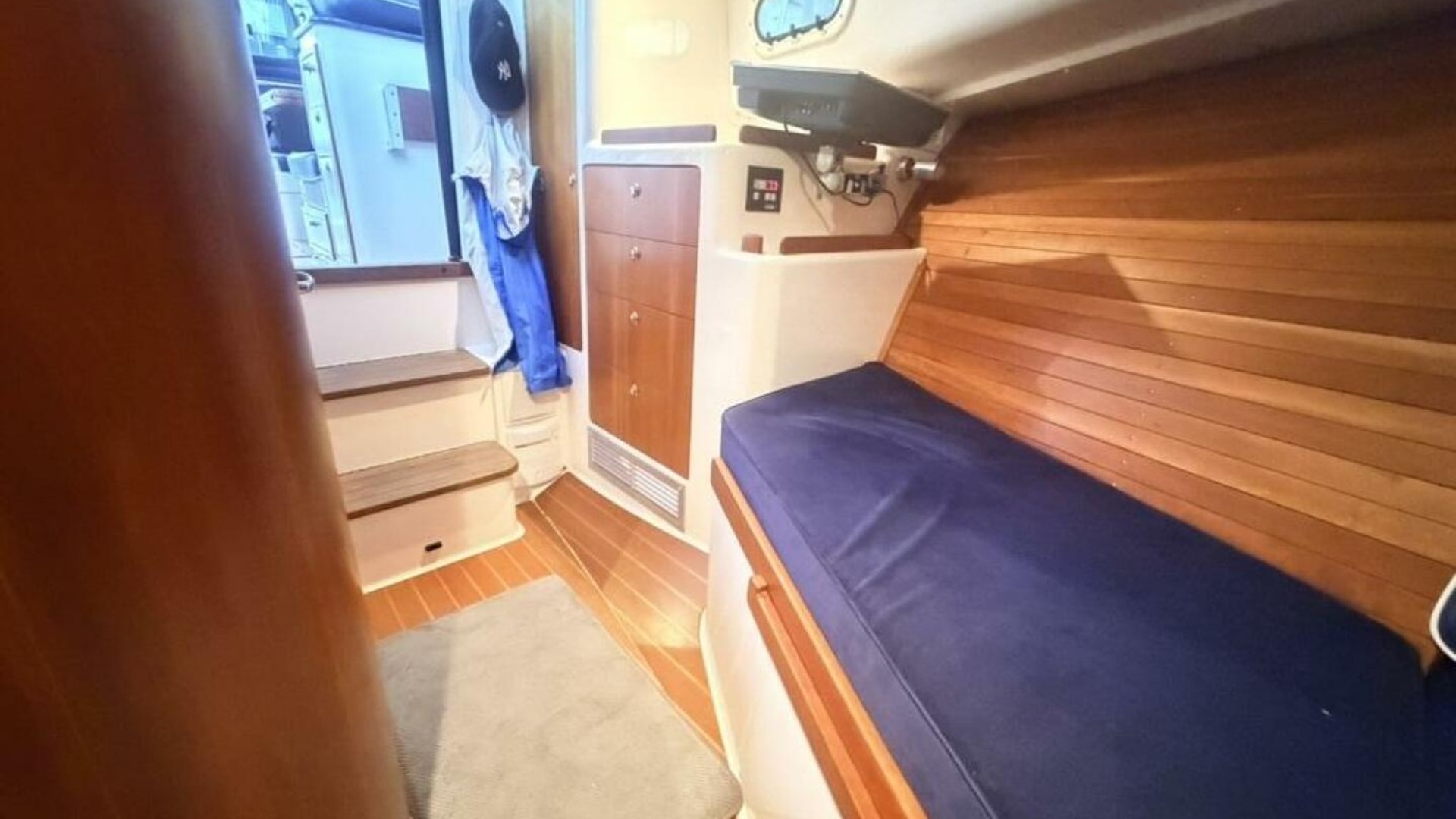 The interior features rich cherry wood paneling in the master stateroom located below deck, offering a warm and spacious retreat.