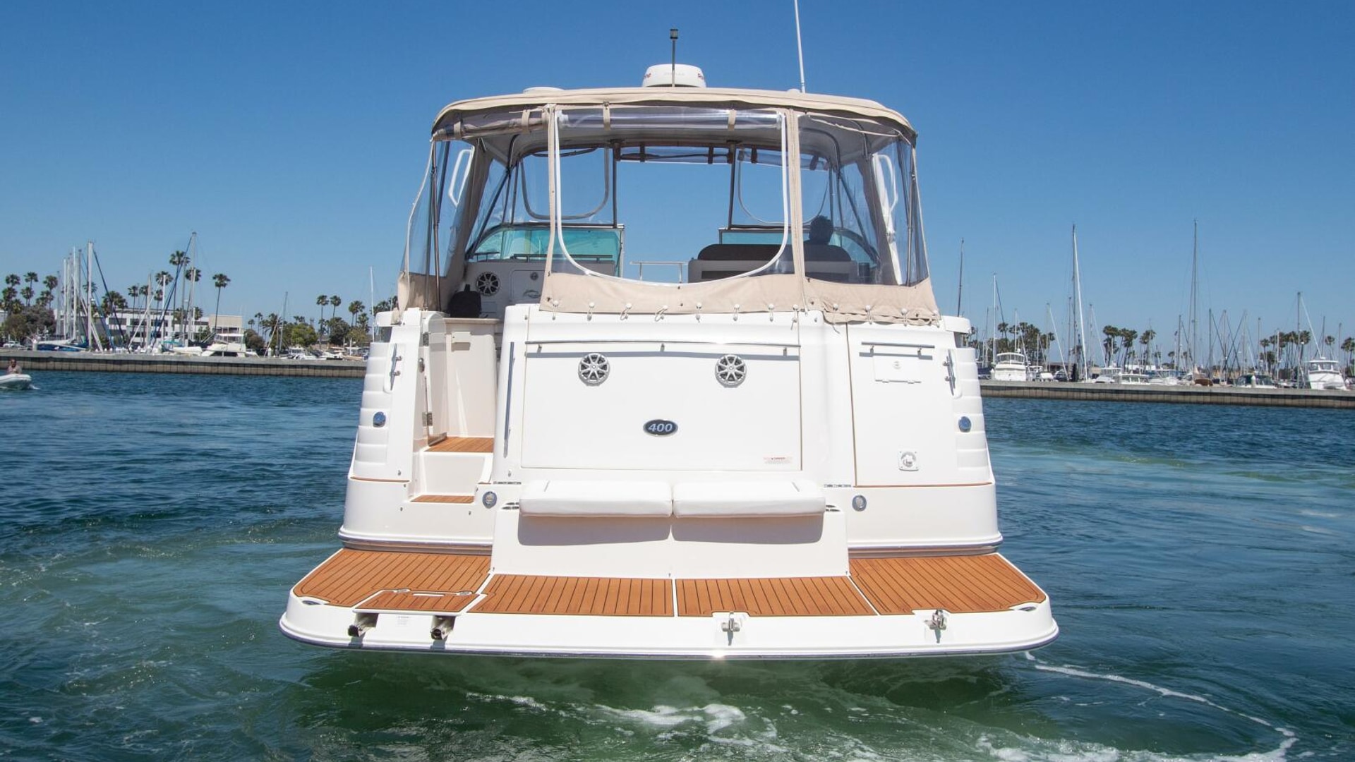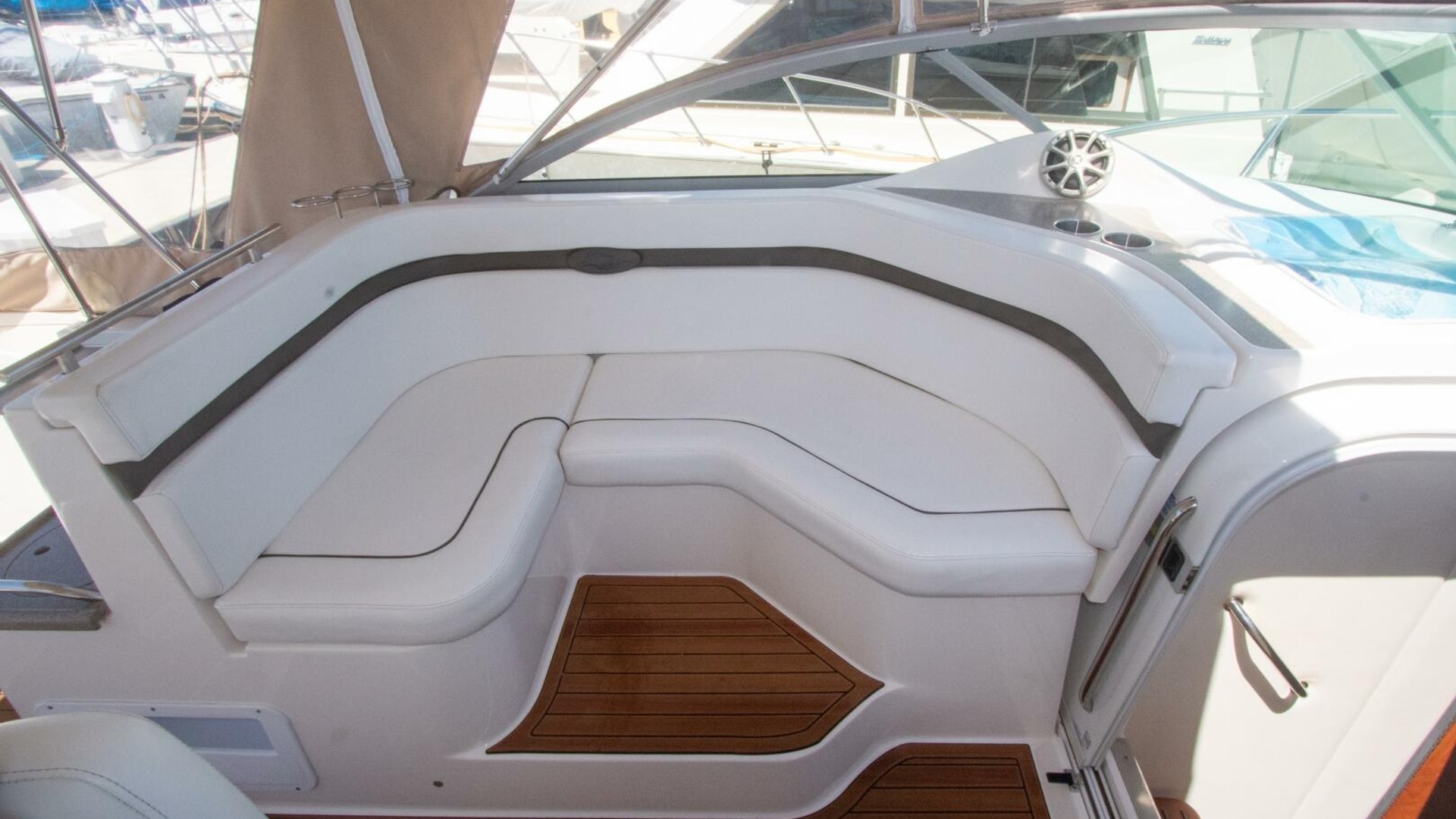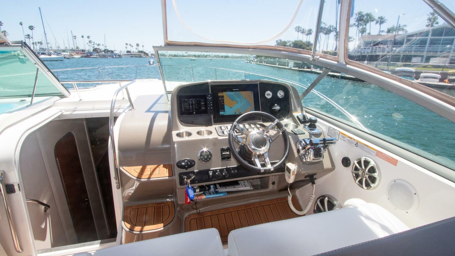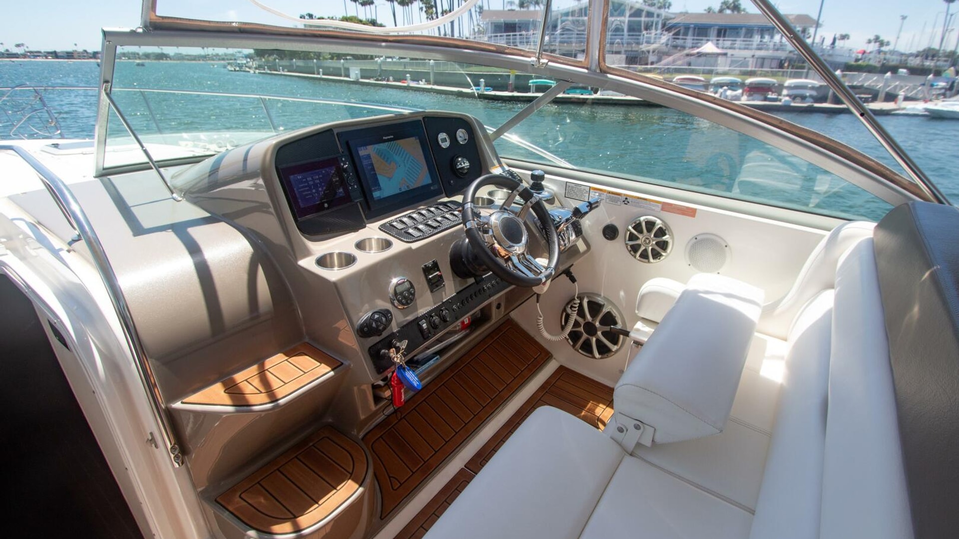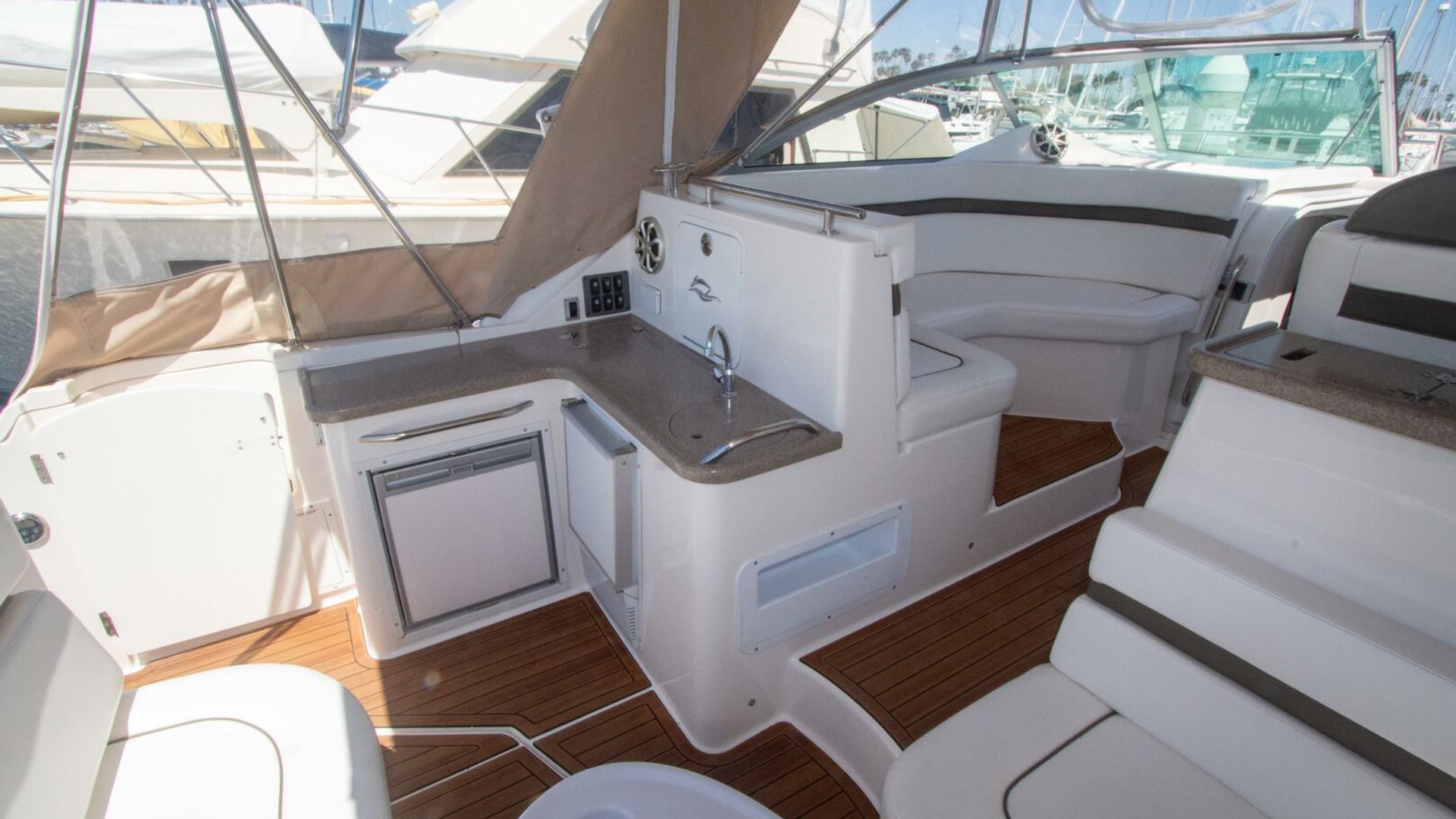 The master stateroom is forward in this layout and includes a queen island berth and flat-screen TV. But it’s the huge aft stateroom that comes as a surprise, a feat made possible by Rinker’s decision to use space-saving sterndrive power in this boat rather than more conventional inboard (V-drive) power. Both staterooms come with privacy doors rather than curtains—a real plus. Satin-finished cherry joinery is applied throughout the interior that also features a Corian galley counter and teak flooring. The split-level cockpit, with seating for a small crowd, includes a full-service wet bar with icemaker, double helm seat with flip-up bolster, walk-through windshield.