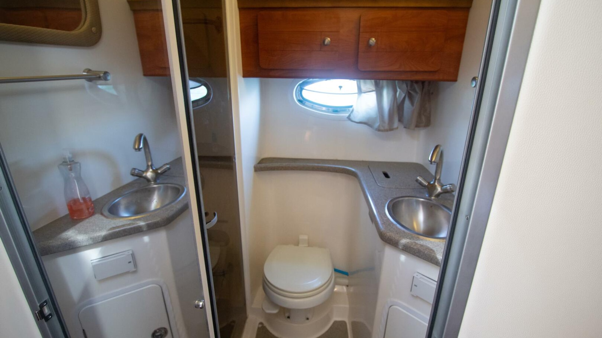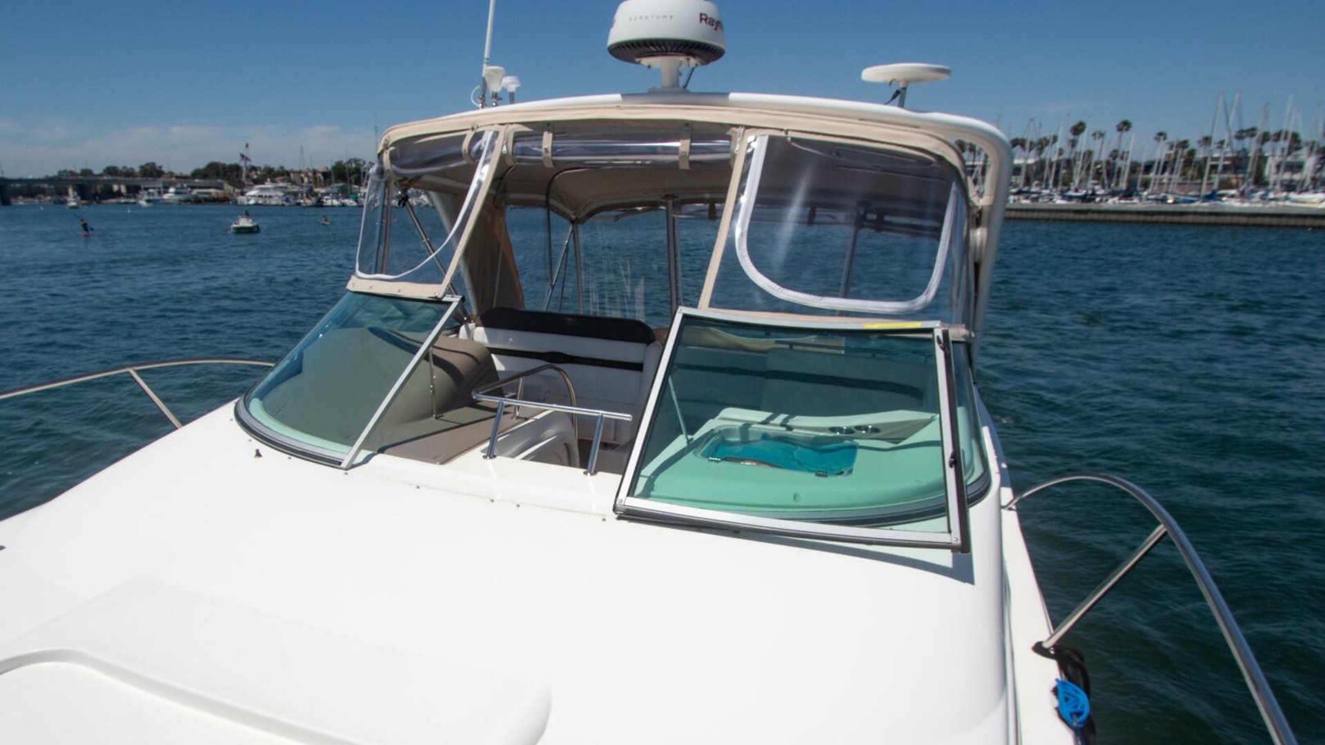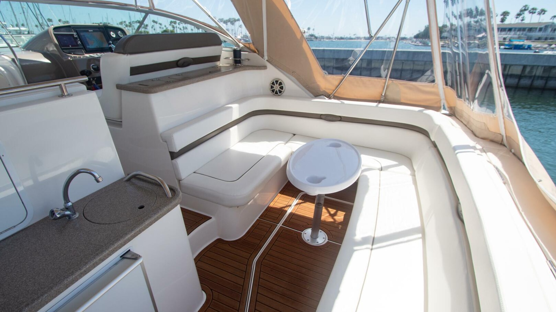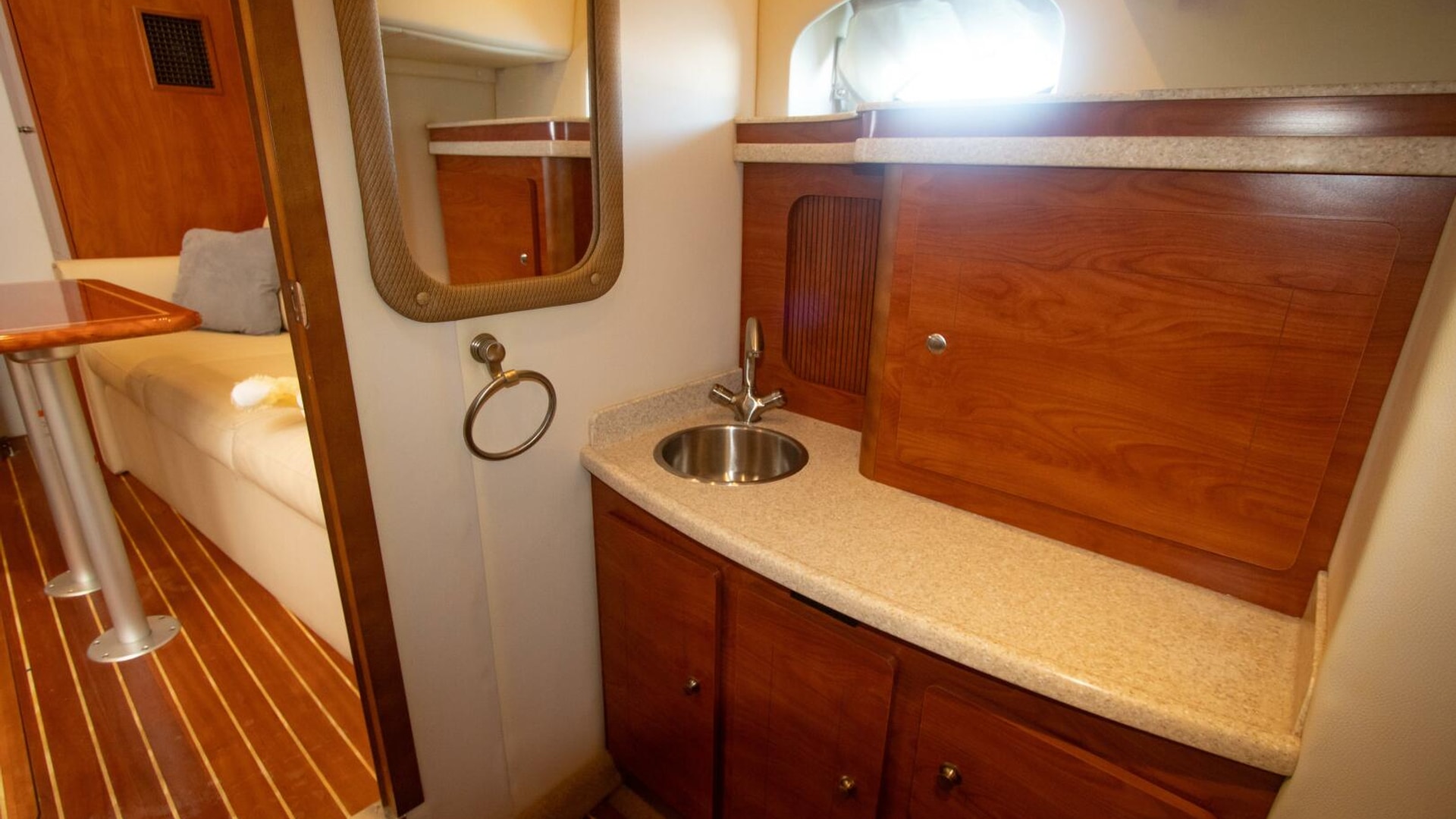 The master stateroom is forward in this layout and includes a queen island berth and flat-screen TV. But it’s the huge aft stateroom that comes as a surprise, a feat made possible by Rinker’s decision to use space-saving sterndrive power in this boat rather than more conventional inboard (V-drive) power. Both staterooms come with privacy doors rather than curtains—a real plus. Satin-finished cherry joinery is applied throughout the interior that also features a Corian galley counter and teak flooring. The split-level cockpit, with seating for a small crowd, includes a full-service wet bar with icemaker, double helm seat with flip-up bolster, walk-through windshield.