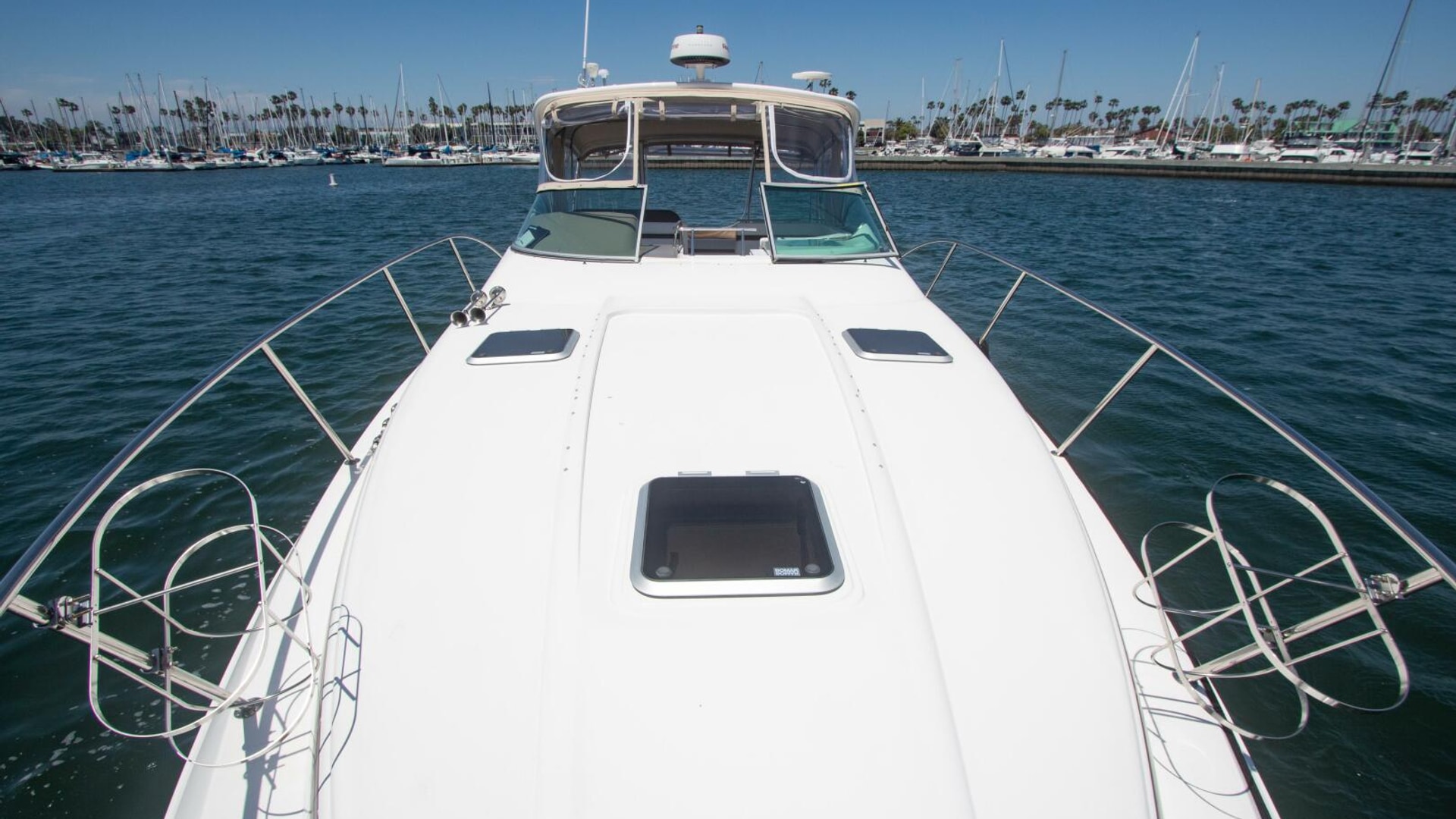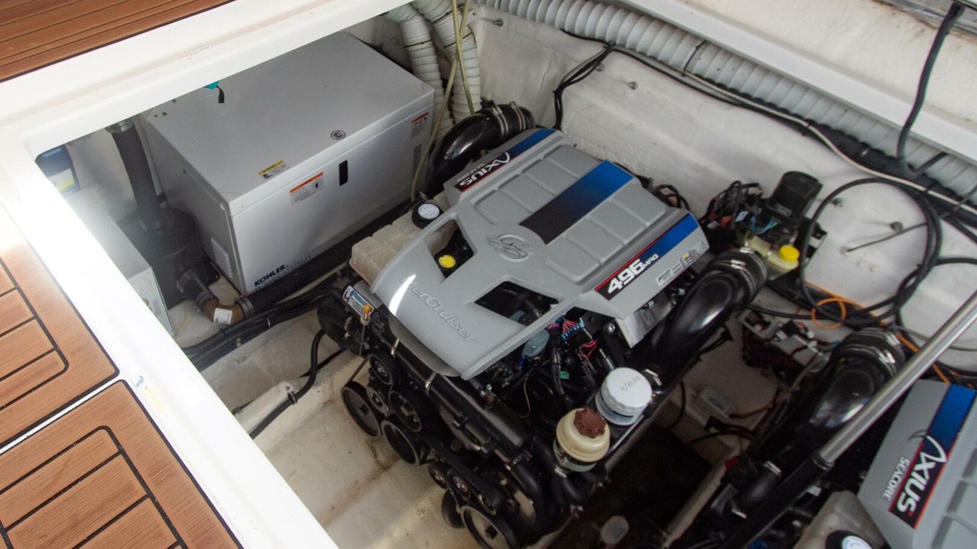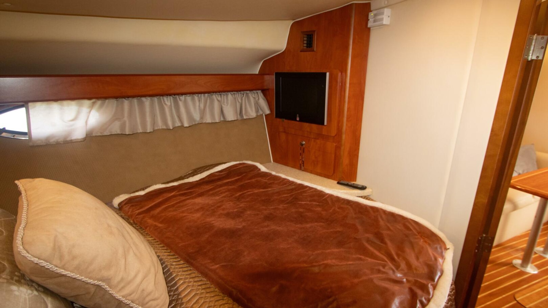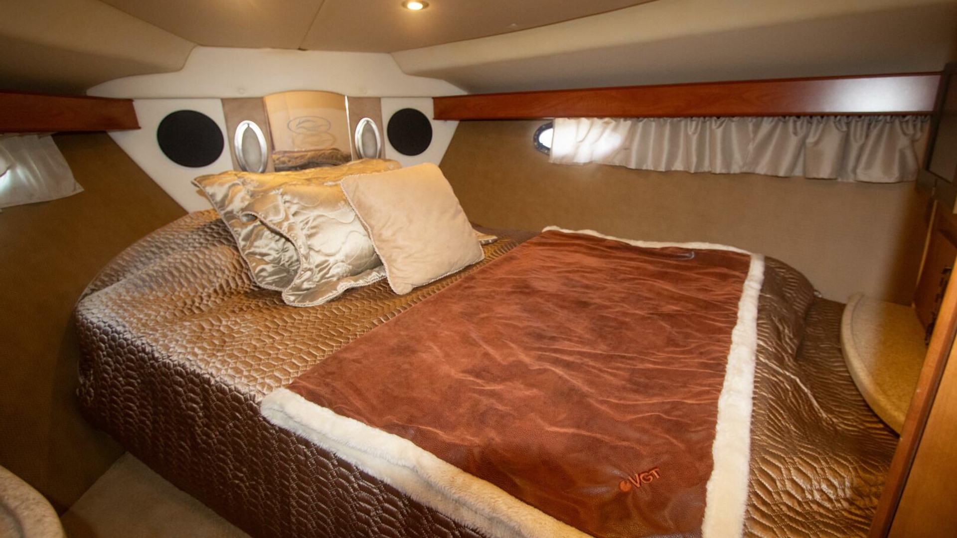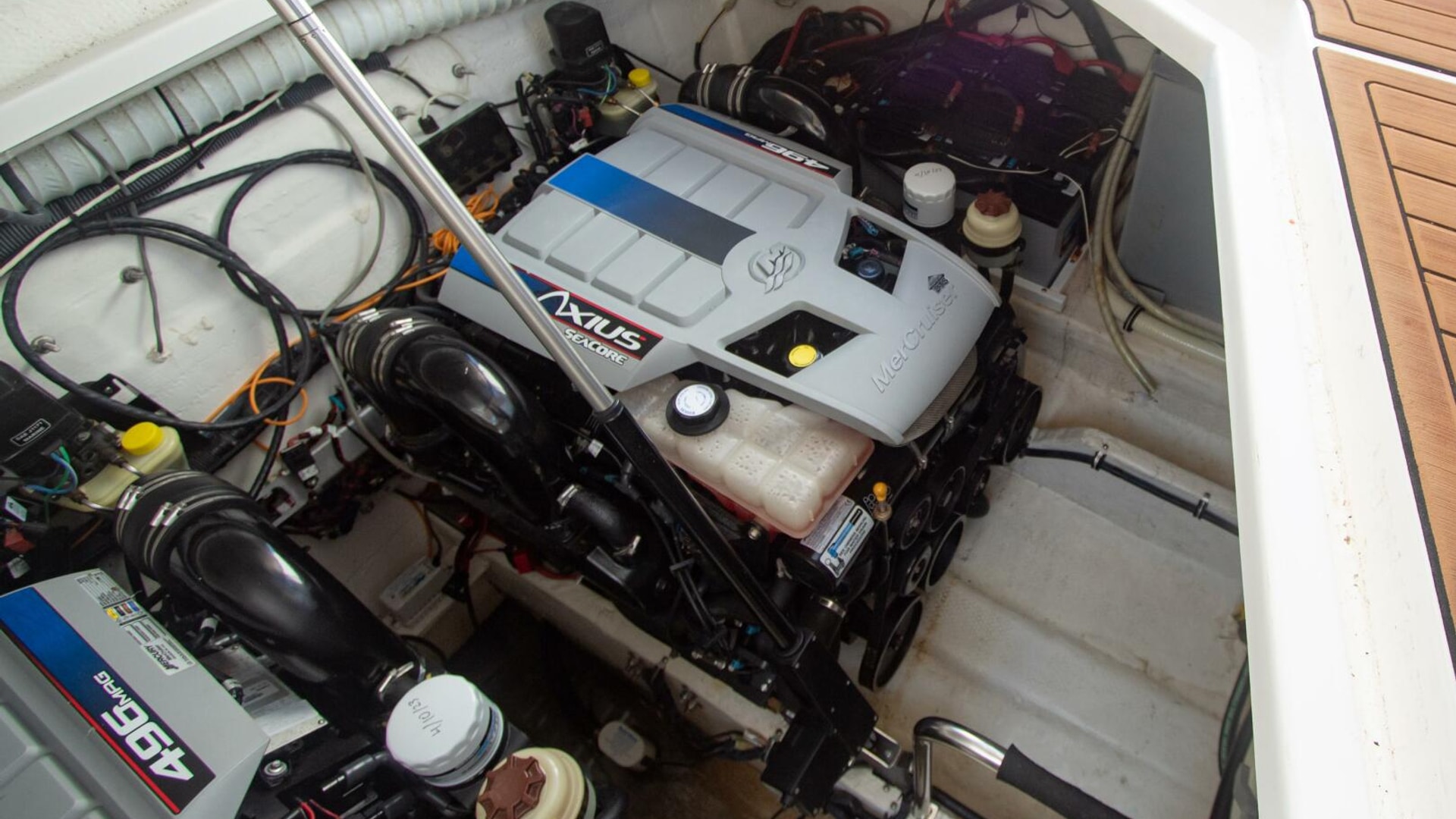 The master stateroom is forward in this layout and includes a queen island berth and flat-screen TV. But it’s the huge aft stateroom that comes as a surprise, a feat made possible by Rinker’s decision to use space-saving sterndrive power in this boat rather than more conventional inboard (V-drive) power. Both staterooms come with privacy doors rather than curtains—a real plus. Satin-finished cherry joinery is applied throughout the interior that also features a Corian galley counter and teak flooring. The split-level cockpit, with seating for a small crowd, includes a full-service wet bar with icemaker, double helm seat with flip-up bolster, walk-through windshield.
