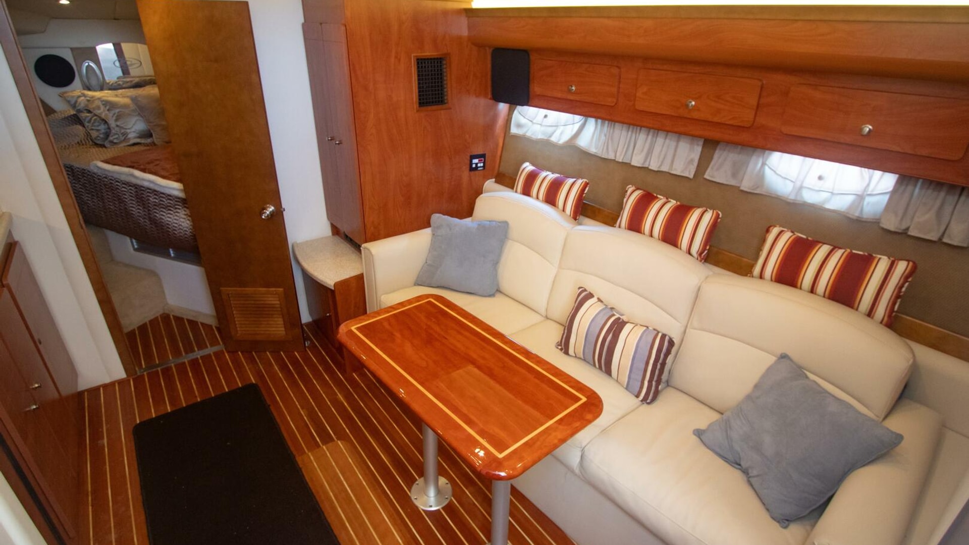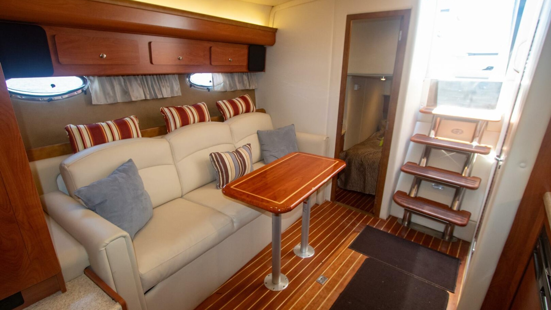 - Settee to Starboard w/Dining / Cocktail-Table (Converts to Full-Size Berth)