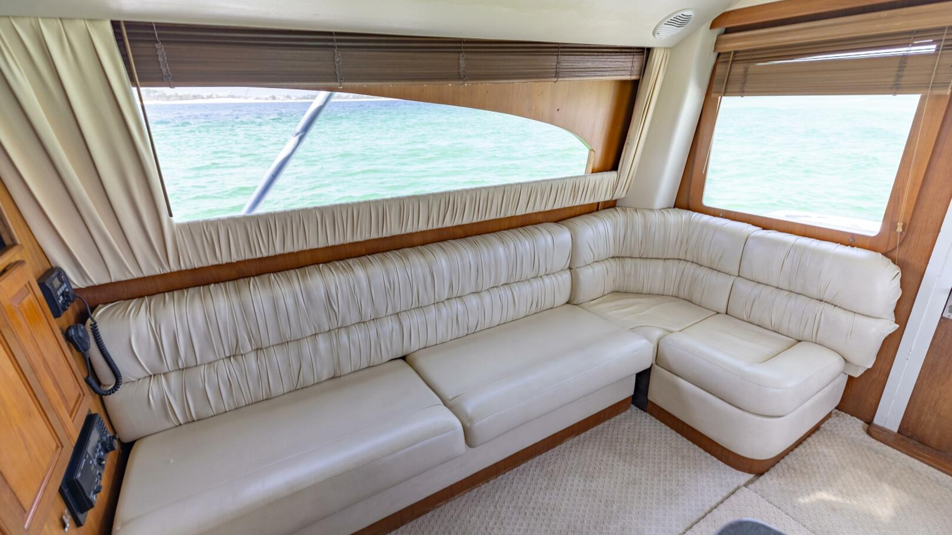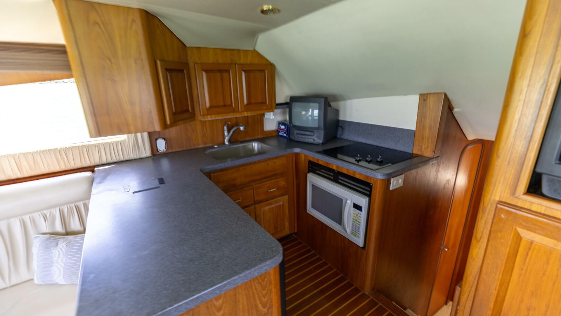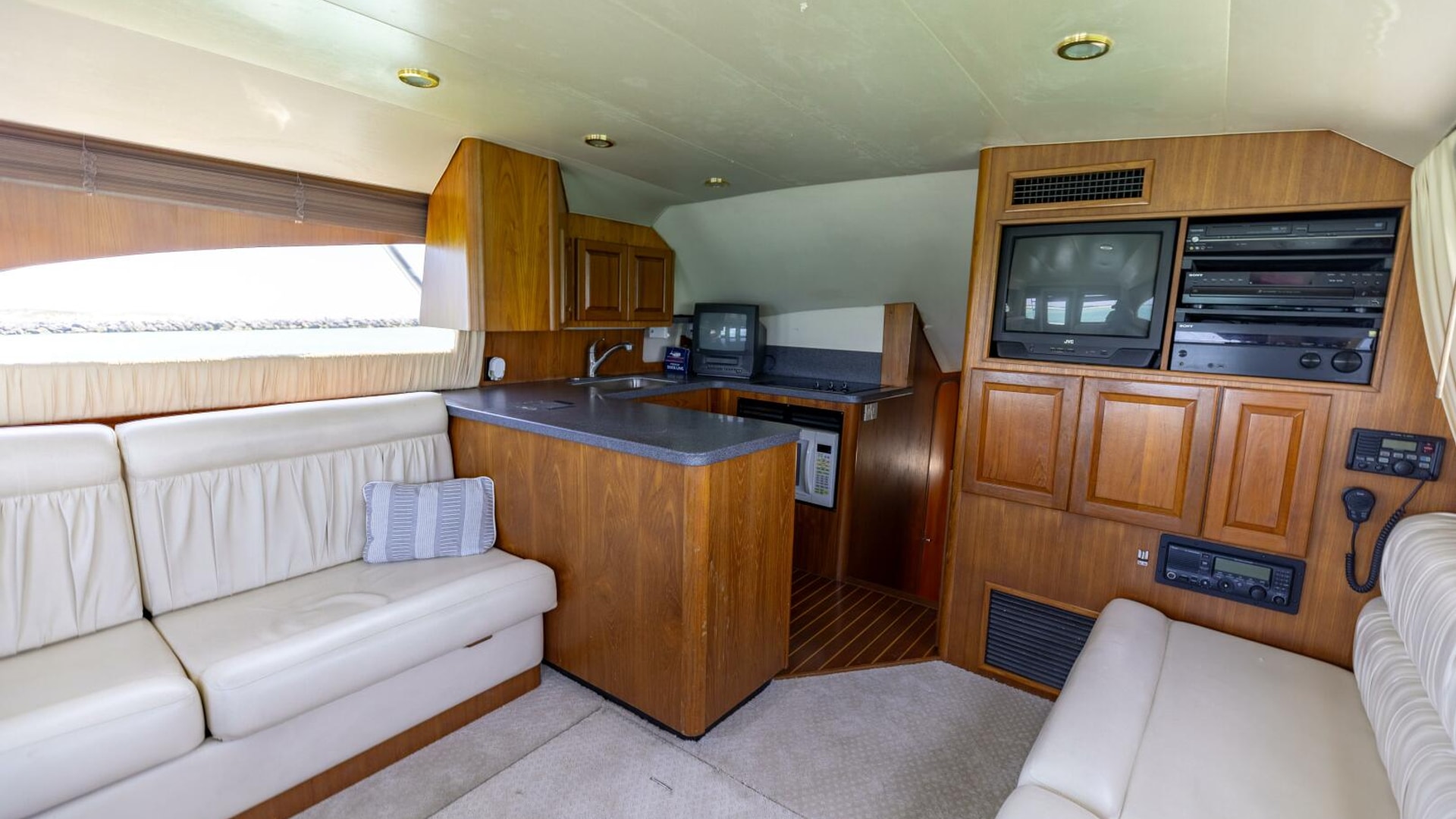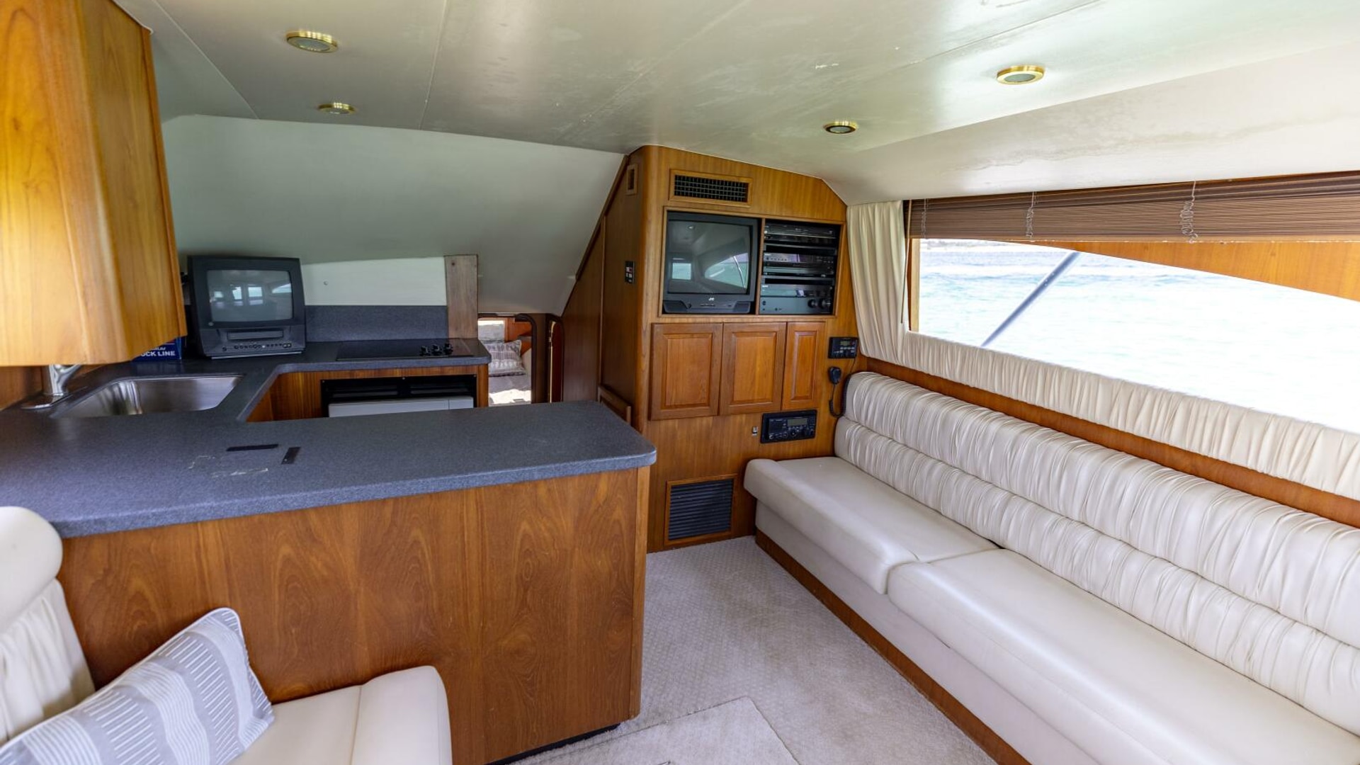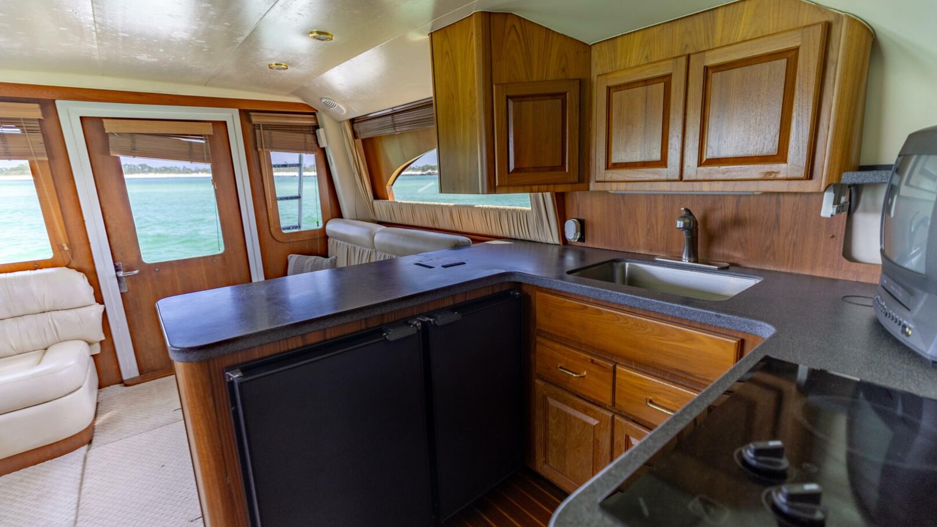 Her spacious salon features clean finishes and Ultraleather seating to port and starboard, complemented by a forward entertainment center. The U-shaped galley includes a stainless steel sink, three-burner stovetop, refrigerator, and freezer—ideal for extended stays aboard.
