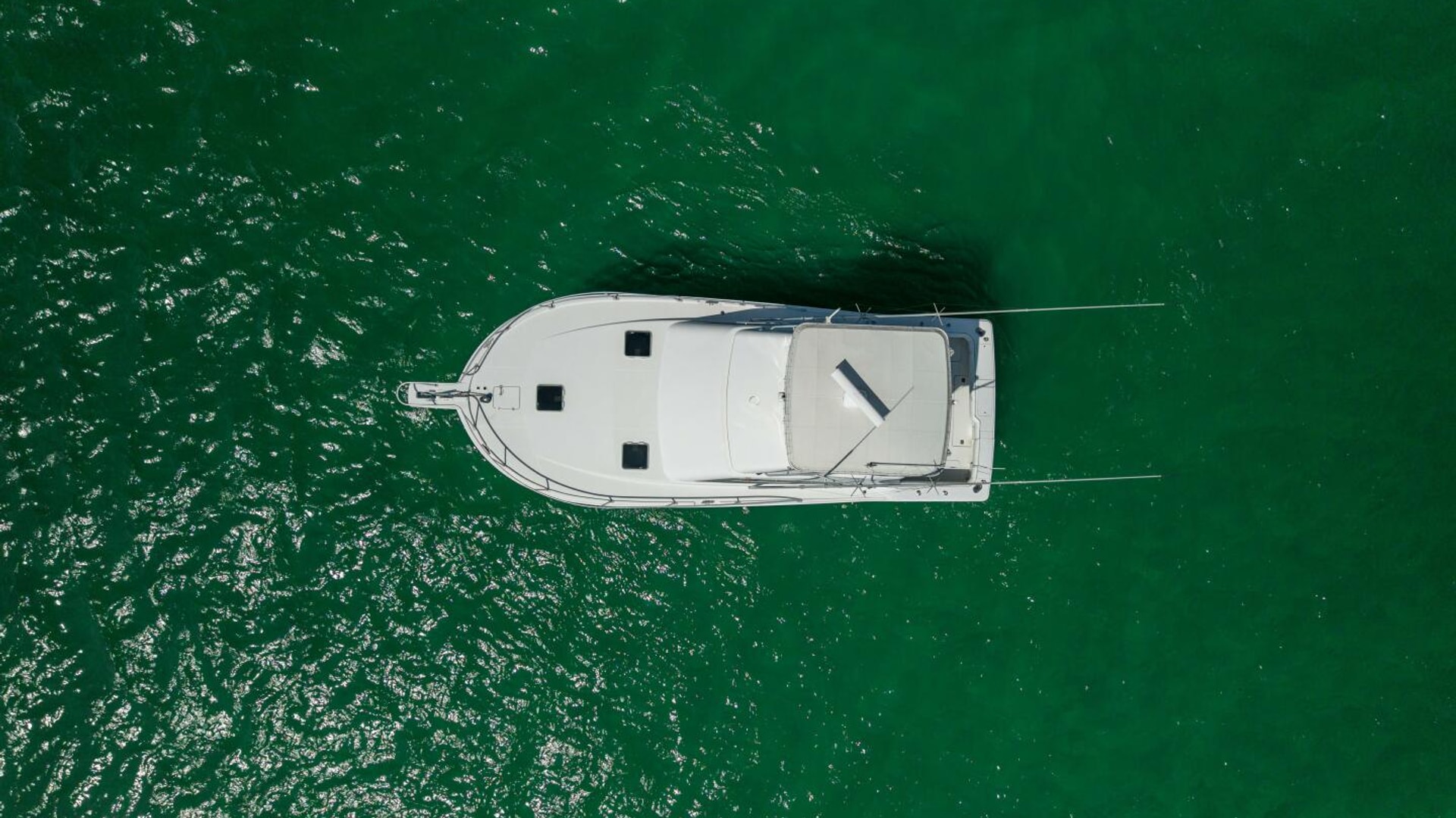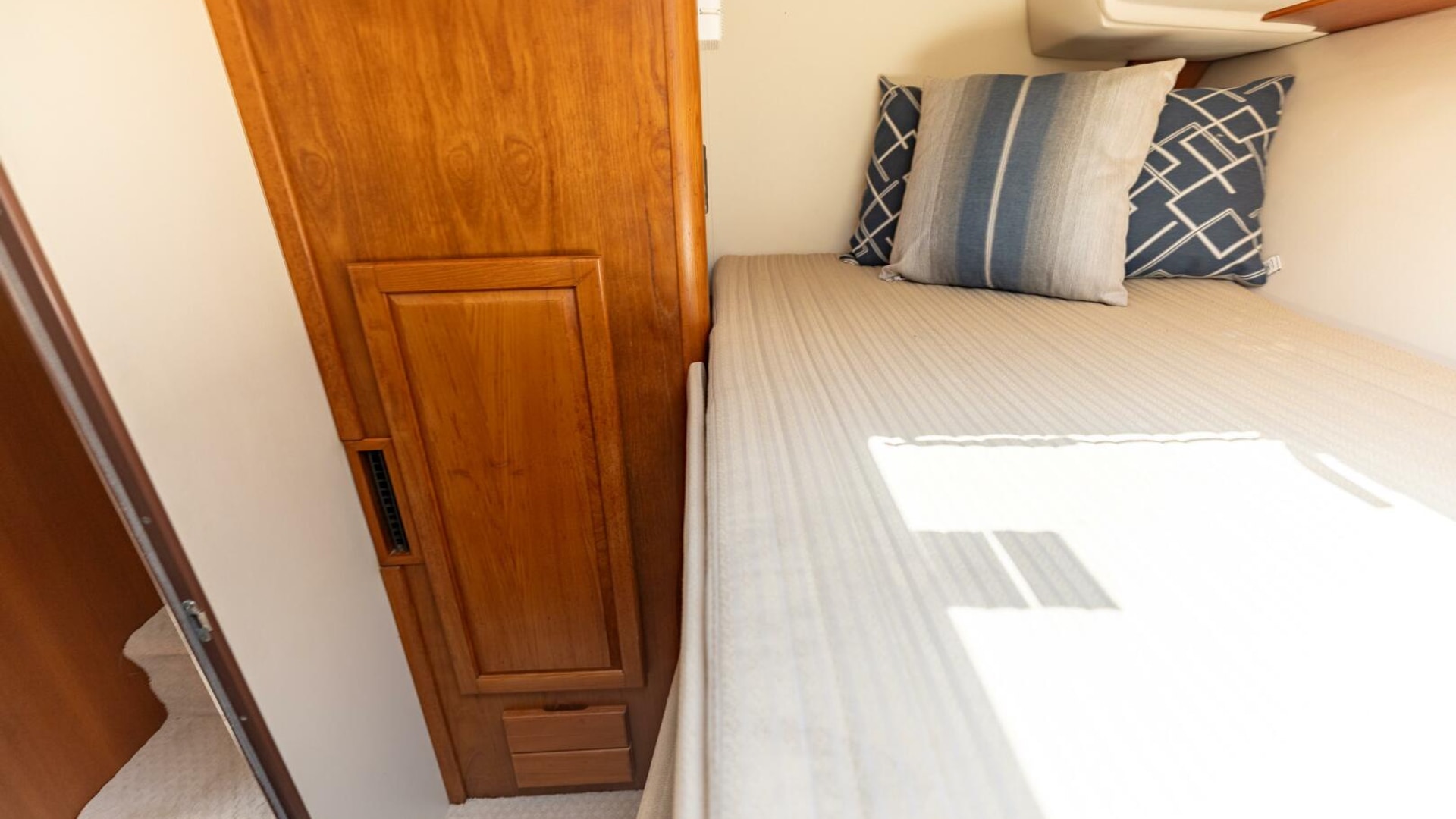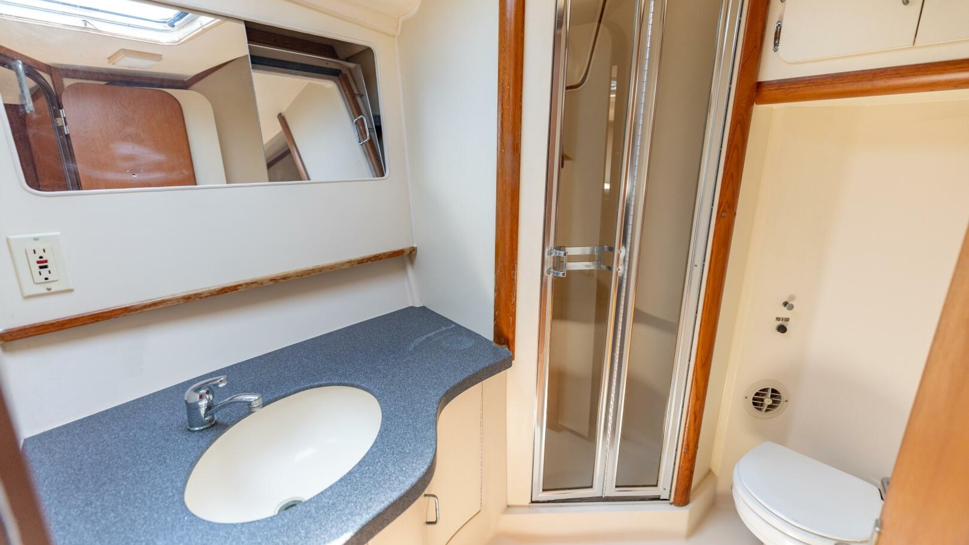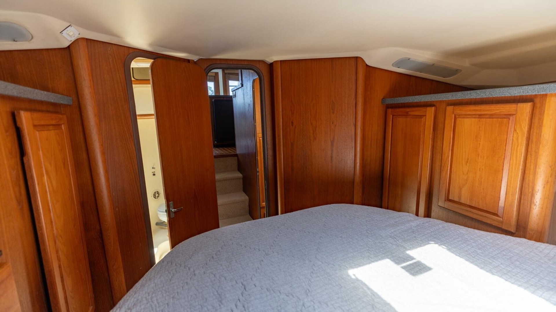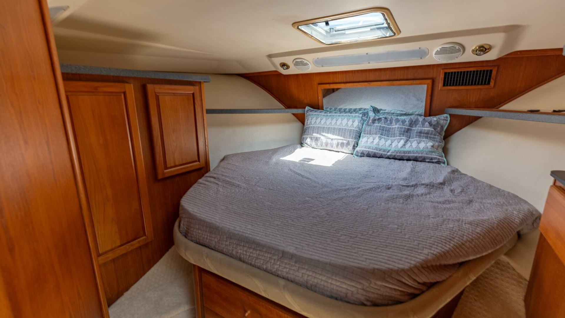 Her spacious salon features clean finishes and Ultraleather seating to port and starboard, complemented by a forward entertainment center. The U-shaped galley includes a stainless steel sink, three-burner stovetop, refrigerator, and freezer—ideal for extended stays aboard.