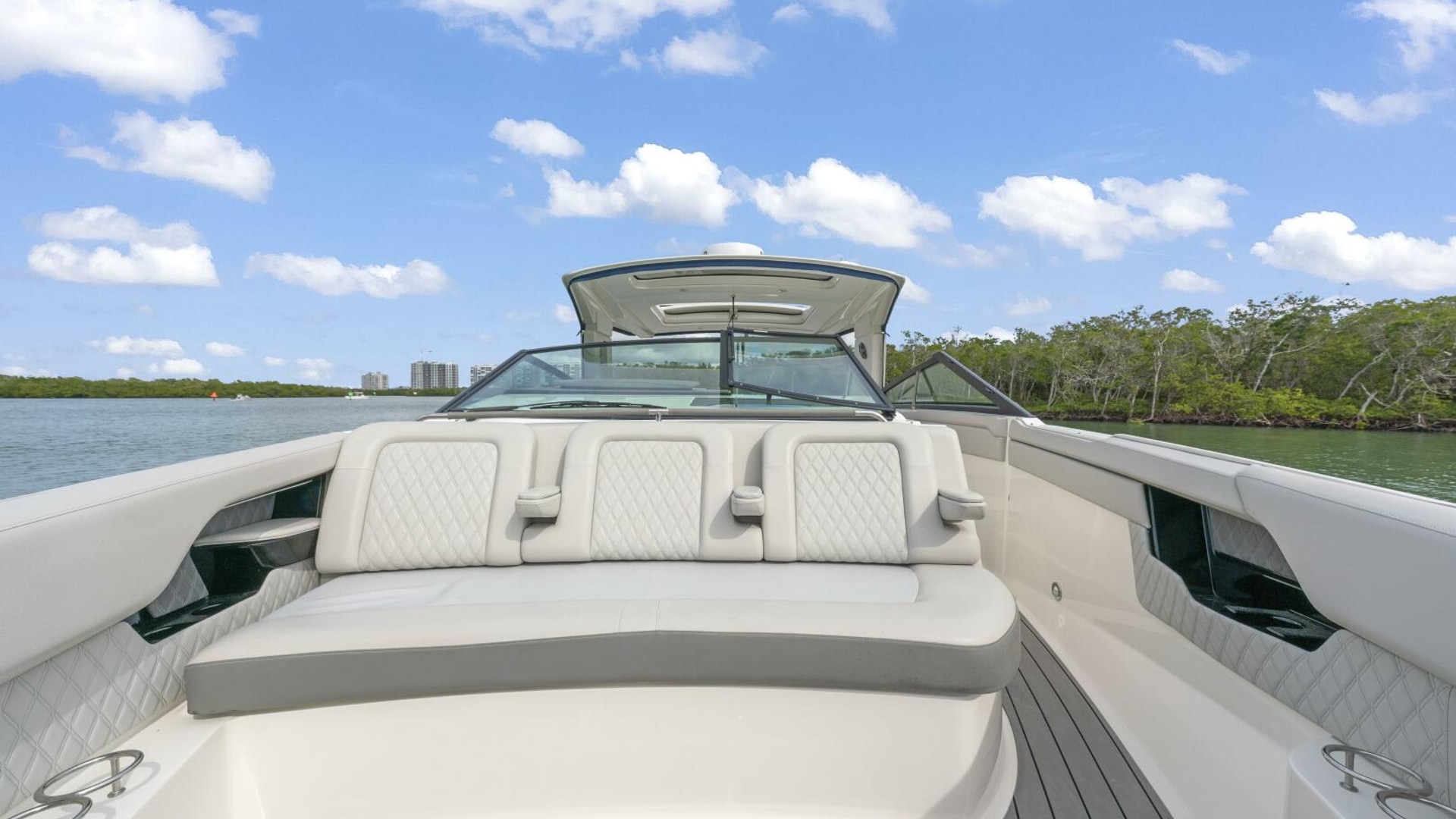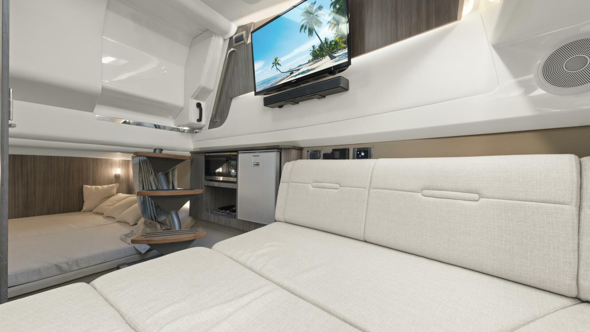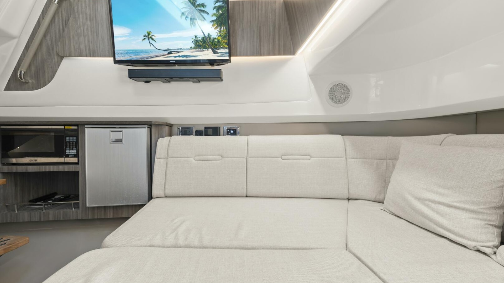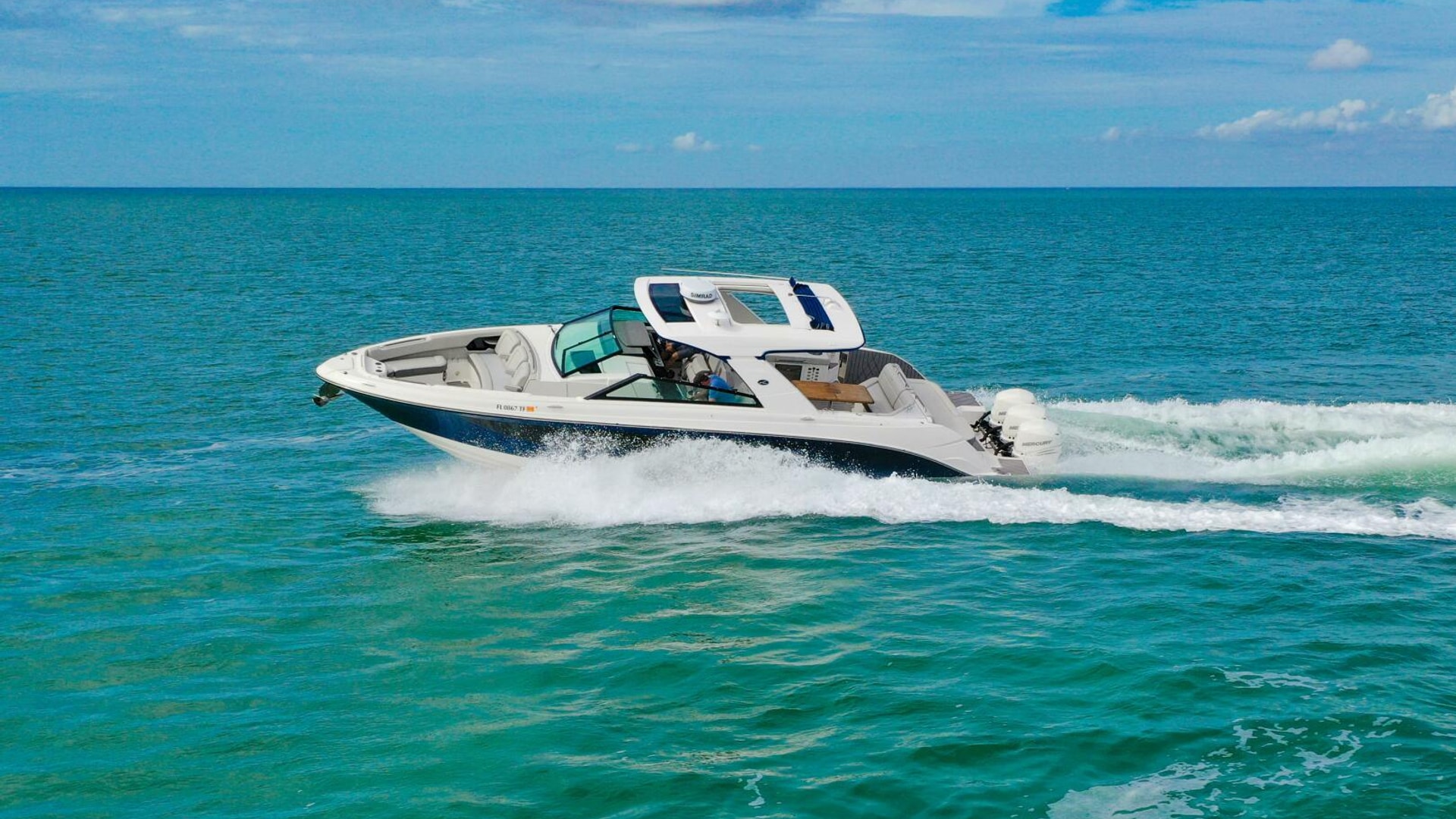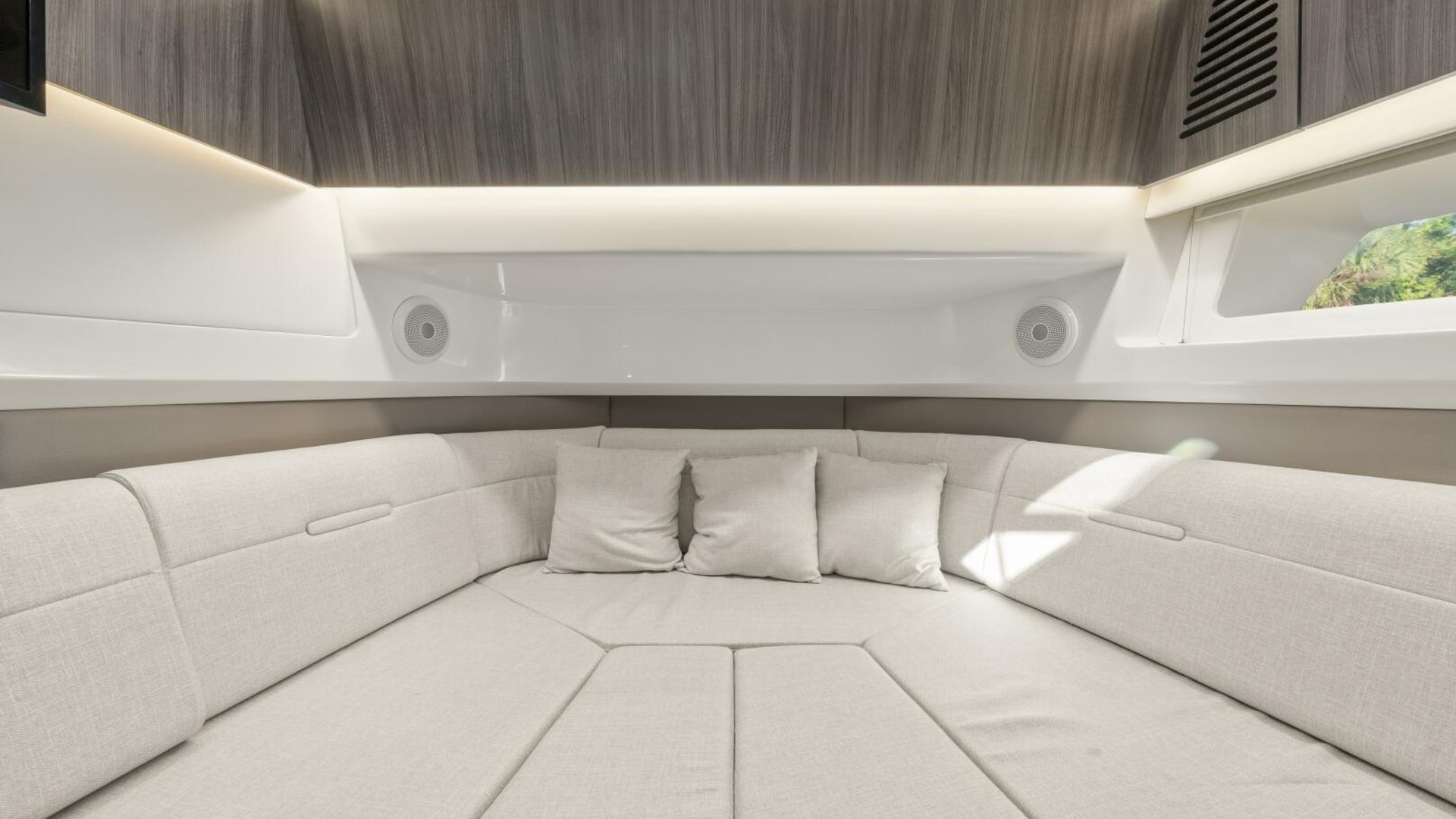 Excellence. An expansive cockpit social zone has a well-appointed wet bar with refrigerator, sink and available dual grills while the innovative fold-down swim terrace opens to extend the cockpit all the way to the water. Innovations, found throughout, include Joystick Piloting and Dual Digital Dash with standard 16” Simrad Touchscreen displays. Bring your friends... all of them. The SLX 400 Outboard has a generous cabin and expansive bow and cockpit seating. All of this and amenities for entertainment means hours and days of fun aboard this award-winning boat.