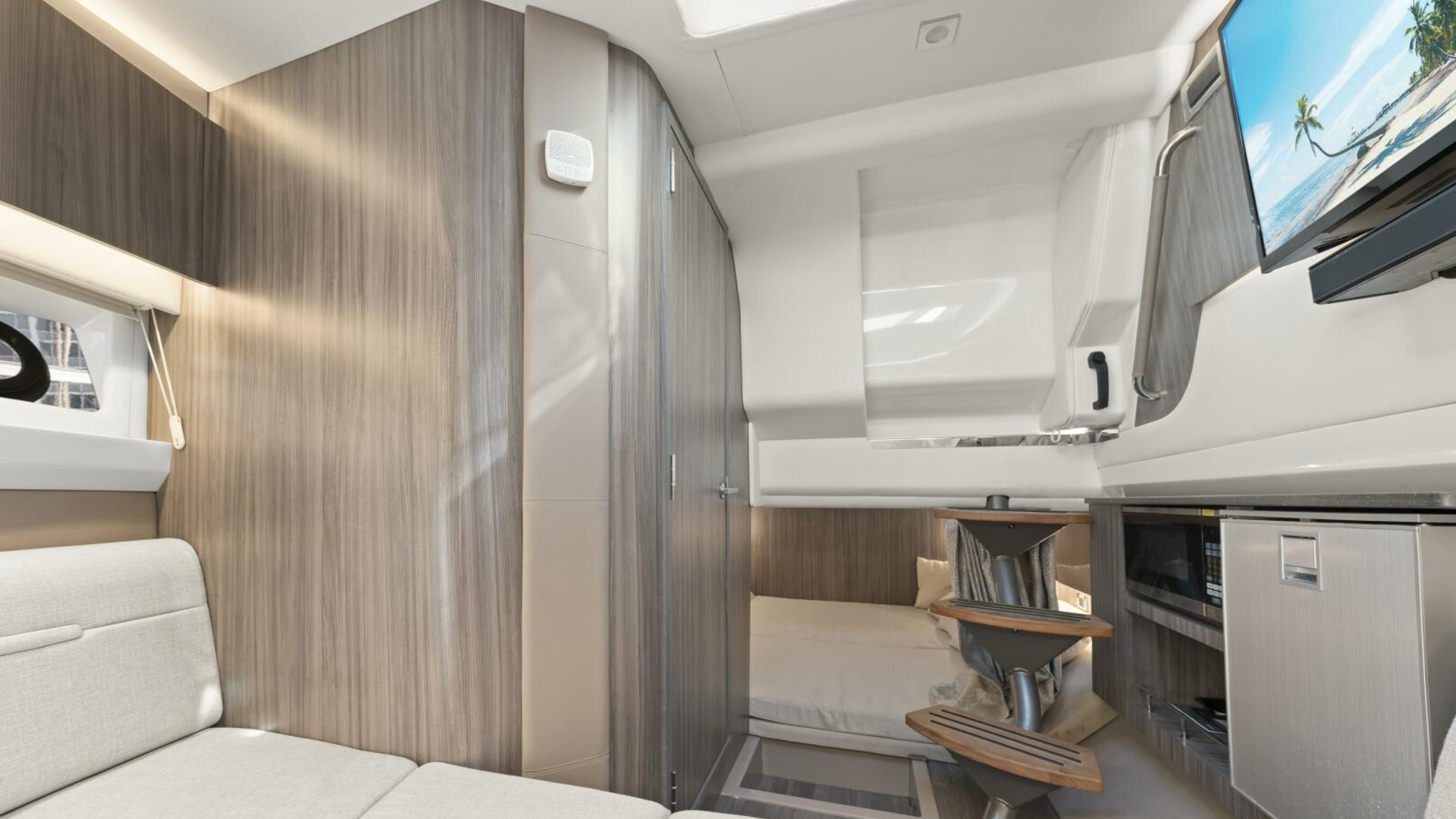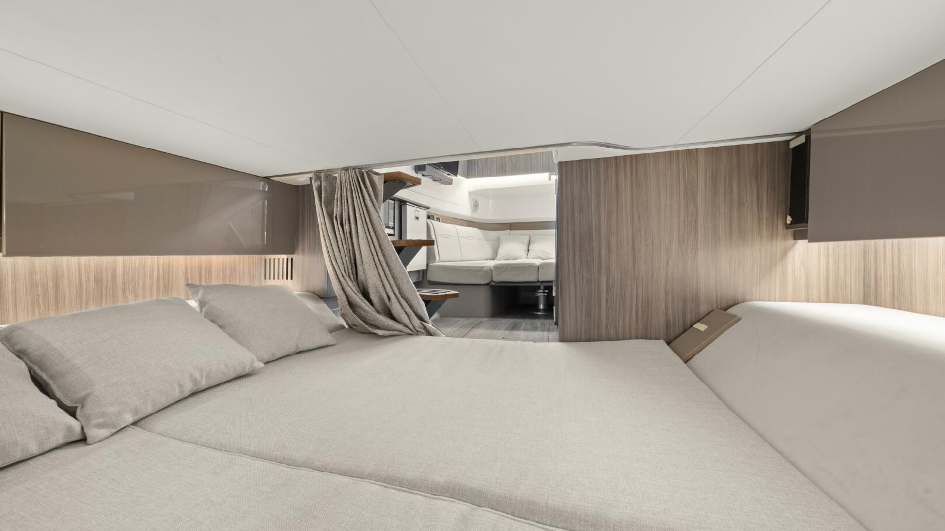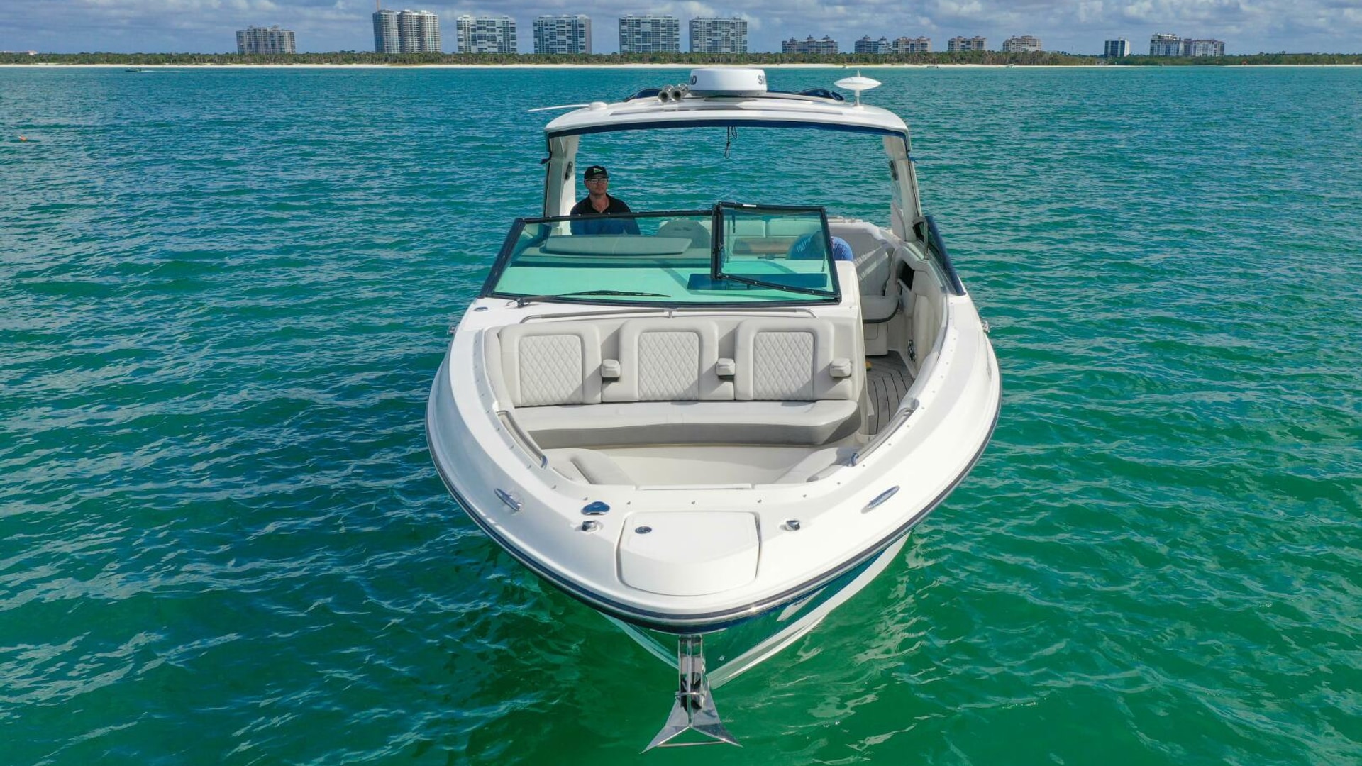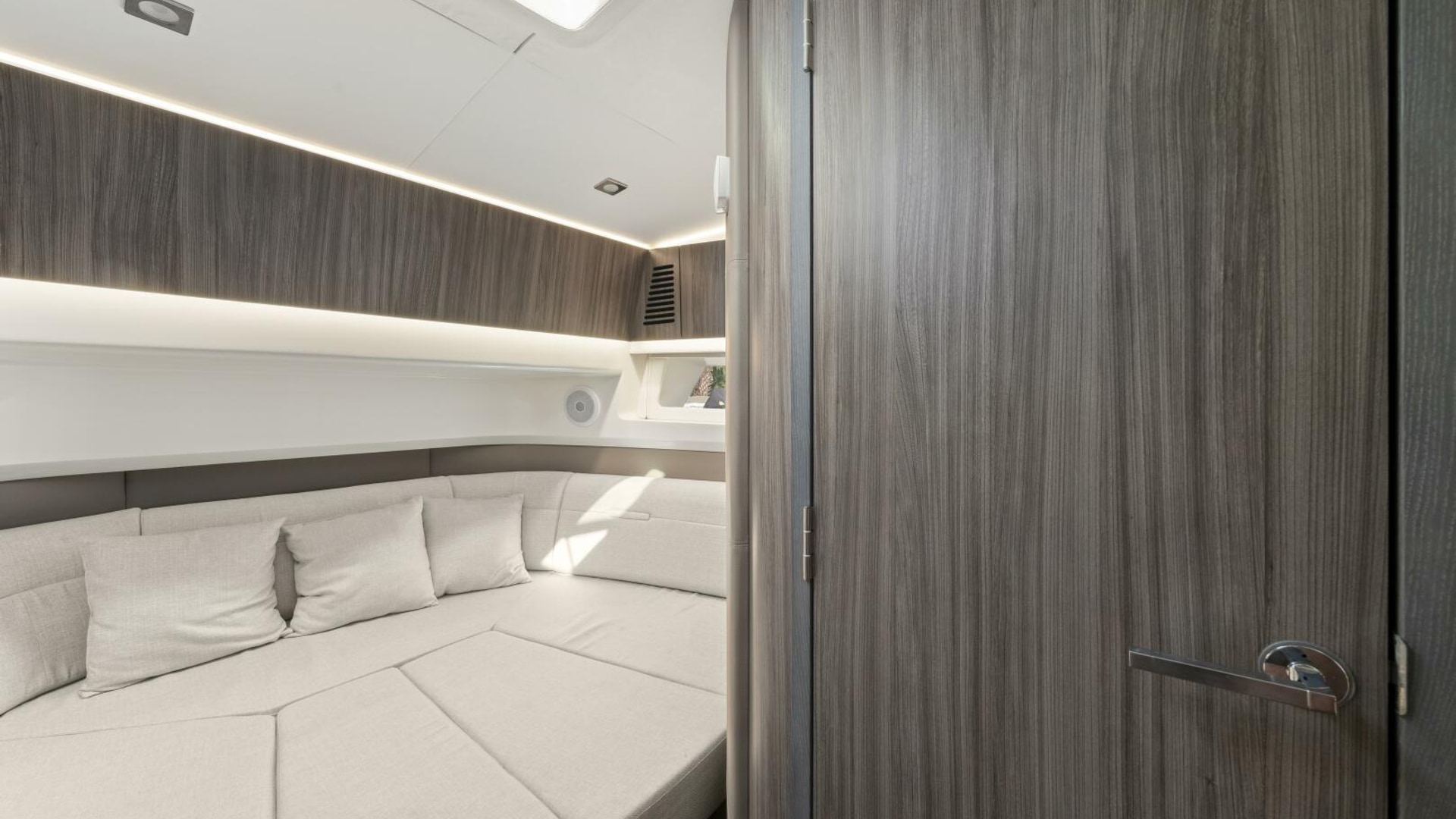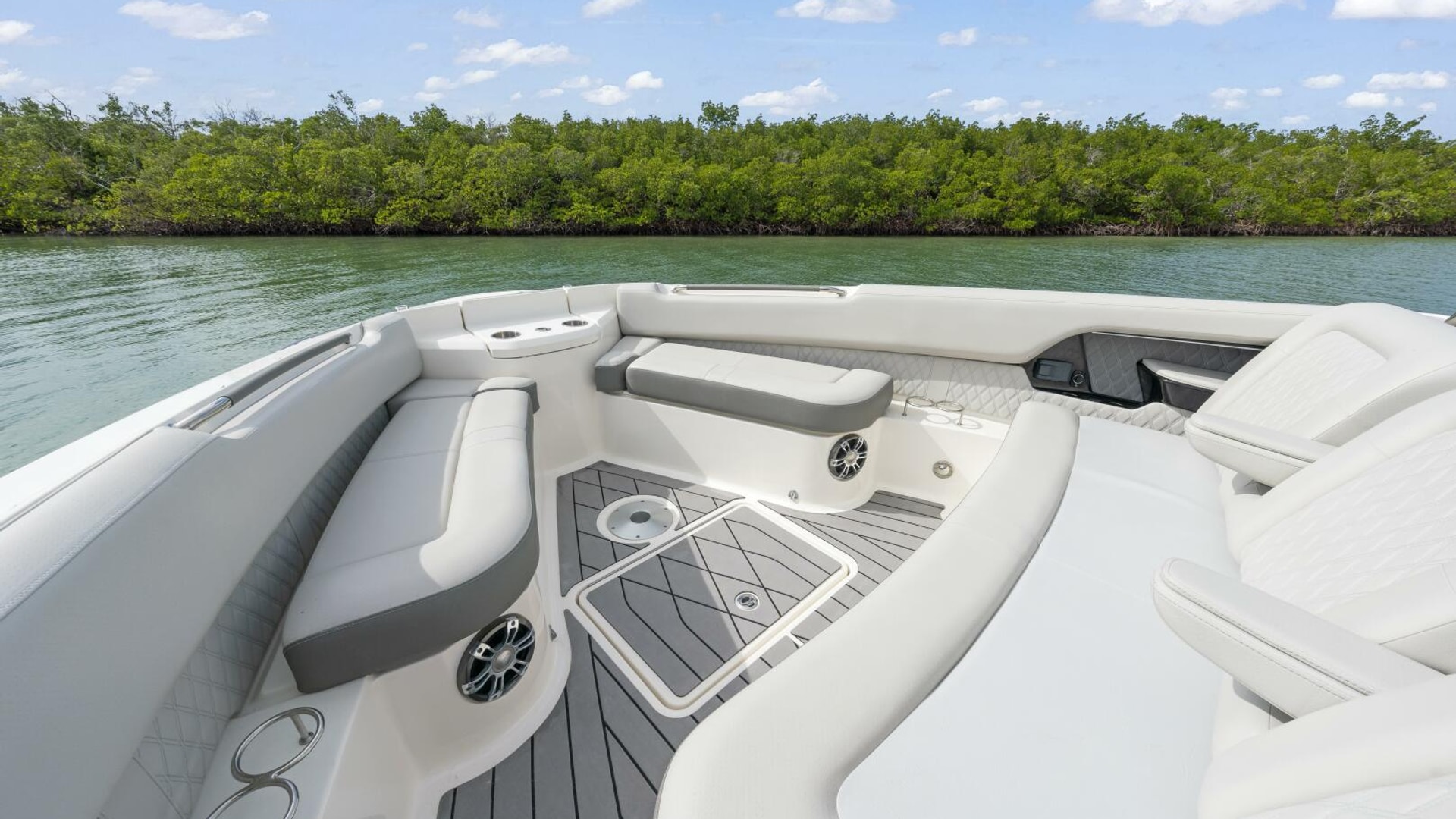 Excellence. An expansive cockpit social zone has a well-appointed wet bar with refrigerator, sink and available dual grills while the innovative fold-down swim terrace opens to extend the cockpit all the way to the water. Innovations, found throughout, include Joystick Piloting and Dual Digital Dash with standard 16” Simrad Touchscreen displays. Bring your friends... all of them. The SLX 400 Outboard has a generous cabin and expansive bow and cockpit seating. All of this and amenities for entertainment means hours and days of fun aboard this award-winning boat.