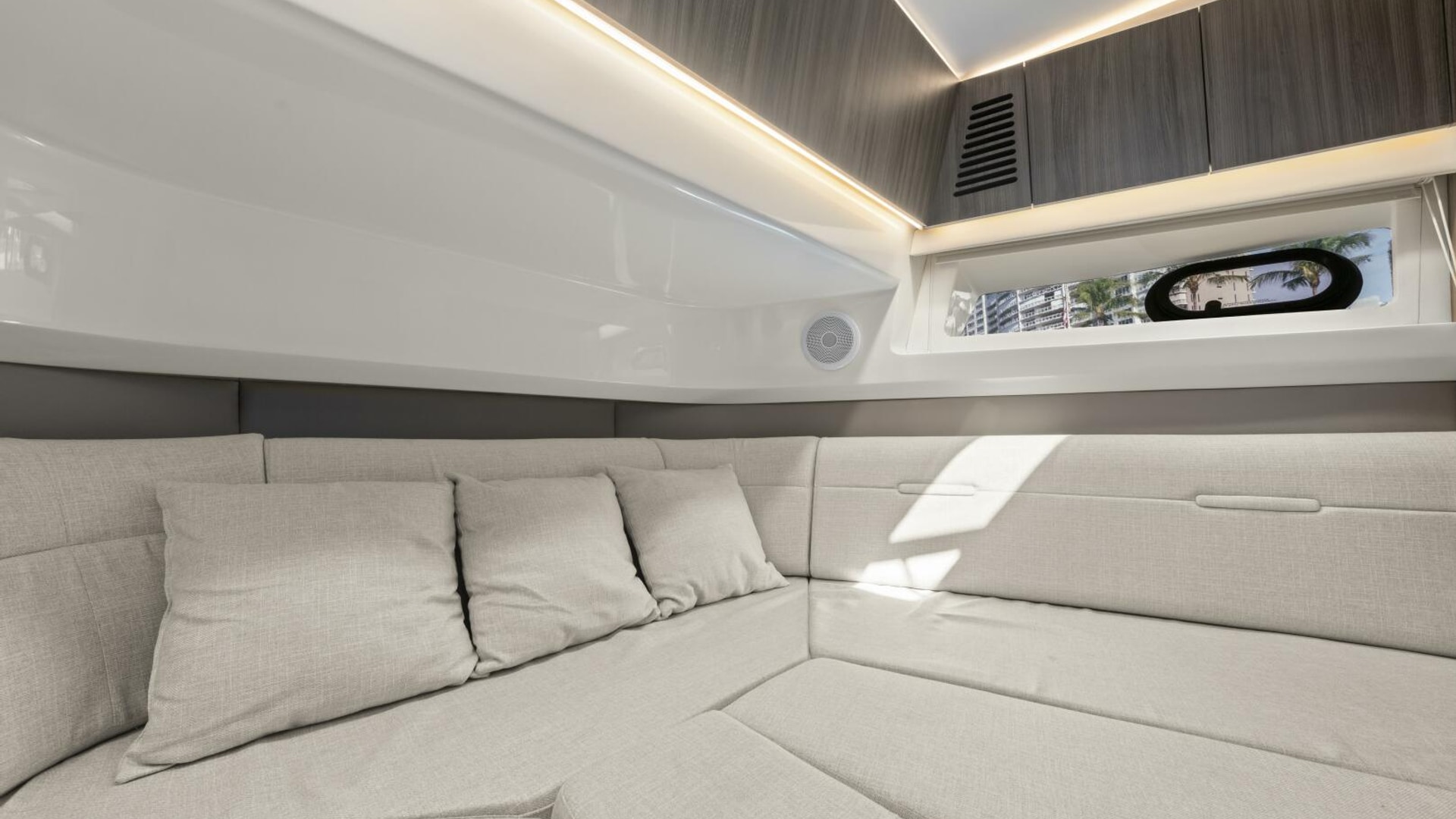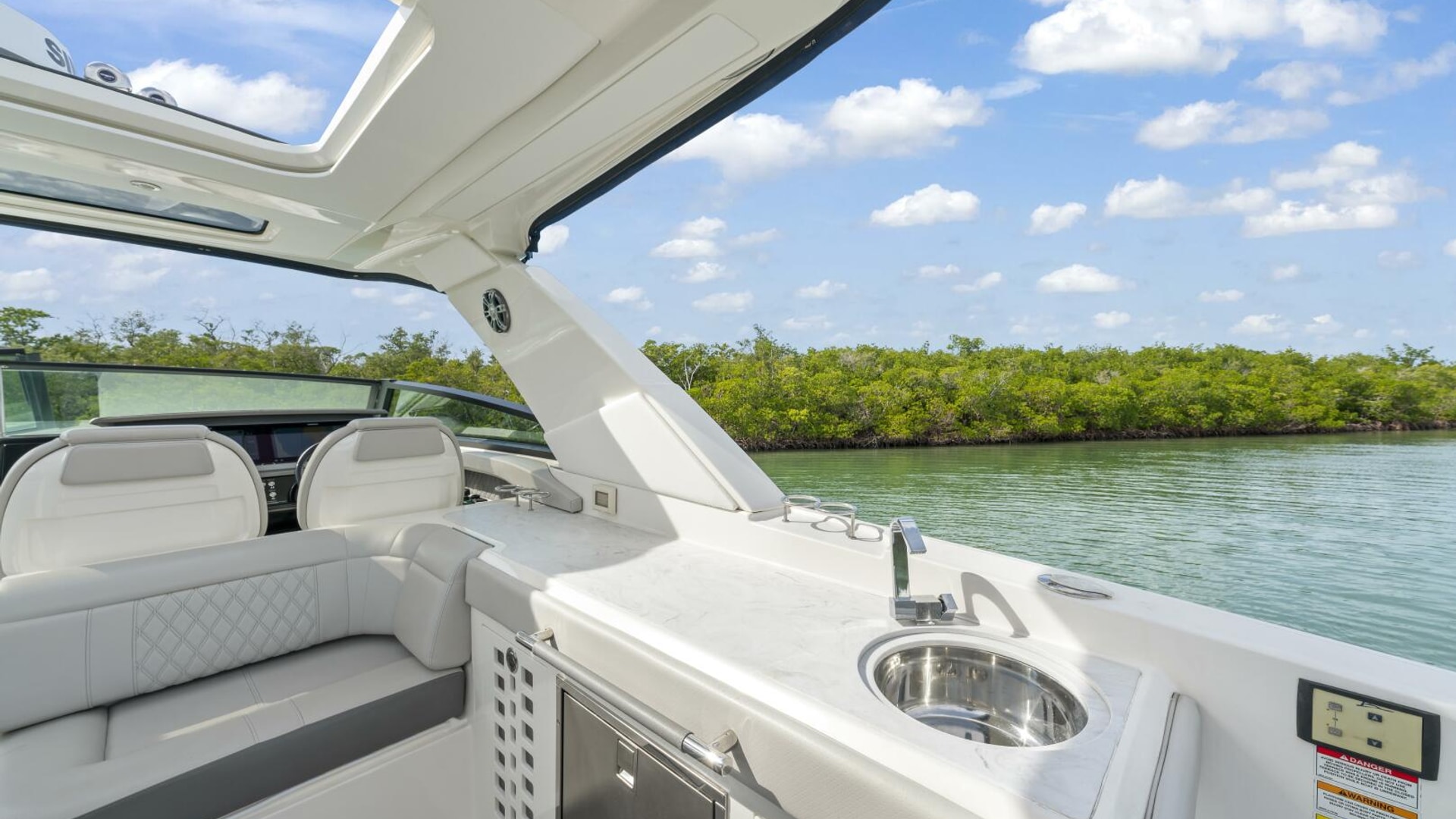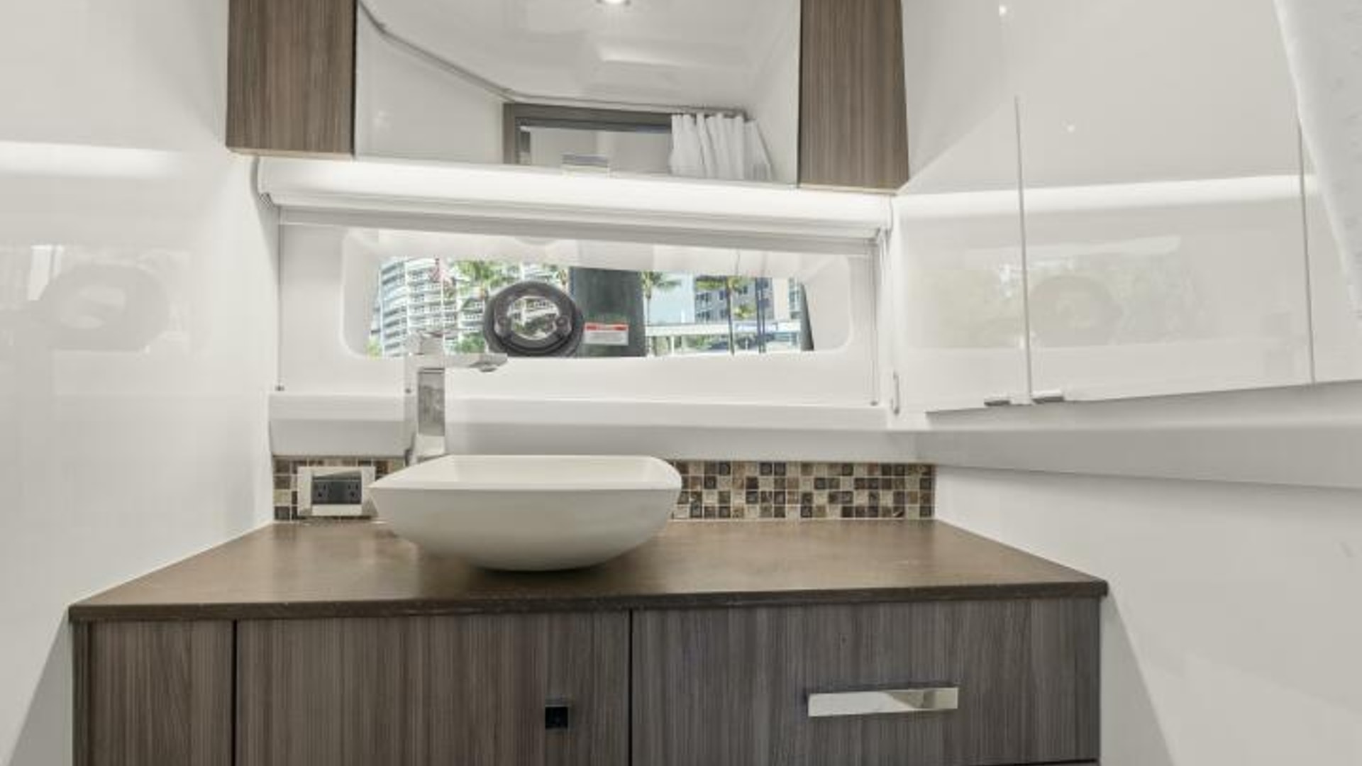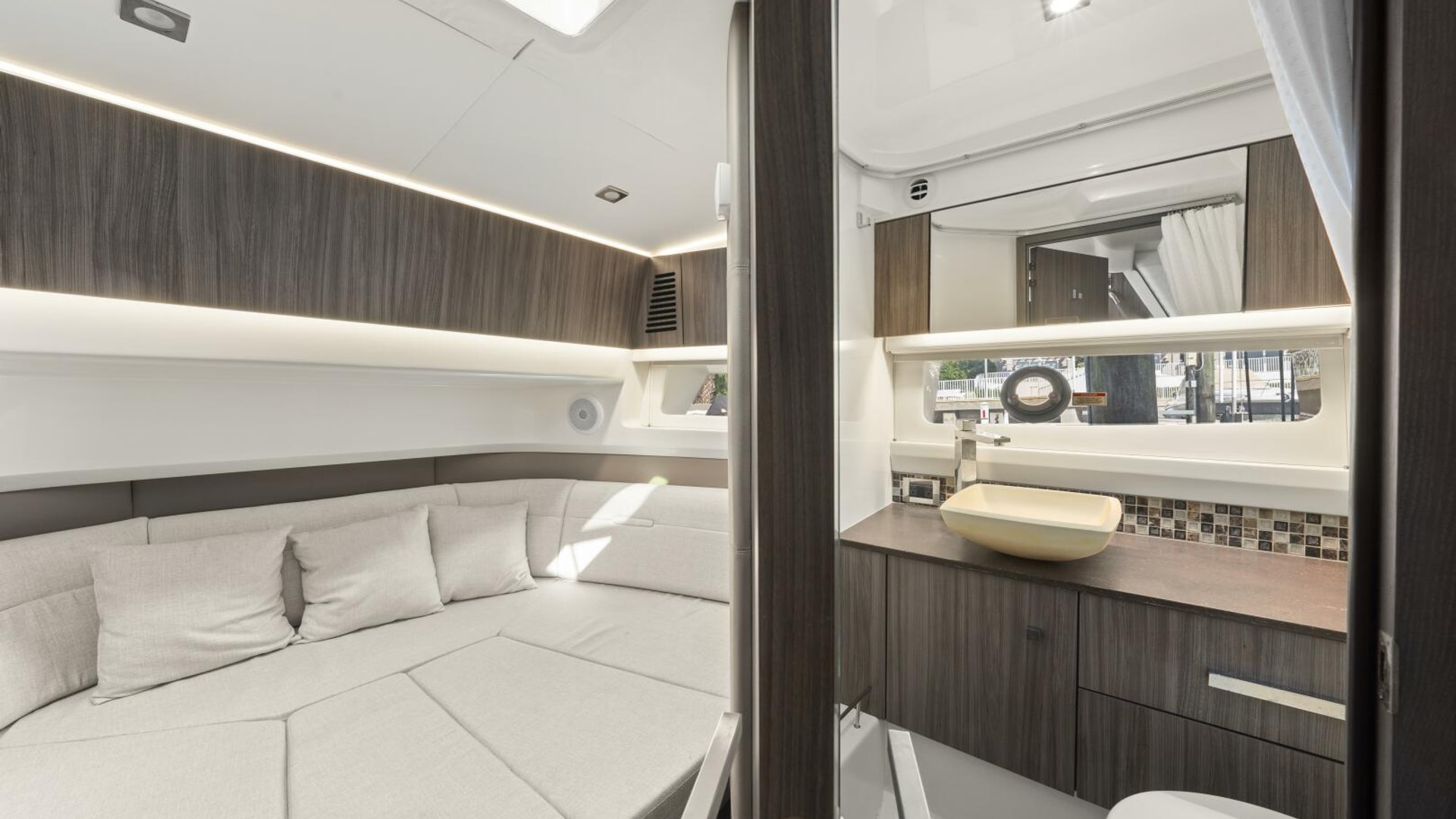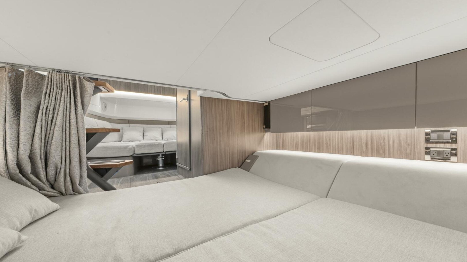 Excellence. An expansive cockpit social zone has a well-appointed wet bar with refrigerator, sink and available dual grills while the innovative fold-down swim terrace opens to extend the cockpit all the way to the water. Innovations, found throughout, include Joystick Piloting and Dual Digital Dash with standard 16” Simrad Touchscreen displays. Bring your friends... all of them. The SLX 400 Outboard has a generous cabin and expansive bow and cockpit seating. All of this and amenities for entertainment means hours and days of fun aboard this award-winning boat.