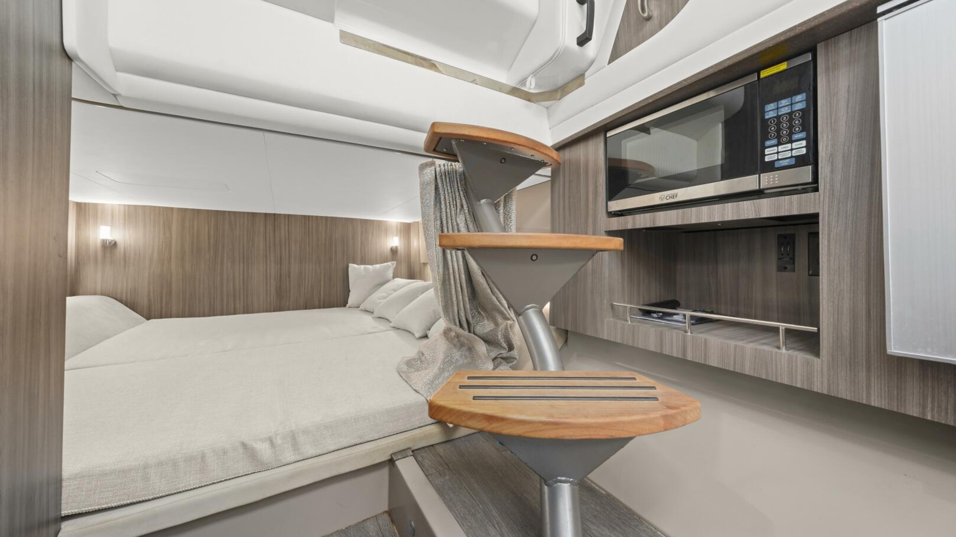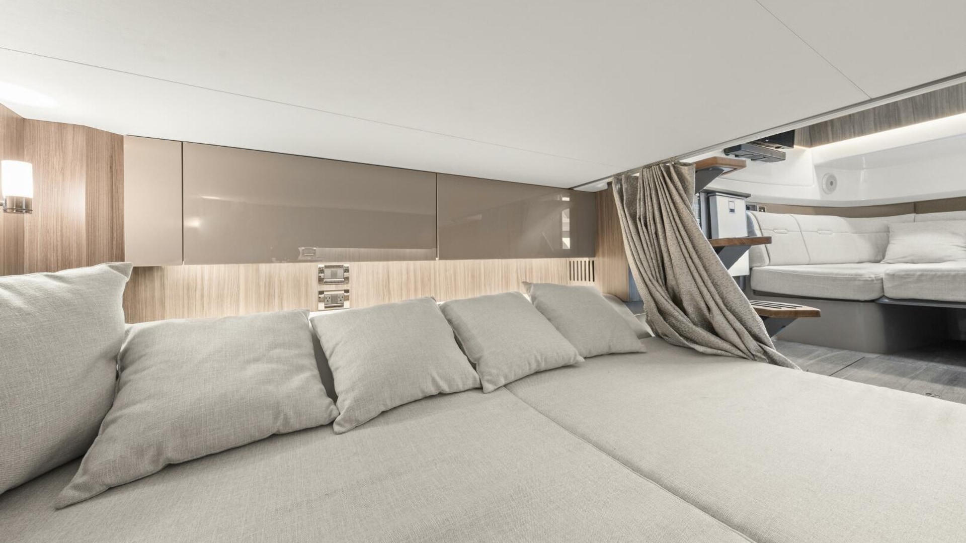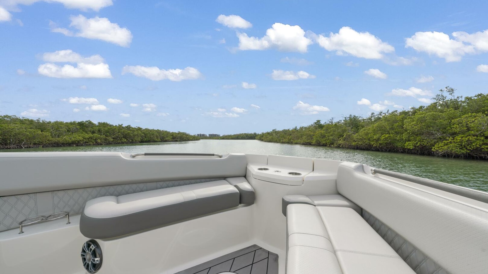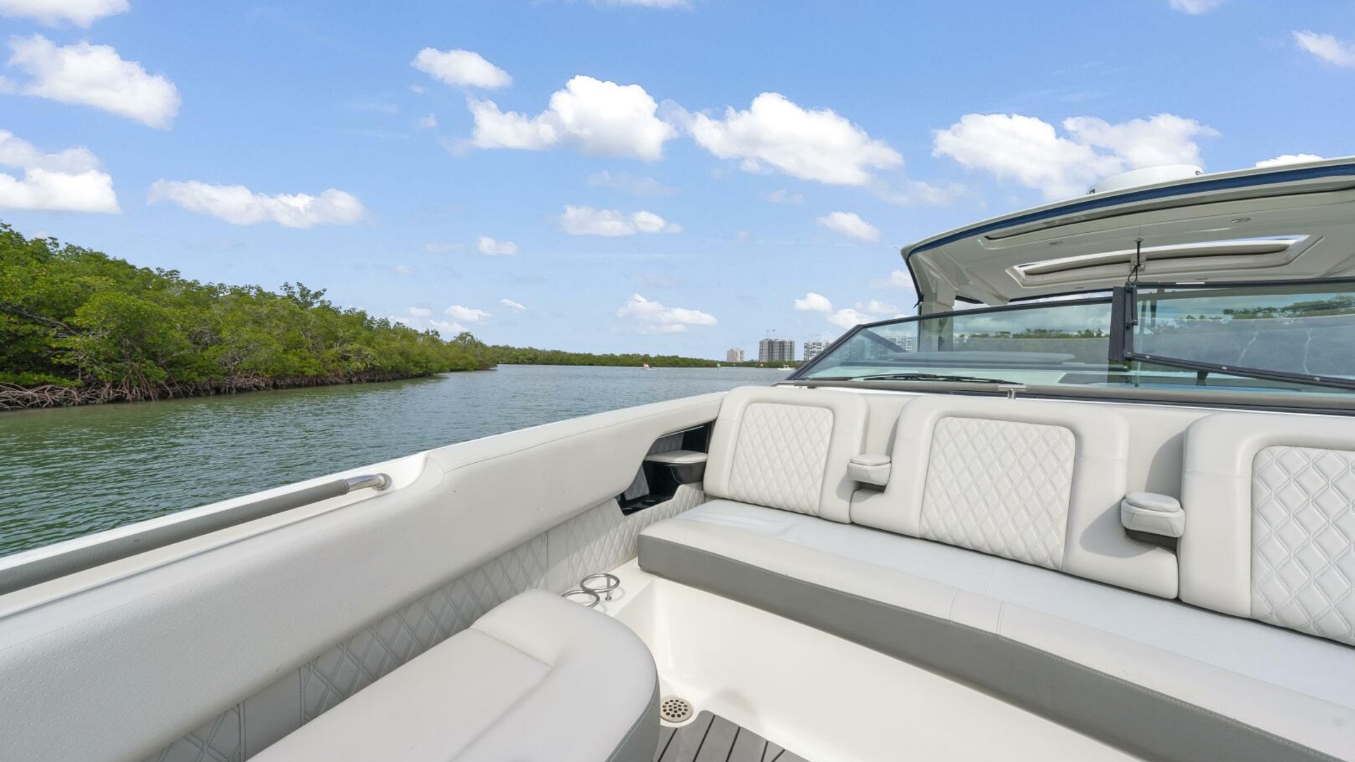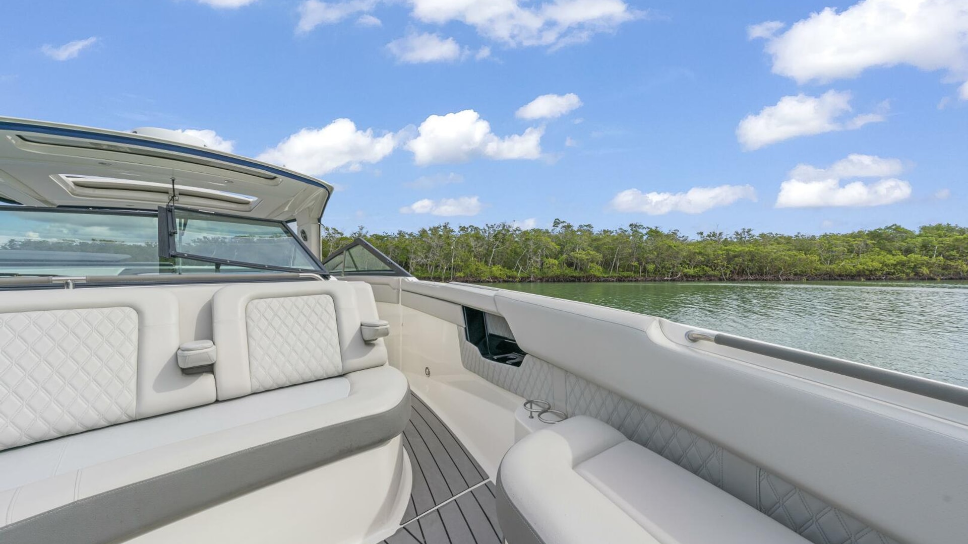Excellence. An expansive cockpit social zone has a well-appointed wet bar with refrigerator, sink and available dual grills while the innovative fold-down swim terrace opens to extend the cockpit all the way to the water. Innovations, found throughout, include Joystick Piloting and Dual Digital Dash with standard 16” Simrad Touchscreen displays. Bring your friends... all of them. The SLX 400 Outboard has a generous cabin and expansive bow and cockpit seating. All of this and amenities for entertainment means hours and days of fun aboard this award-winning boat.