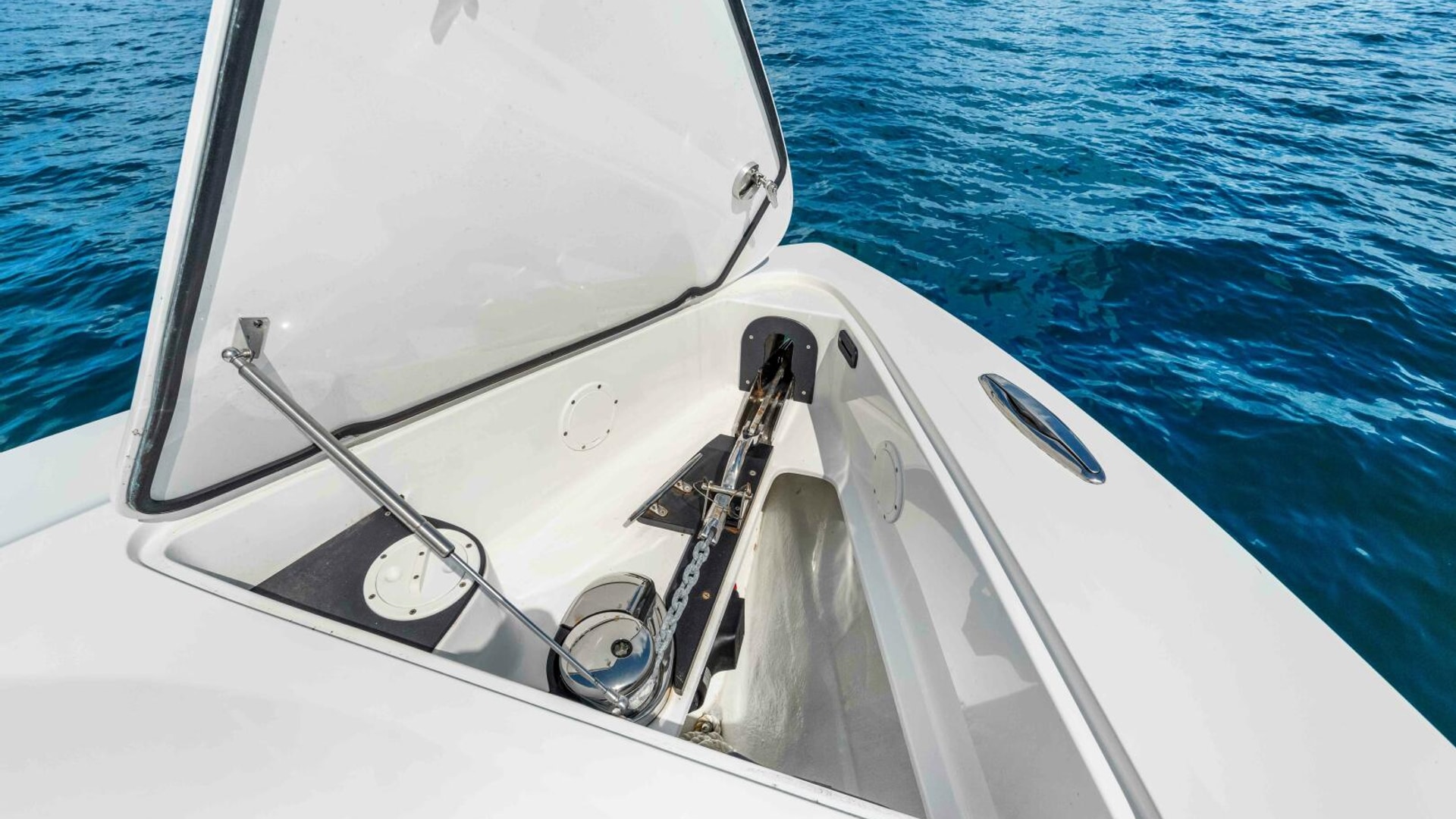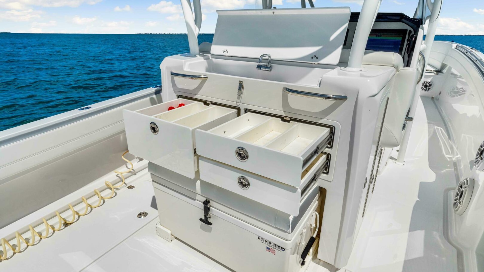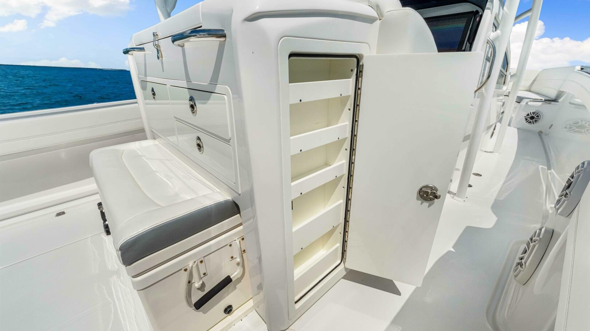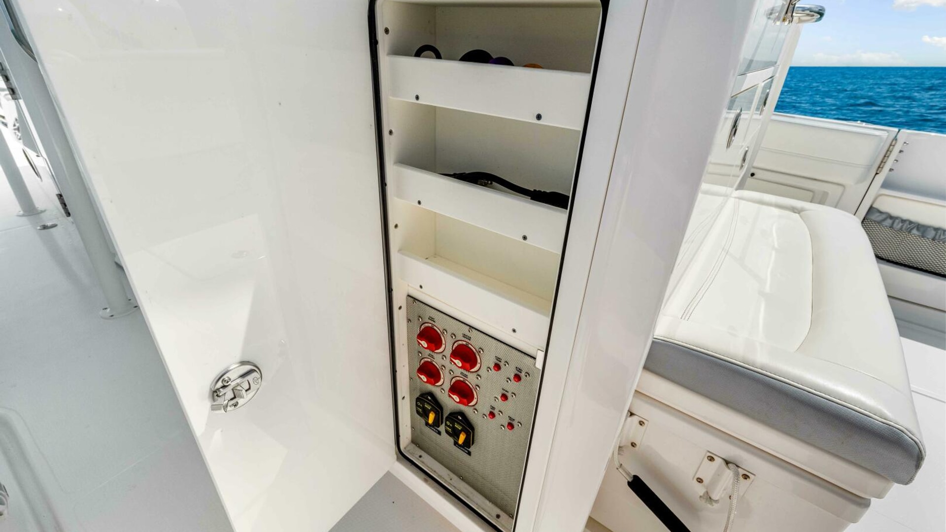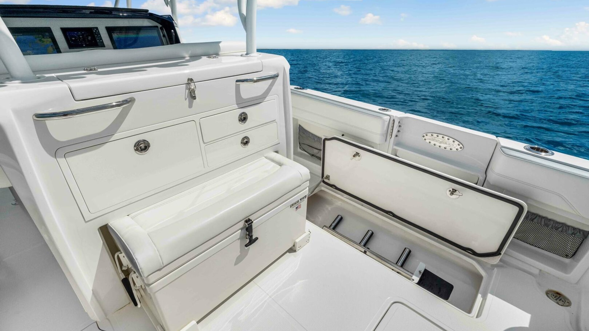 The boat is also outfitted for offshore fishing and features a Rhodan trolling motor with dedicated battery bank and charger located in the bow, outriggers, Live well in the transom with pull out bench seat, in floor fish boxes, ample rod storage and rod holders, a tackle station behind the helm chair.