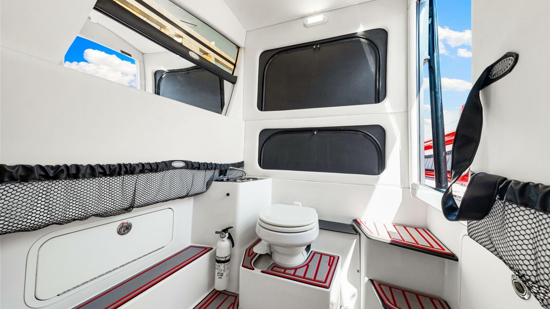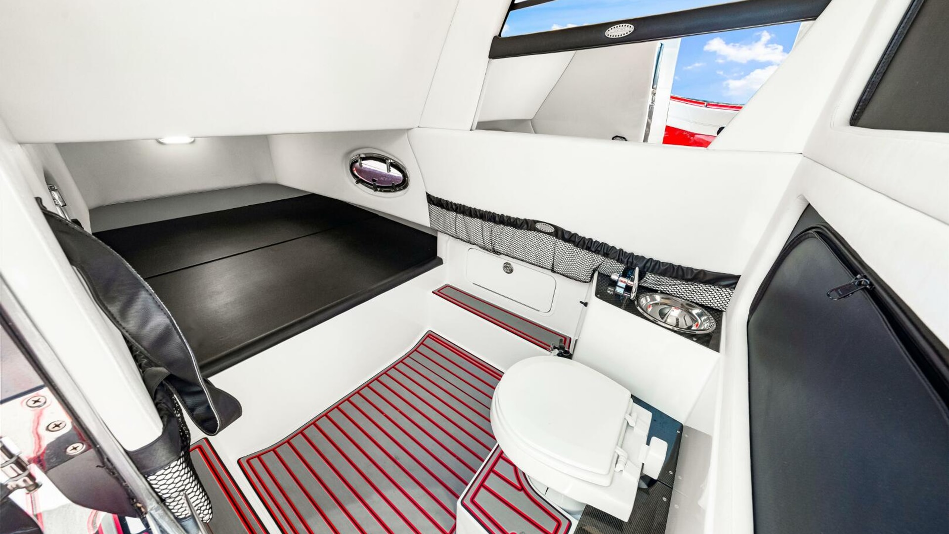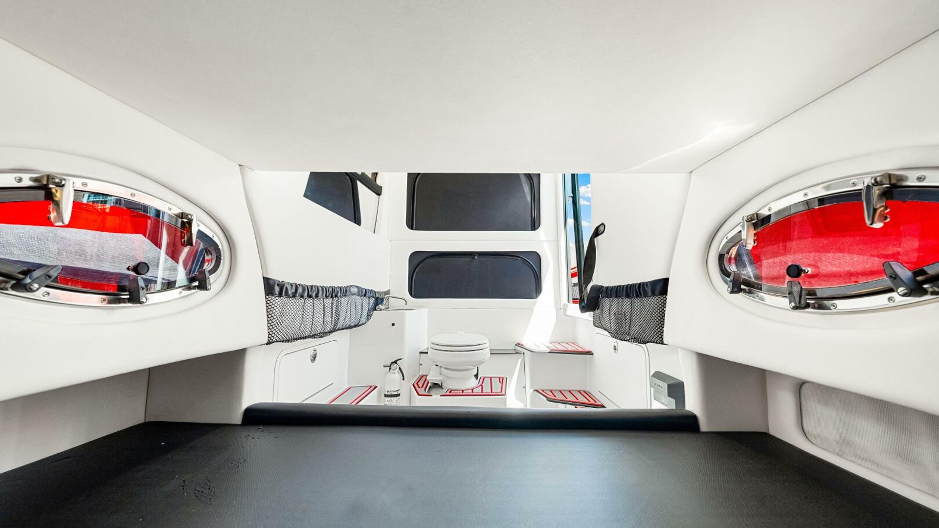 - Luxury Touches like premium upholstery, power-lift bow table, and full head compartment