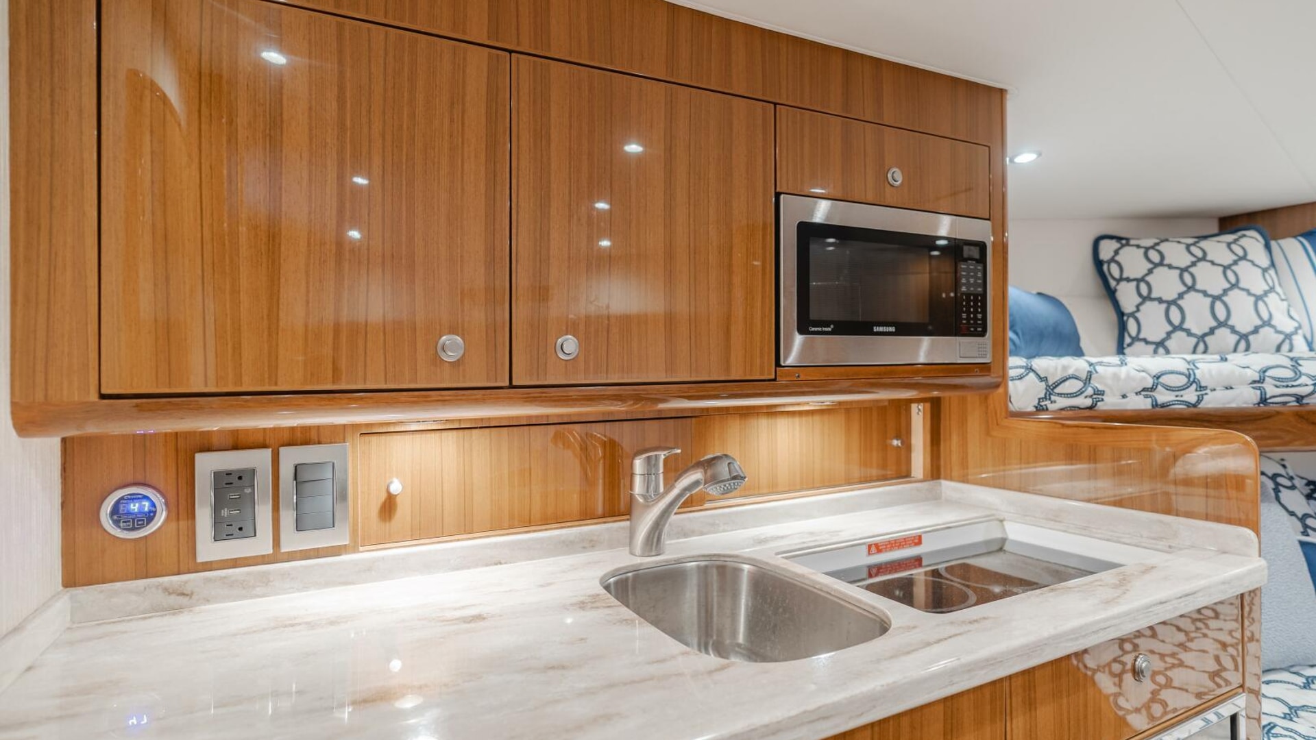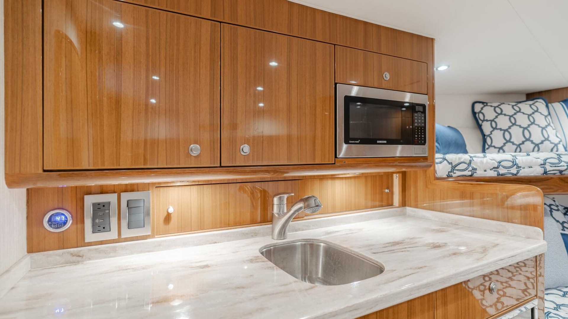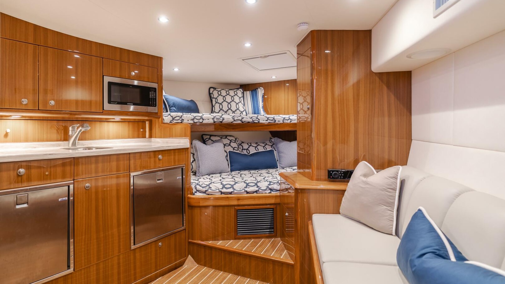 This 38 Viking open has been barely used and lift kept. The boat was shipped by truck so hours are extremely low on her powerful Cummins QSB 6.7L 550Hp diesels. She has extended engine warranty until 11/20/2025 and annual services have been done. Notable features include a SeaKeeper stabilizer, Onan 9kw generator, Palm Beach Towers hard top. She has a full Garmin electronics suite with a powerful 3KW transducer for her fish finder. Helm chairs are beautiful Release Marine teak ladderback clad in ultra-leather upholstery. The interior is tastefully decorated, and the owner added a custom teak interior table with removable base from Release Marine Tables. There is a nice galley to port with undercounter drawer refrigeration and a good-sized head with separate stall shower. This boat represents a great opportunity to have a like-new boat without the wait to build.