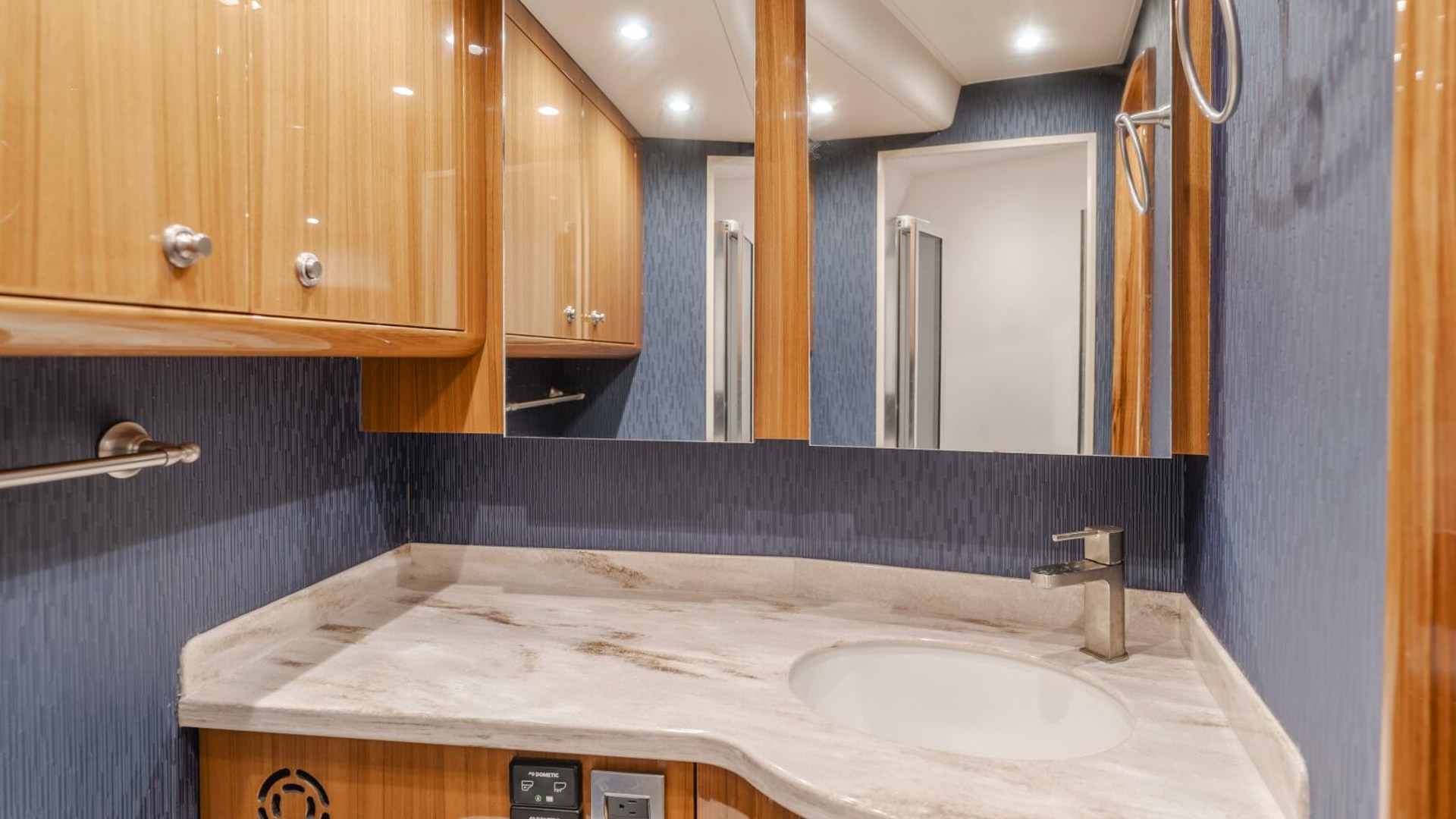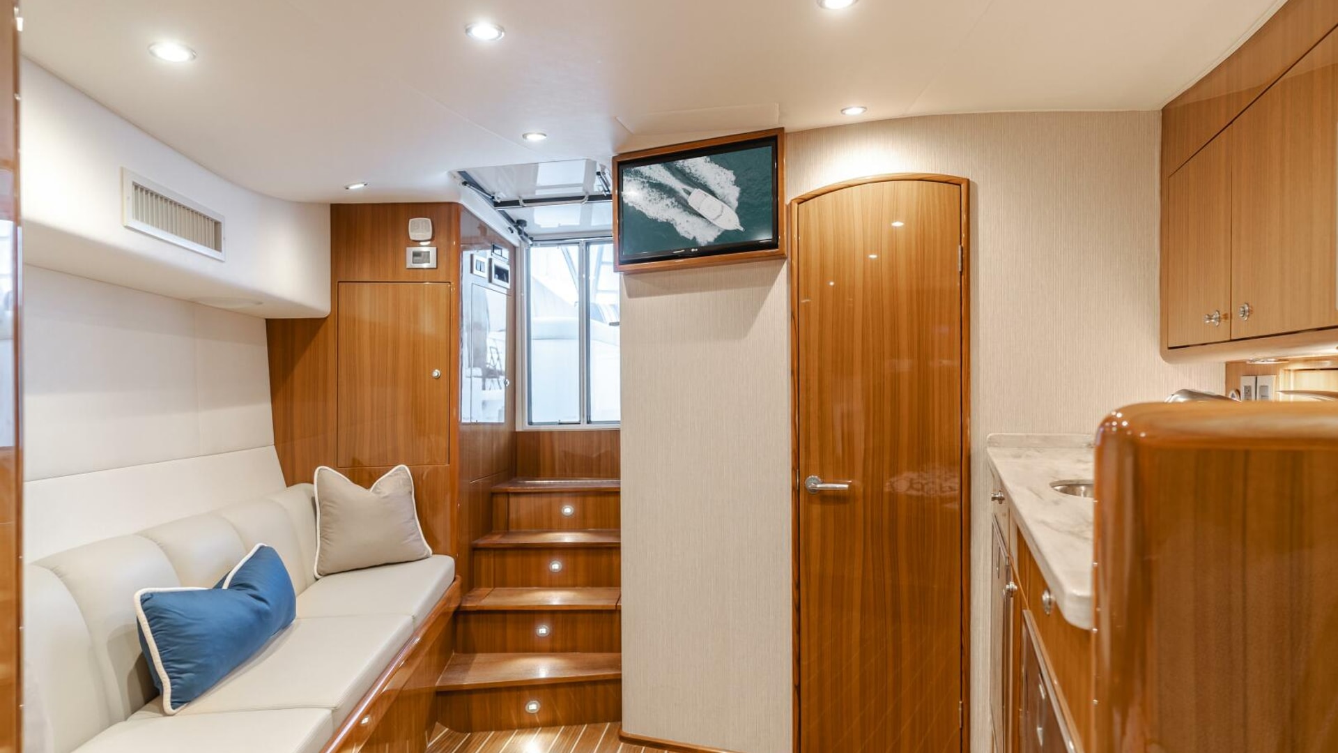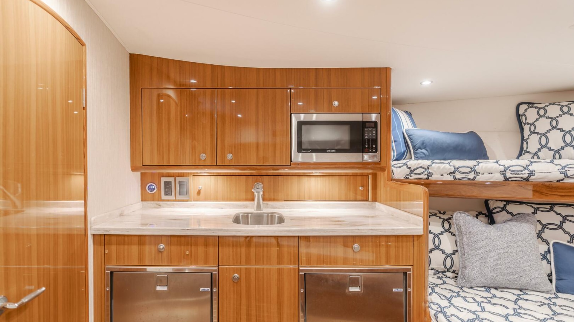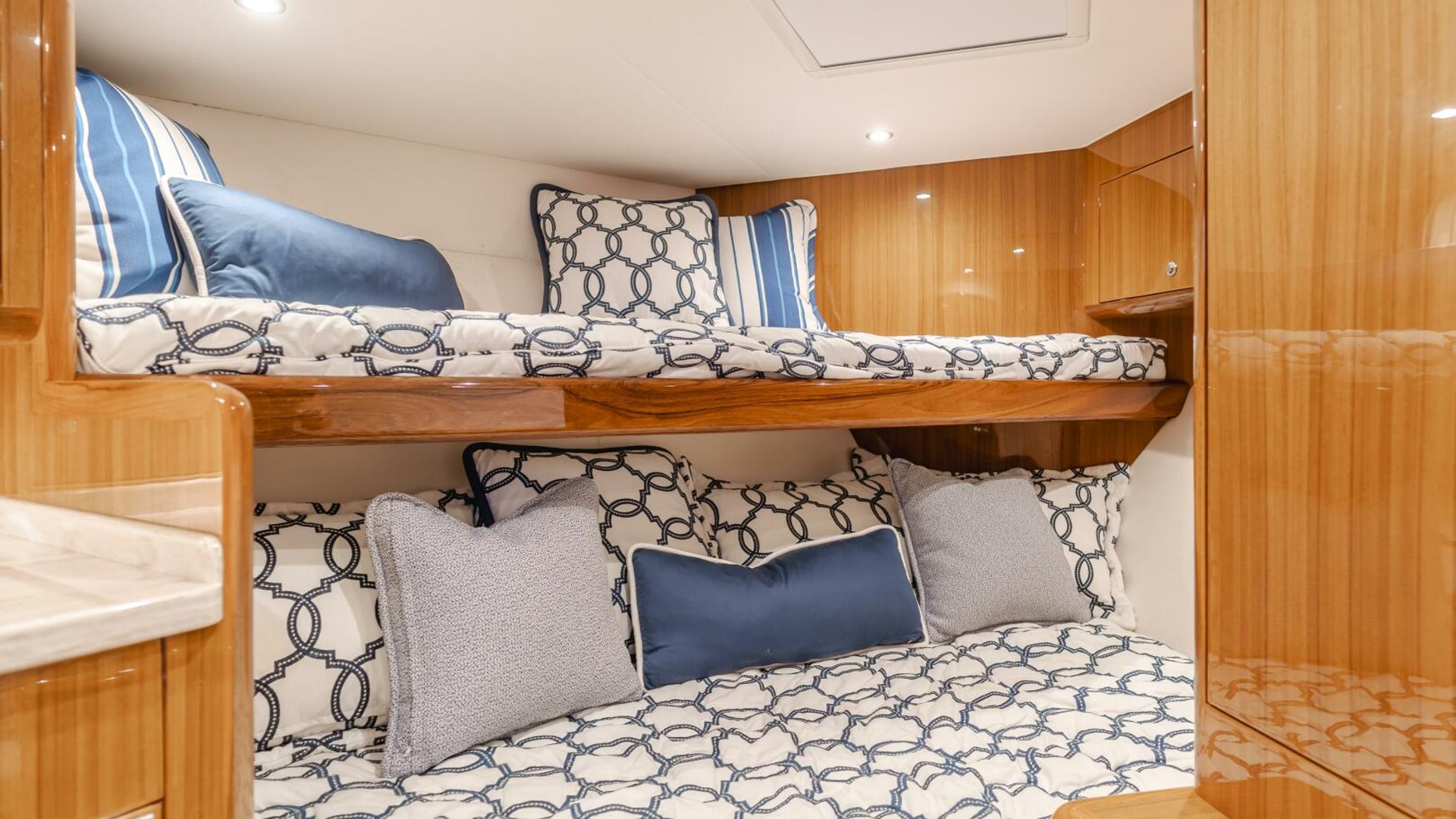 This 38 Viking open has been barely used and lift kept. The boat was shipped by truck so hours are extremely low on her powerful Cummins QSB 6.7L 550Hp diesels. She has extended engine warranty until 11/20/2025 and annual services have been done. Notable features include a SeaKeeper stabilizer, Onan 9kw generator, Palm Beach Towers hard top. She has a full Garmin electronics suite with a powerful 3KW transducer for her fish finder. Helm chairs are beautiful Release Marine teak ladderback clad in ultra-leather upholstery. The interior is tastefully decorated, and the owner added a custom teak interior table with removable base from Release Marine Tables. There is a nice galley to port with undercounter drawer refrigeration and a good-sized head with separate stall shower. This boat represents a great opportunity to have a like-new boat without the wait to build.