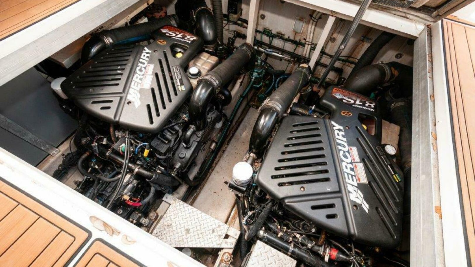 Equipped with twin 8.1 S Horizon Mercruiser V-drive engines, each offering 370HP, ensuring plenty of power for your adventures. Additionally, it features a Kohler 7.3E generator, providing reliable power for all onboard systems.