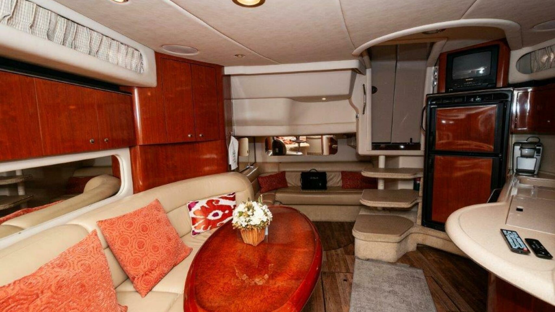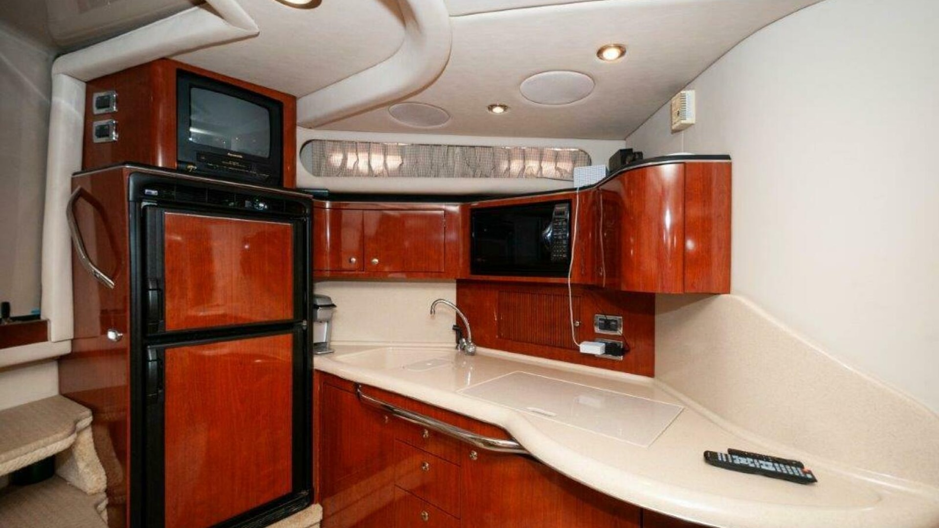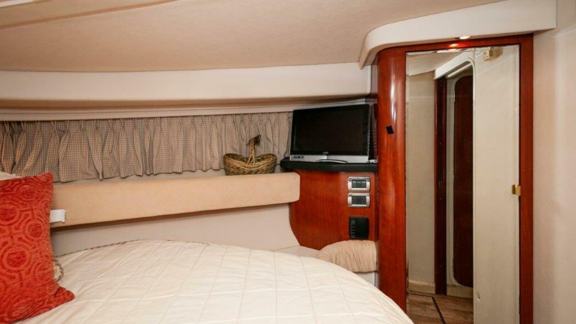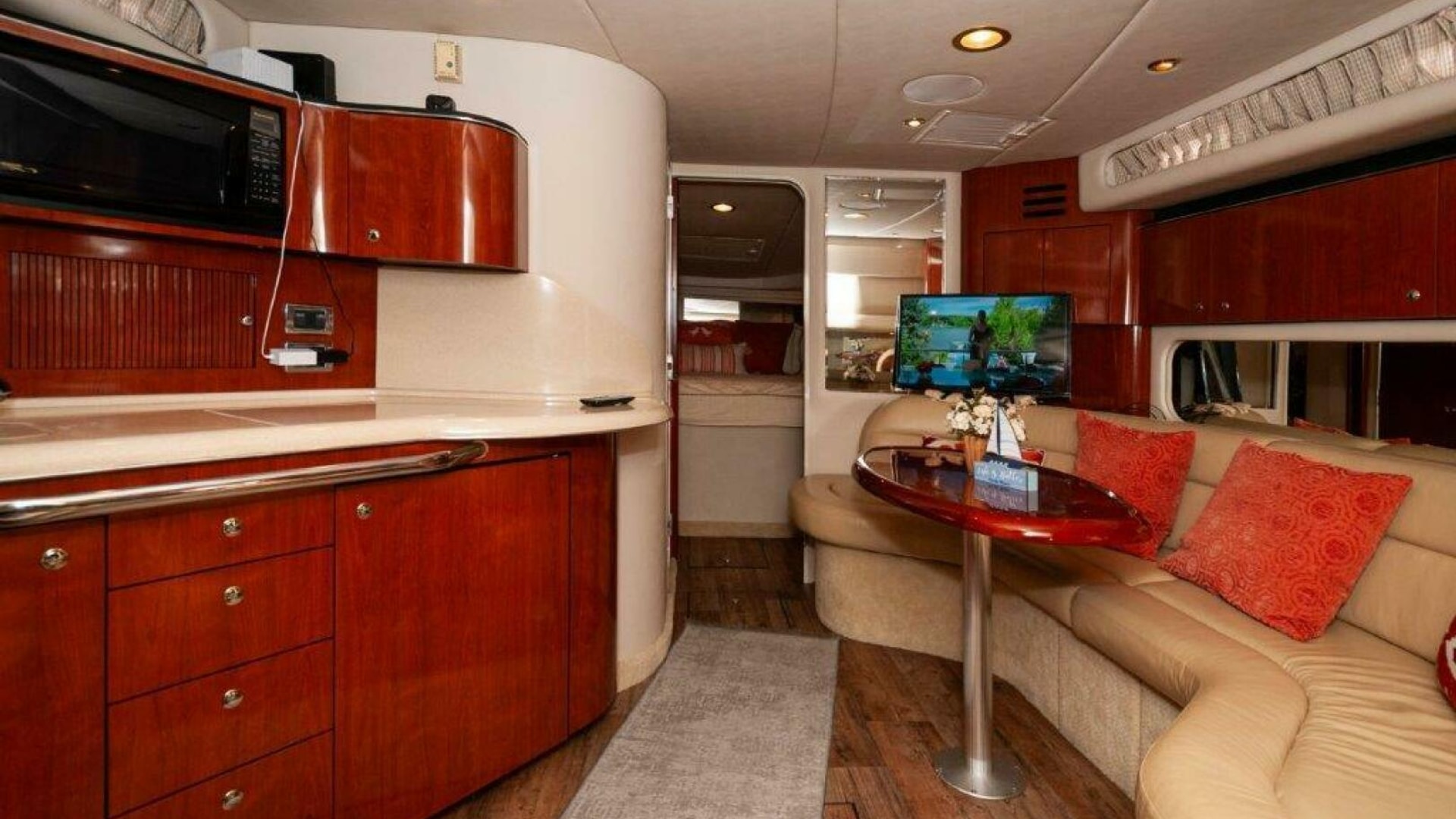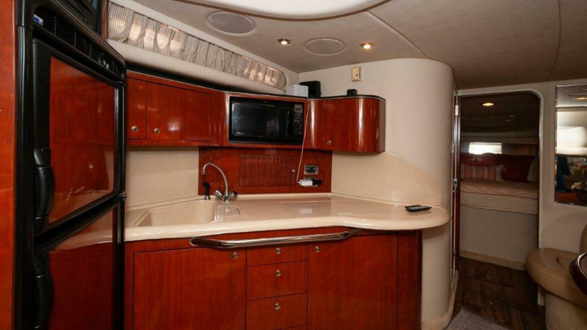 Inside, the cherry-finished cabin includes two staterooms and a mid-cabin lounge that converts to a double berth. The 10-foot salon sofa offers plenty of seating space for relaxation and socializing. The galley comes with everything you need: a refrigerator/freezer, recessed two-burner electric stove, microwave and sink. Cooking onboard is easy and convenient. The master stateroom provides a comfortable retreat with ample storage, while the mid-cabin offers flexible sleeping arrangements for guests. Enjoy the full entertainment system for music and movies.