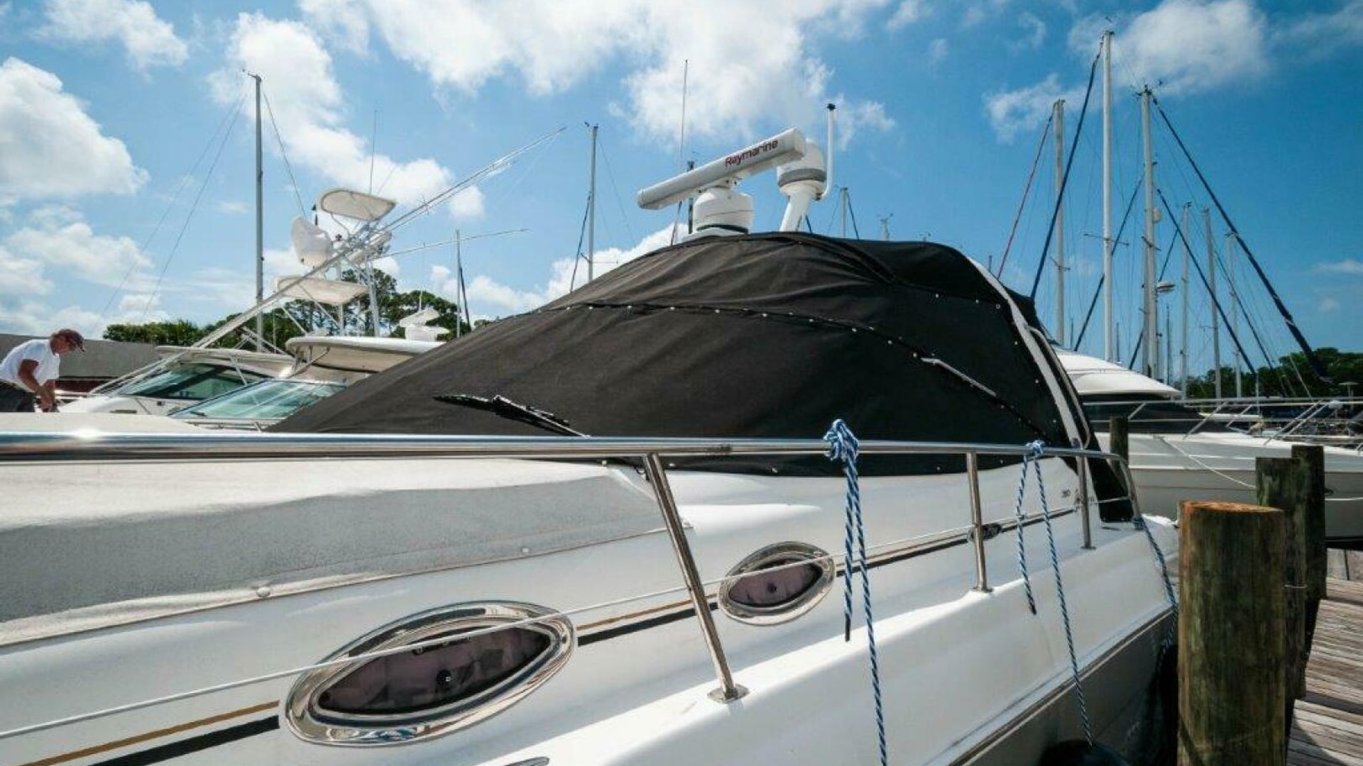 Recent upgrades include new Raymarine Navigation Equipment (2023), new flooring (2023), new hull paint (2023), new Canvas (2023), new battery charger and cockpit fridge (2025)