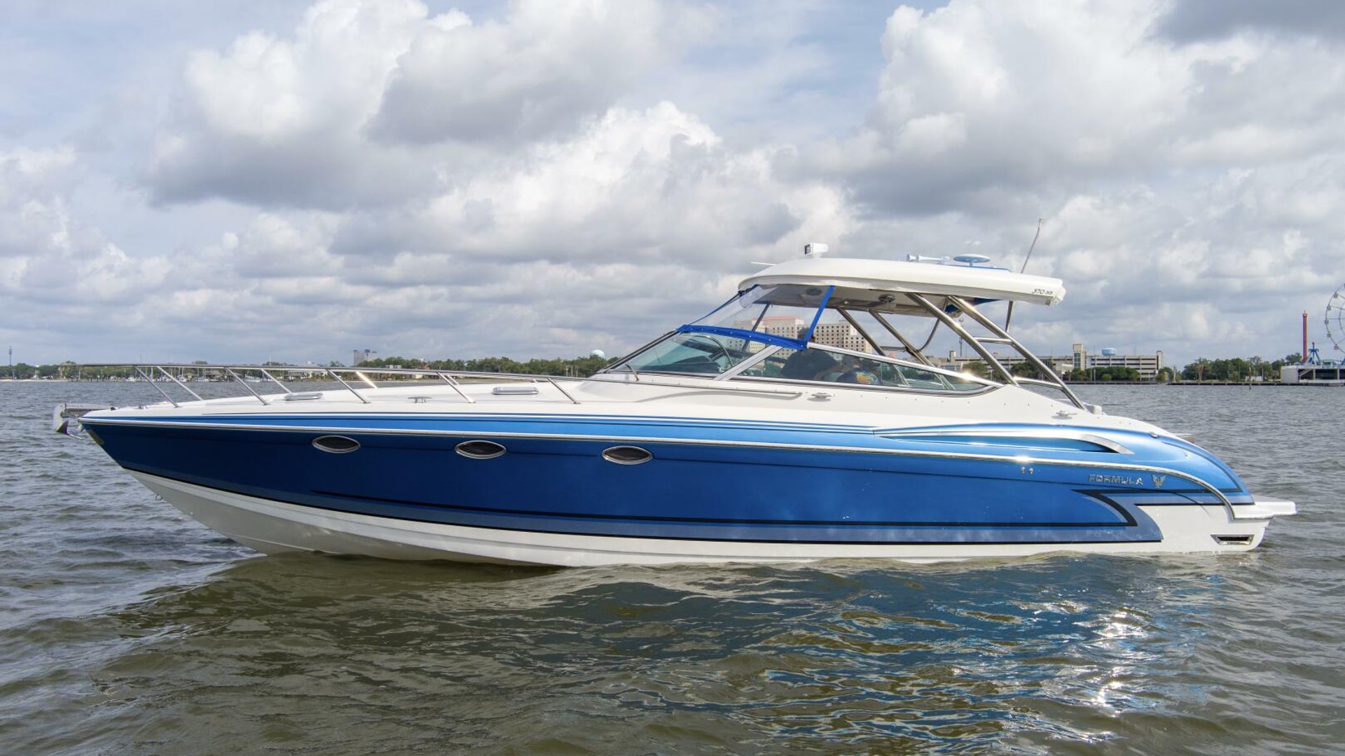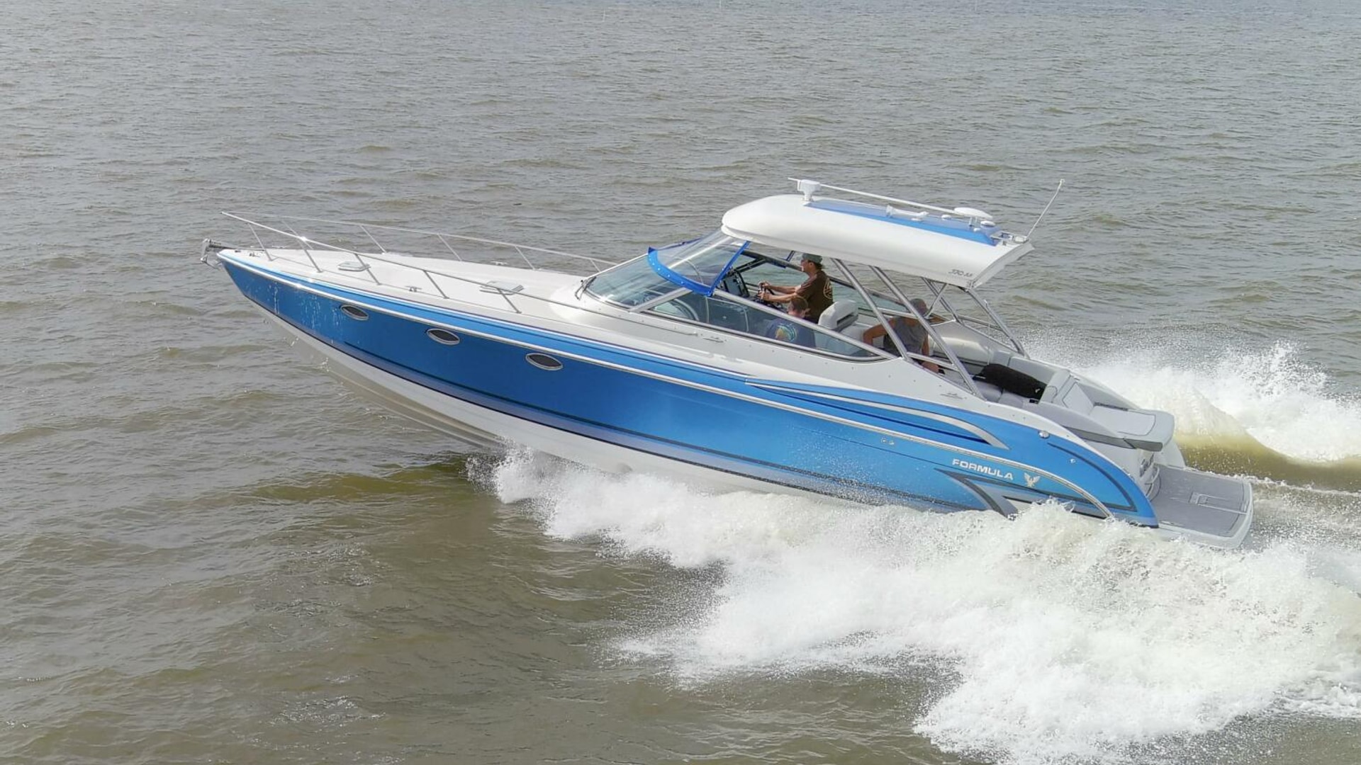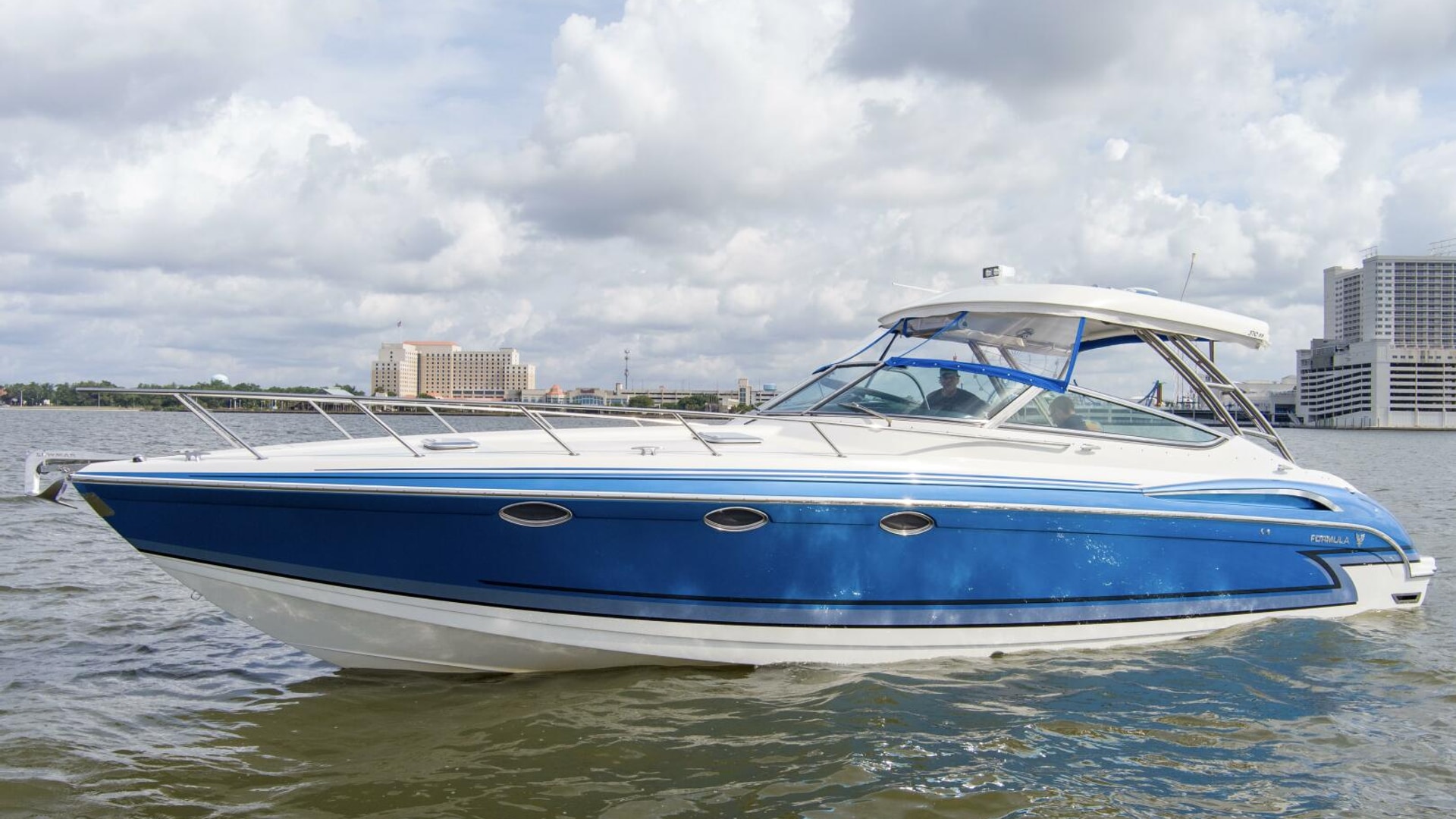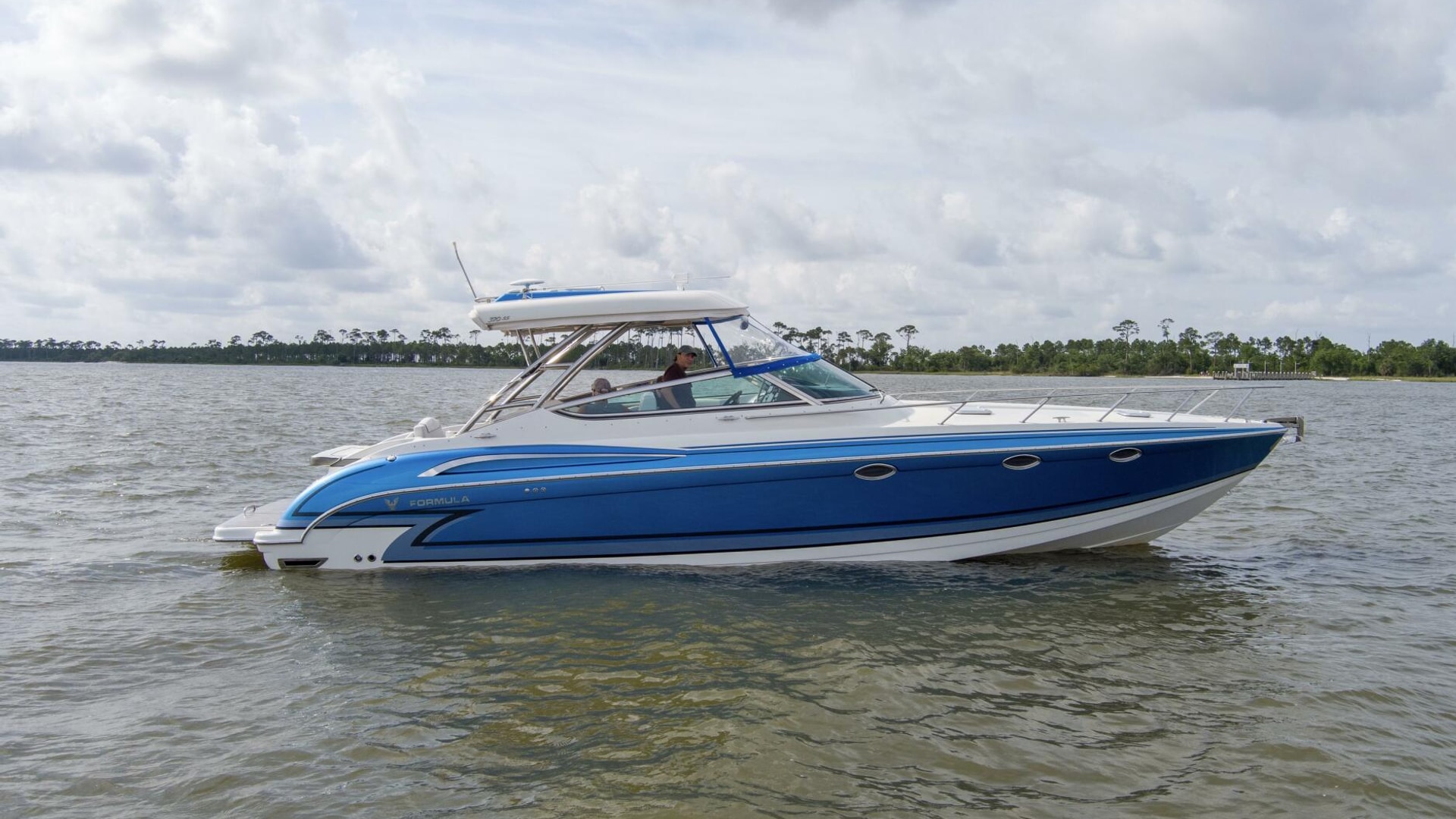 The 2017 Formula 370 Super Sport “Bluebird” is a sleek, aggressively styled sport cruiser with an enviable combination of superior construction, first-rate accommodations, and excellent open-water performance. She’s basically a Euro-style sport boat with considerably more cockpit space and less interior volume than traditional express cruisers. Performance is important in a boat like this, and the 370’s narrow beam and high-speed stepped hull deliver the fast ride and luxurious accommodations that few other sport boats can match. Her spacious and well-equipped cockpit provides seating and amenities for a small crowd. A removable cocktail table stores in a transom storage locker, and a cockpit galley comes complete with a sink, cooler, and refrigerator. The cabin of the 370-among the more impressive in her class, includes a wraparound V-berth, dinette forward, mid-berth cabin aft, and a compact galley to port with stove and refrigerator. Additional features include a walkthrough windshield, transom shower, tilt steering, and a flip-flop bolster seat at the helm.