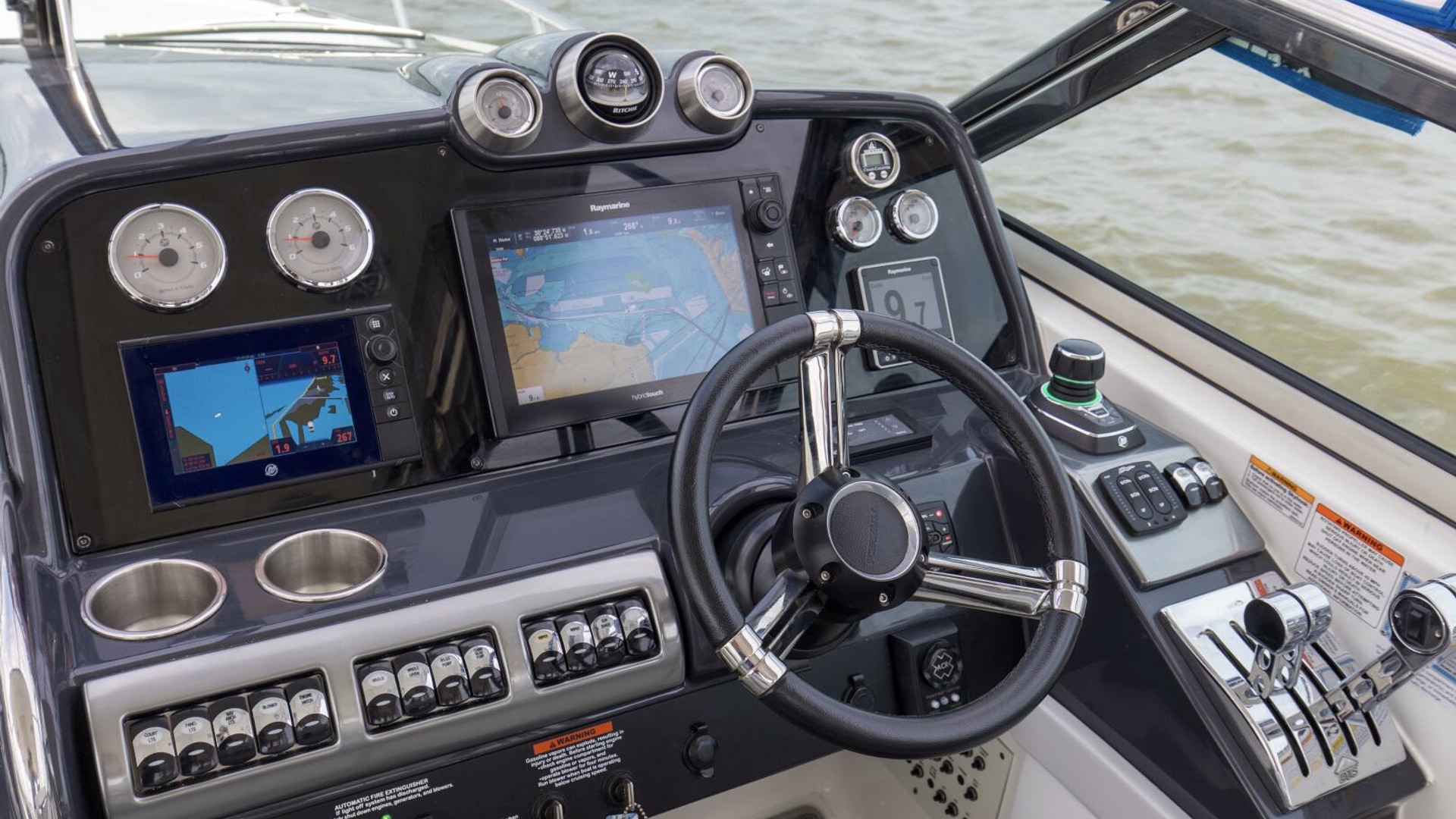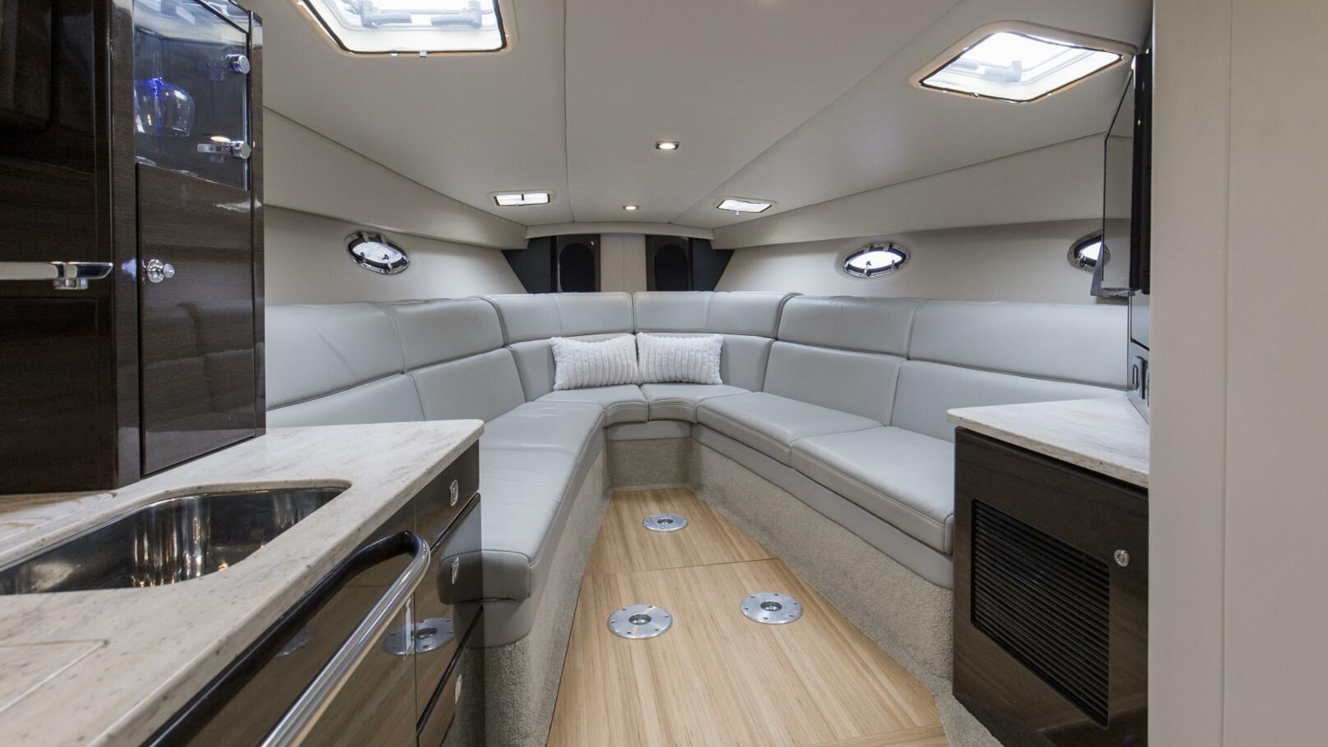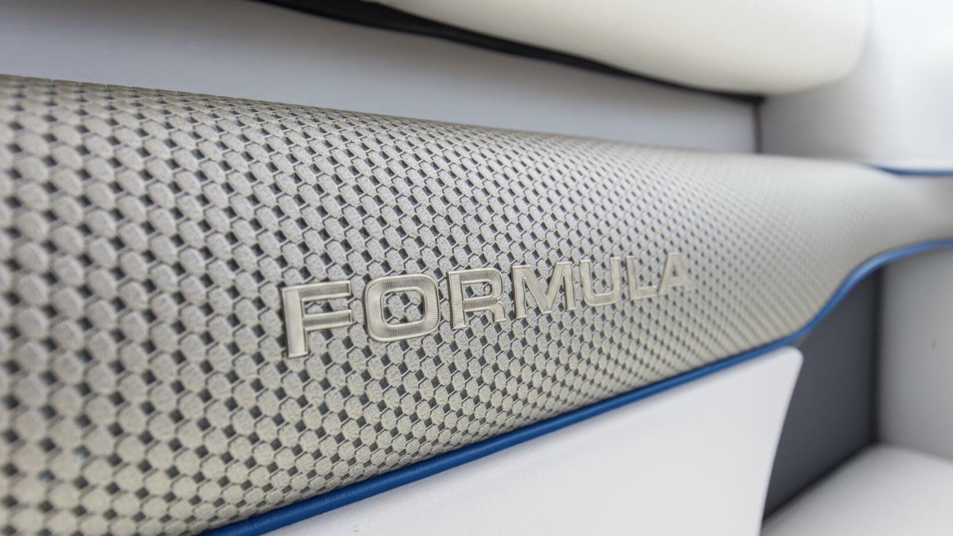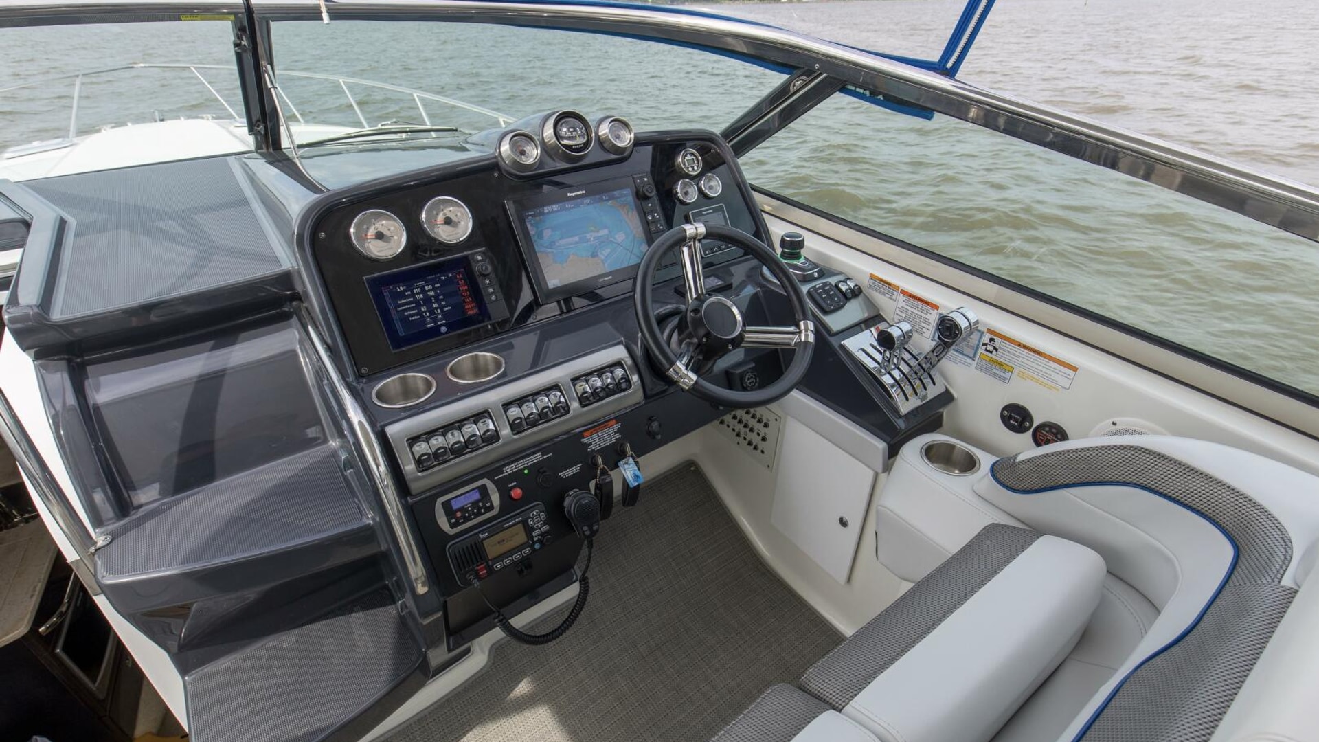 The 2017 Formula 370 Super Sport “Bluebird” is a sleek, aggressively styled sport cruiser with an enviable combination of superior construction, first-rate accommodations, and excellent open-water performance. She’s basically a Euro-style sport boat with considerably more cockpit space and less interior volume than traditional express cruisers. Performance is important in a boat like this, and the 370’s narrow beam and high-speed stepped hull deliver the fast ride and luxurious accommodations that few other sport boats can match. Her spacious and well-equipped cockpit provides seating and amenities for a small crowd. A removable cocktail table stores in a transom storage locker, and a cockpit galley comes complete with a sink, cooler, and refrigerator. The cabin of the 370-among the more impressive in her class, includes a wraparound V-berth, dinette forward, mid-berth cabin aft, and a compact galley to port with stove and refrigerator. Additional features include a walkthrough windshield, transom shower, tilt steering, and a flip-flop bolster seat at the helm.
