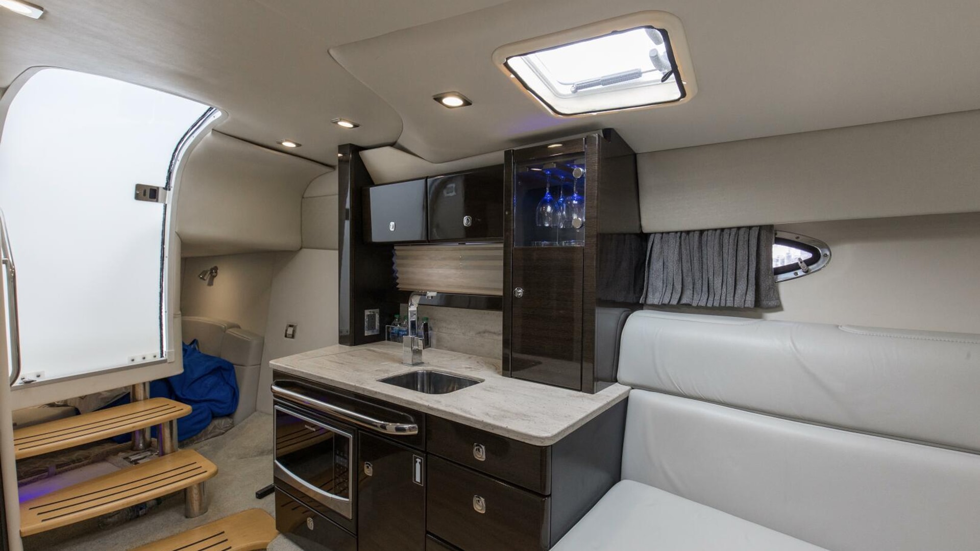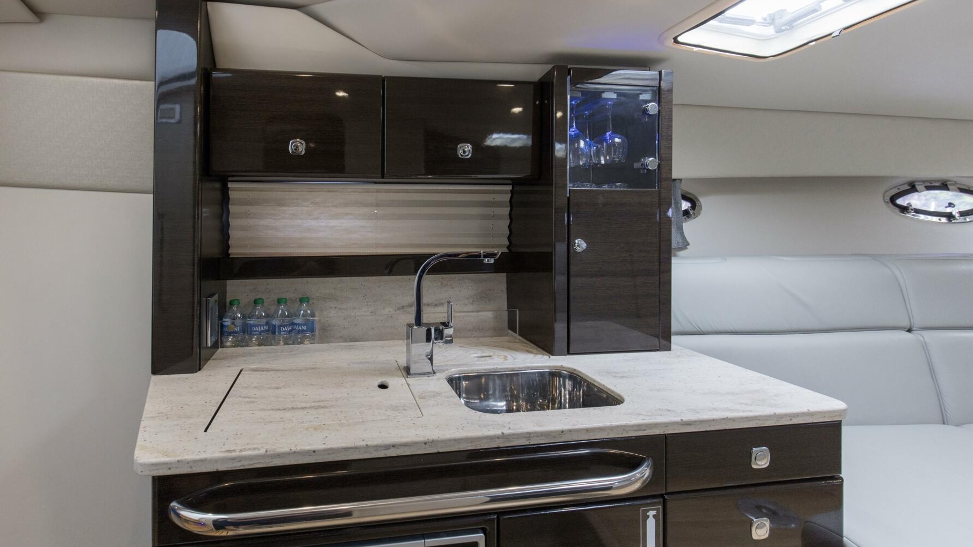 - Complete galley in high-gloss Deep Cherry finish w/storage & hardwood dovetailed drawers, full Corian countertop, 120V/12V polished stainless steel refrigerator, polished stainless steel sink, concealed electric stove w/safety shut-off switch, microwave oven, Krups® 5-speed blender & concealed trash container