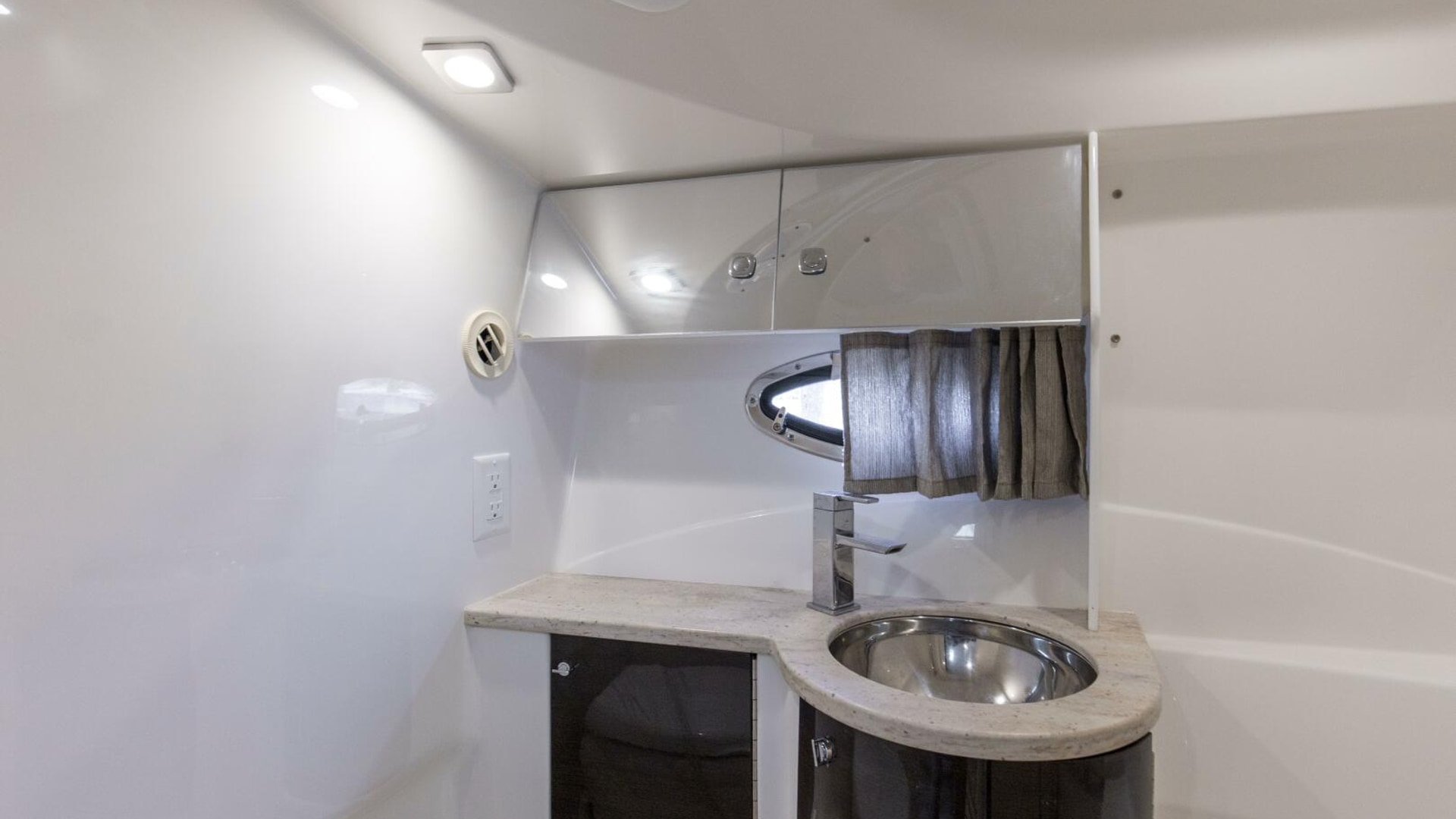 - Molded private head compartment w/vanity, high-gloss Deep Cherry-finish lower doors, Corian countertop, polished stainless steel sink w/swivel faucet, porcelain Flush and Forget® VacuFlush® head unit, 50-gallon holding tank & dockside pumpout, separate shower area w/molded-in seat & exhaust fan