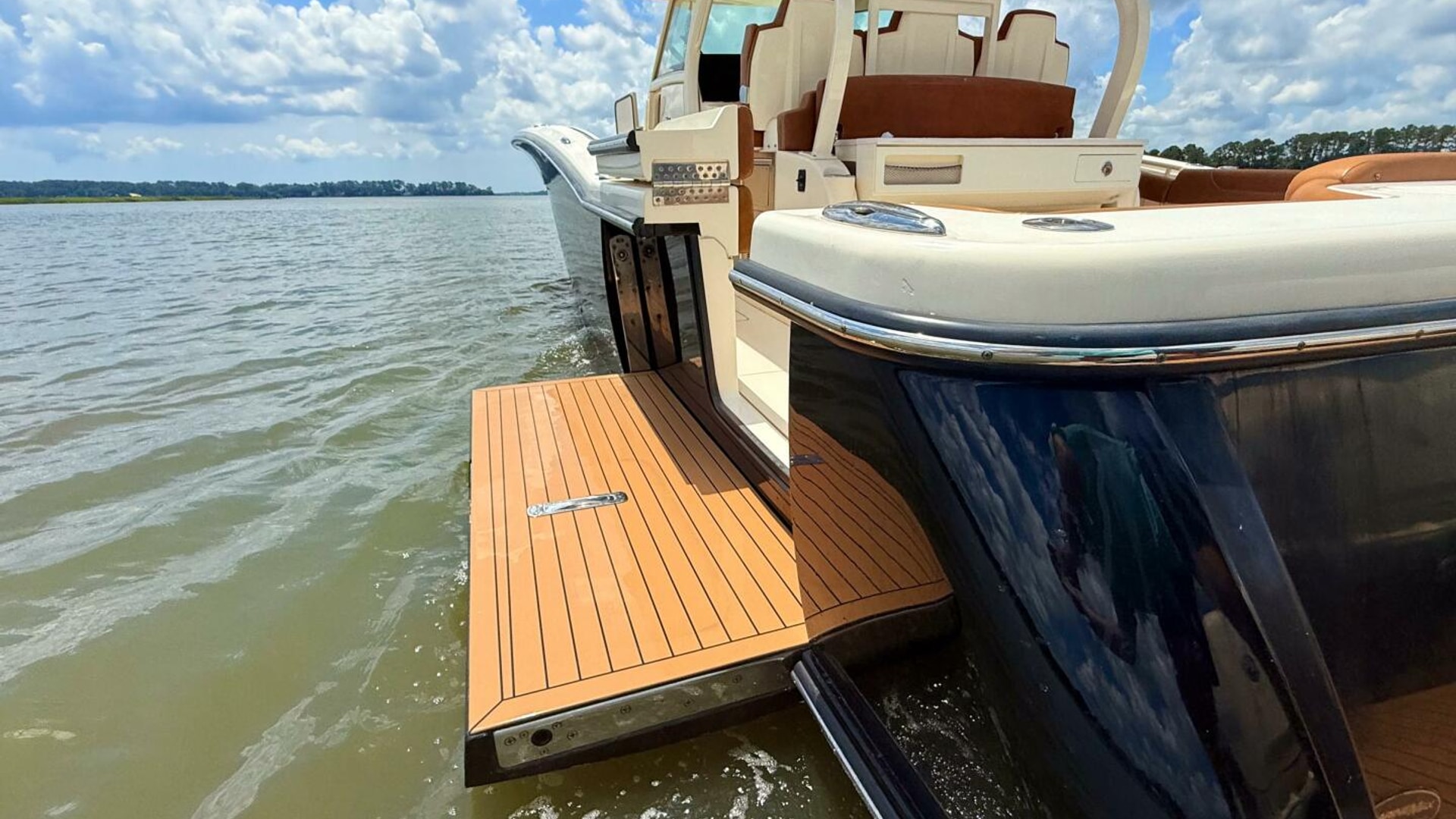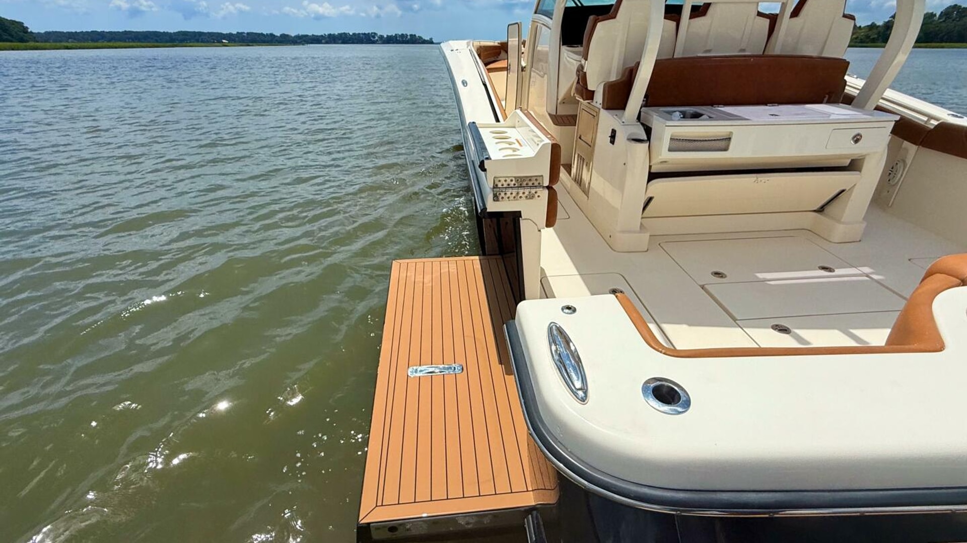 - Synthetic Teak Swim Platform, Transom Door, Aft Facing Seat Step & Helm Footrest