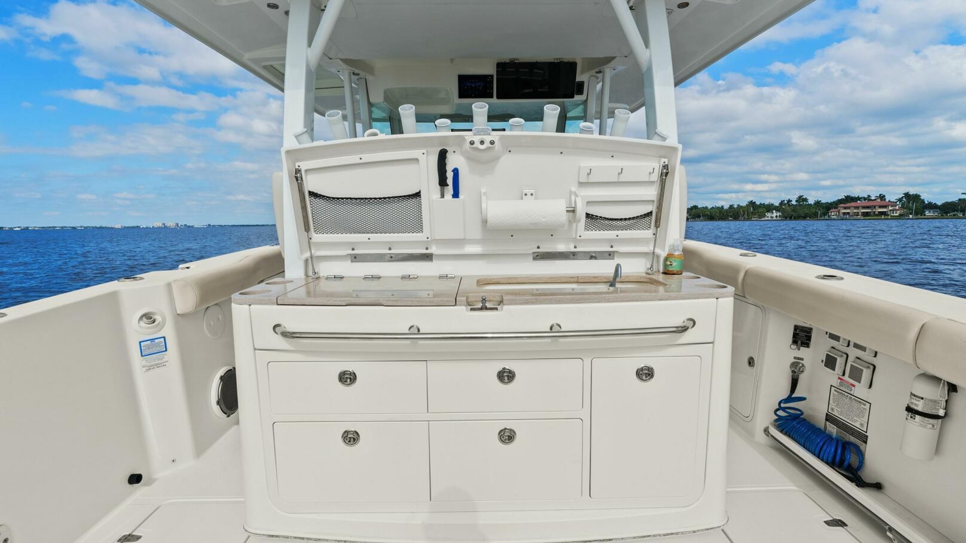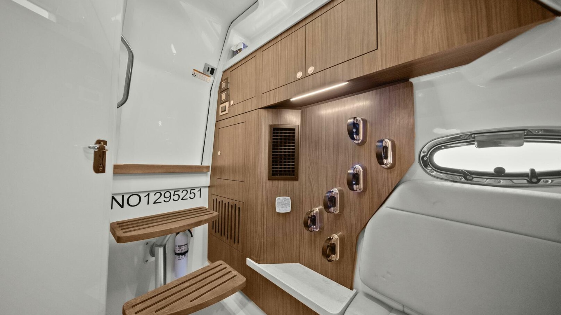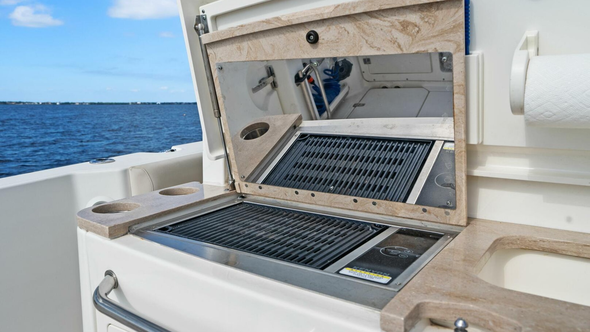 The cockpit is designed with comfort and convenience in mind, featuring a spacious summer kitchen, retractable sunshade, and aft teak tables. The air-conditioned helm provides cooling across all three seats, ensuring comfort even on the warmest days.