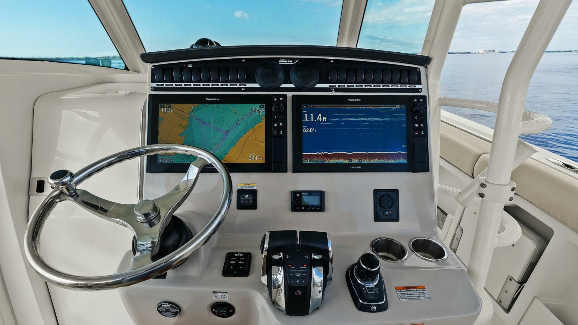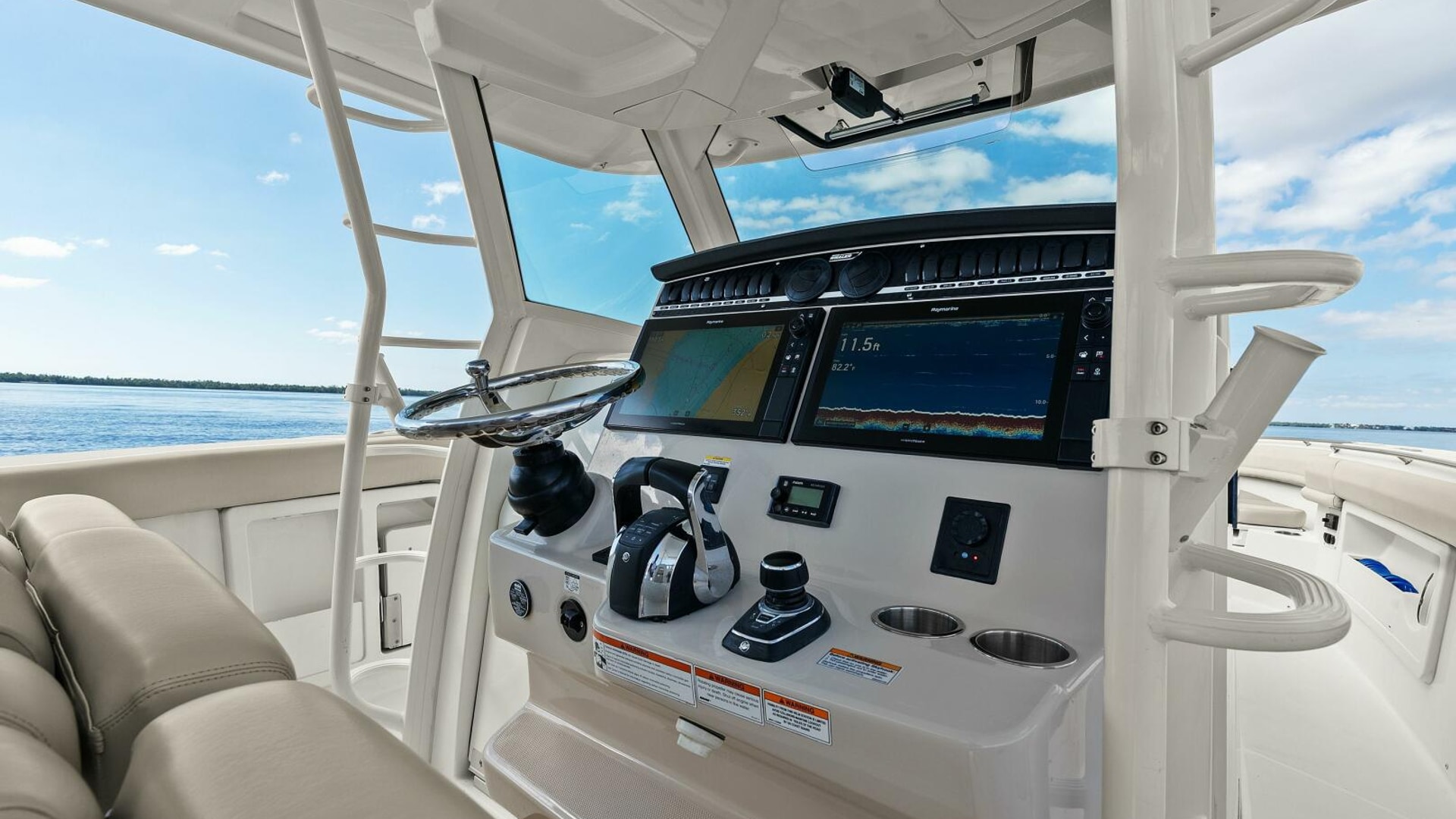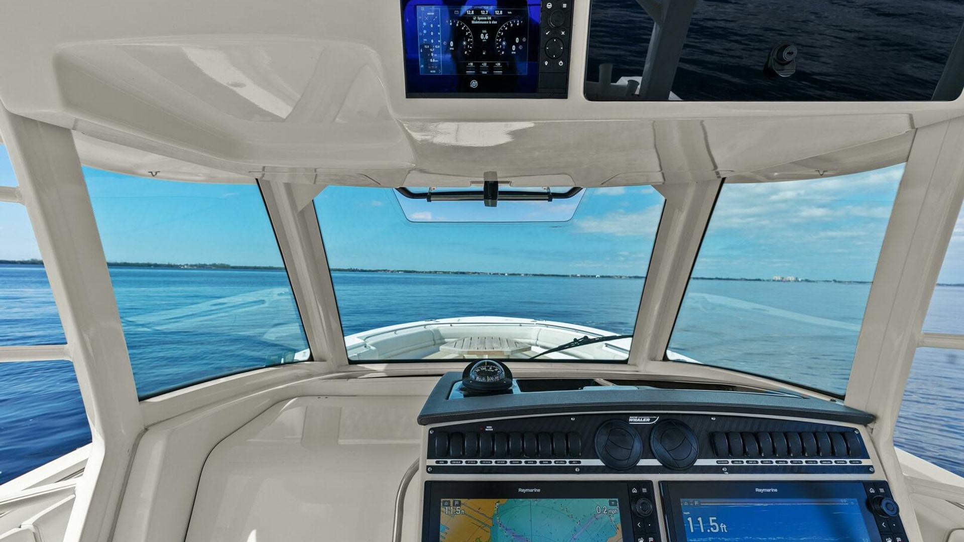 Equipped with premium electronics, including dual Raymarine Axiom 16” displays, a 3D transducer, Raymarine Magnum open array radar, Ray 50 VHF with 8’ antenna, and a Fusion stereo system, you’ll have everything you need for confident navigation and entertainment offshore.