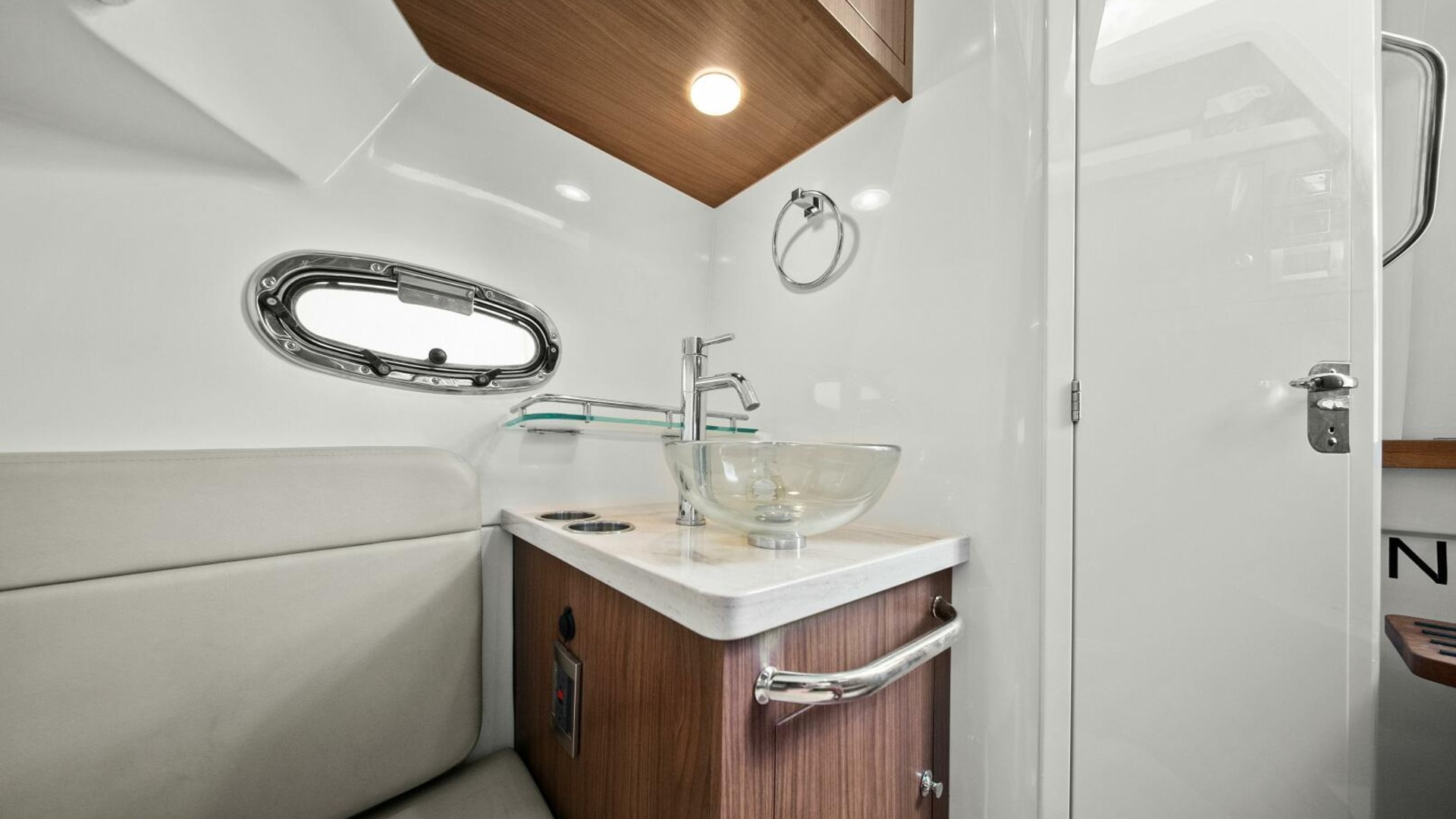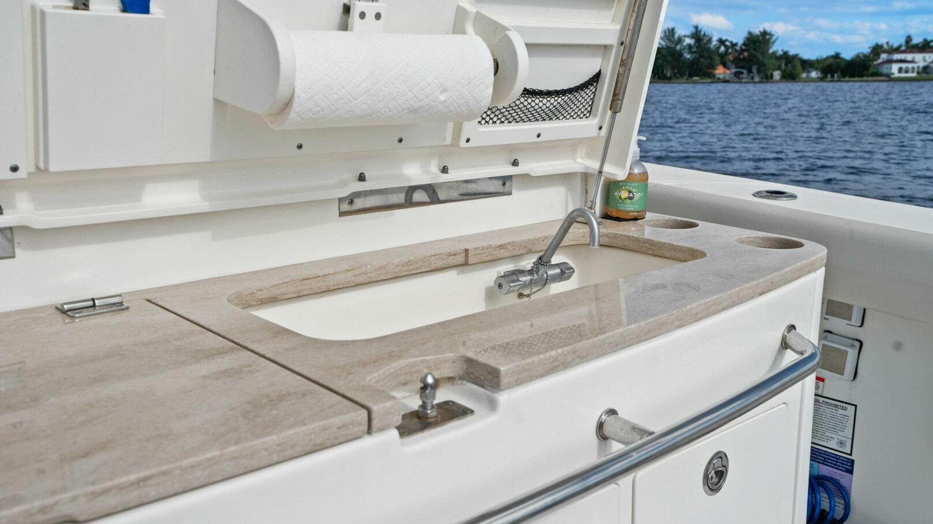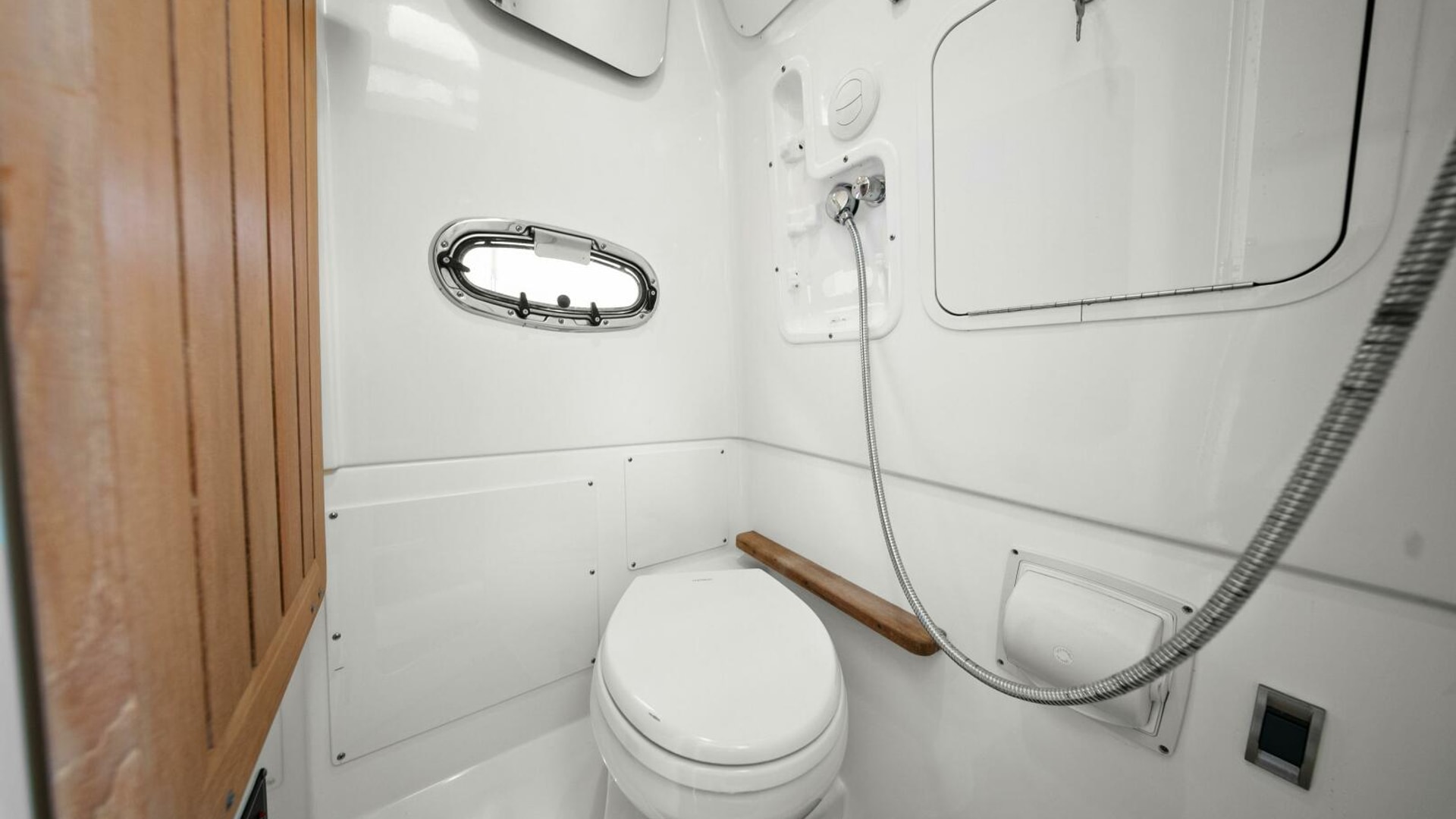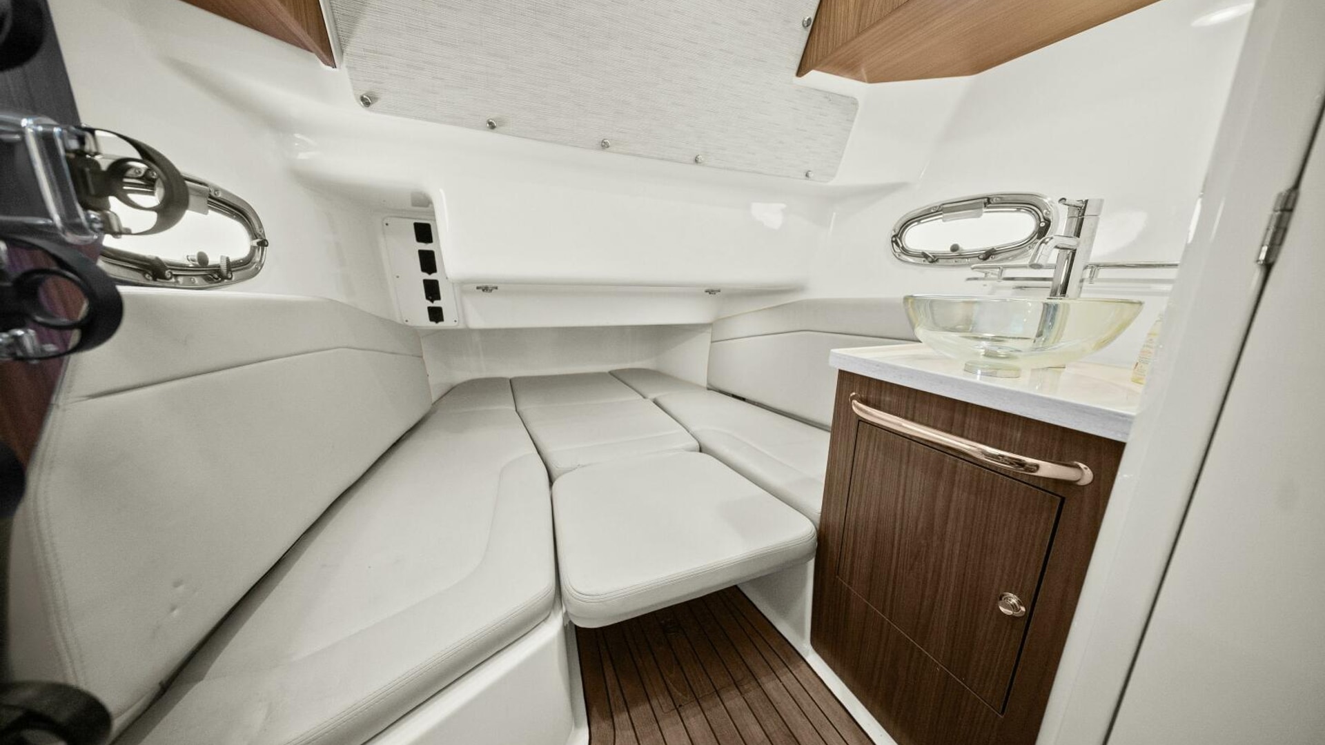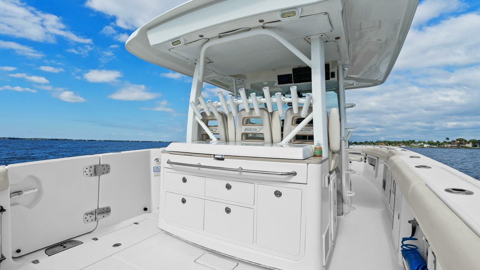 Below deck, the cabin offers impressive amenities for overnight stays, including a convertible berth, rod storage, vanity, and a private shower stall with head.